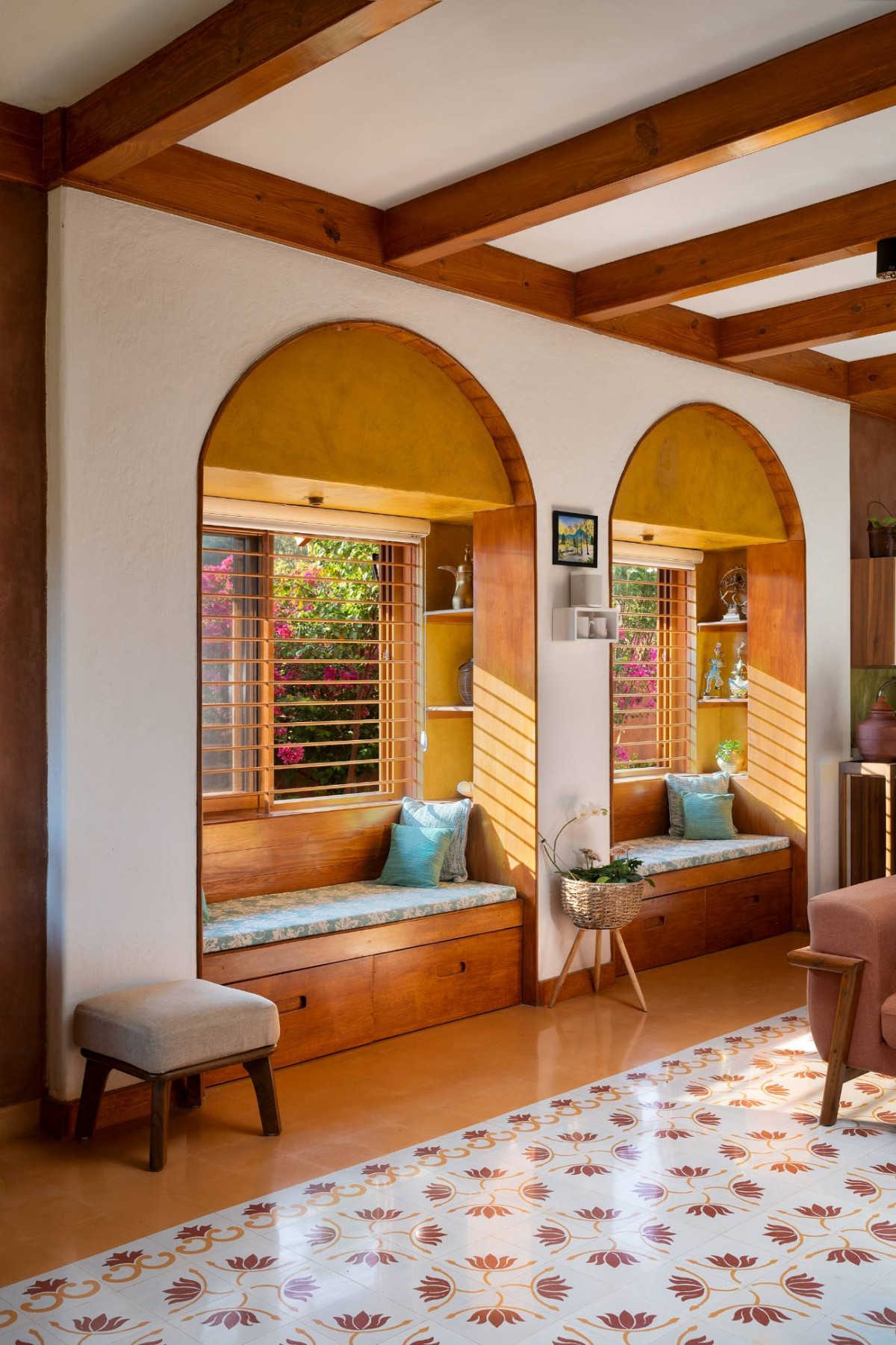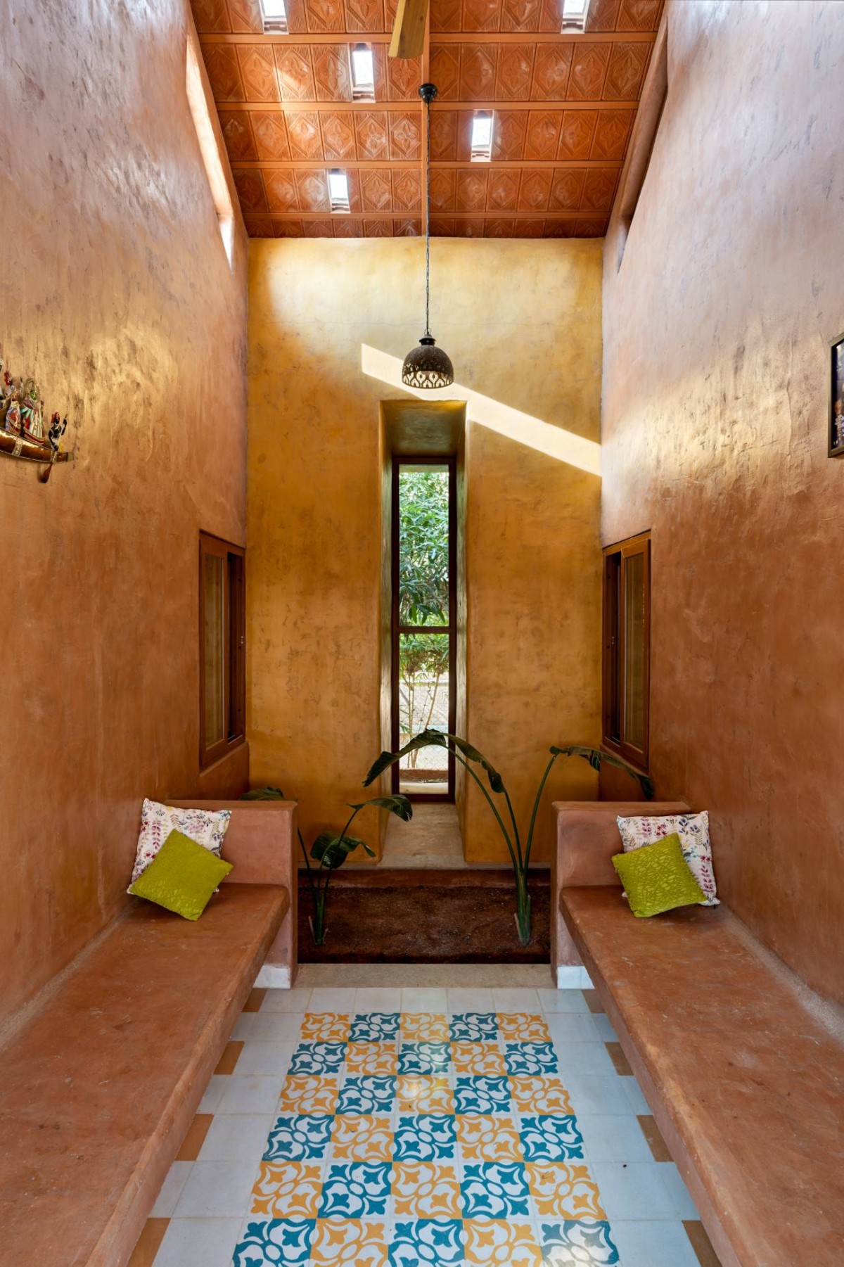 The East stretch of the courtyard holds a water body or ‘kund‘ designed with mud casted seating around allowing family members and guests to indulge in conversation under open sky in the evenings.