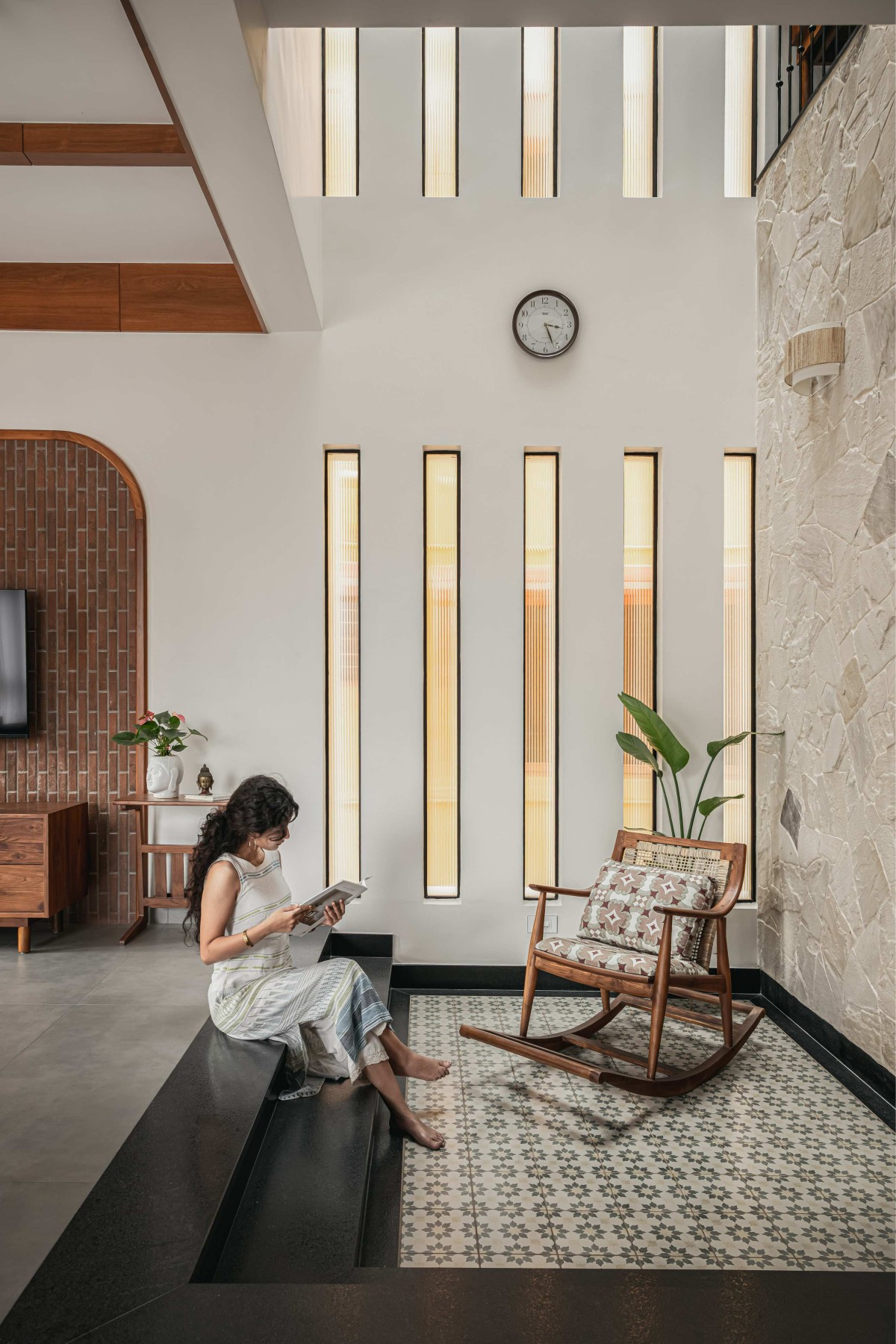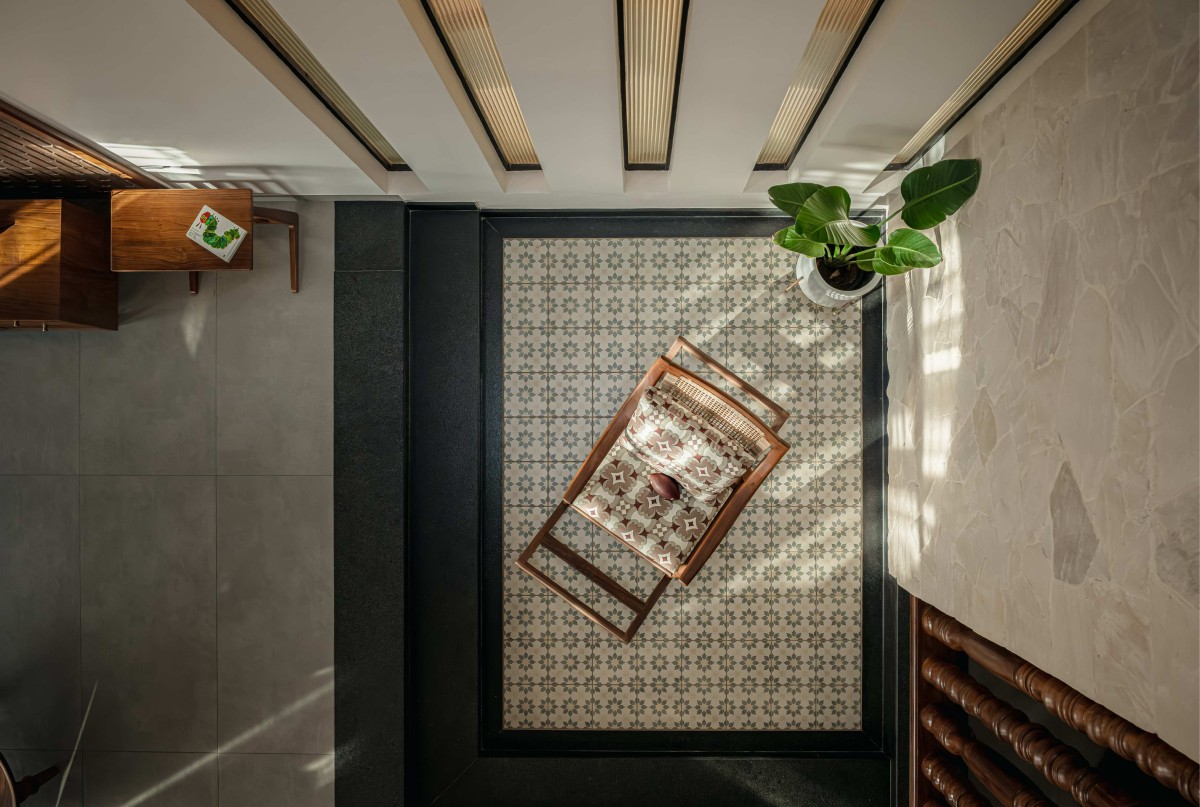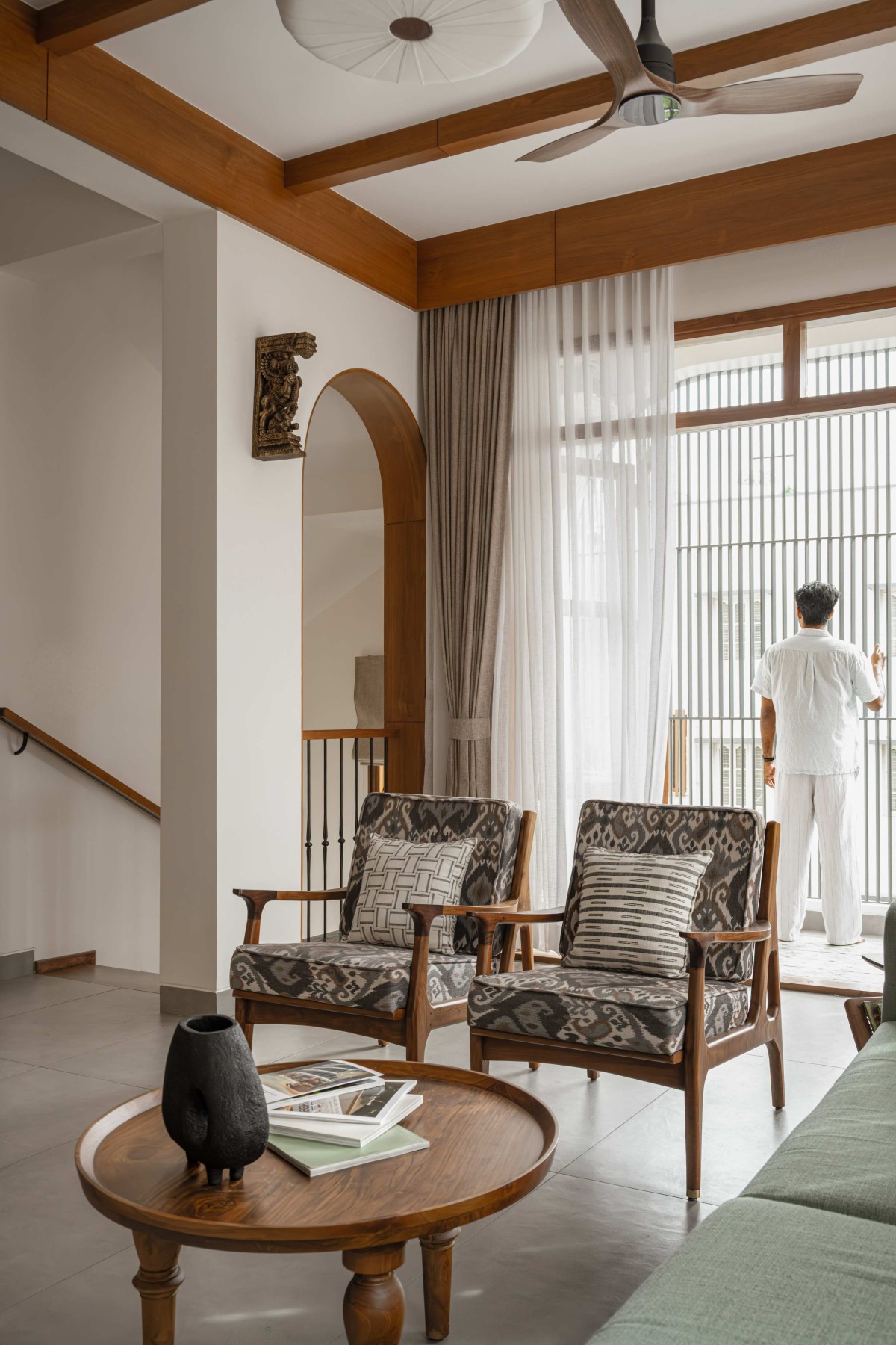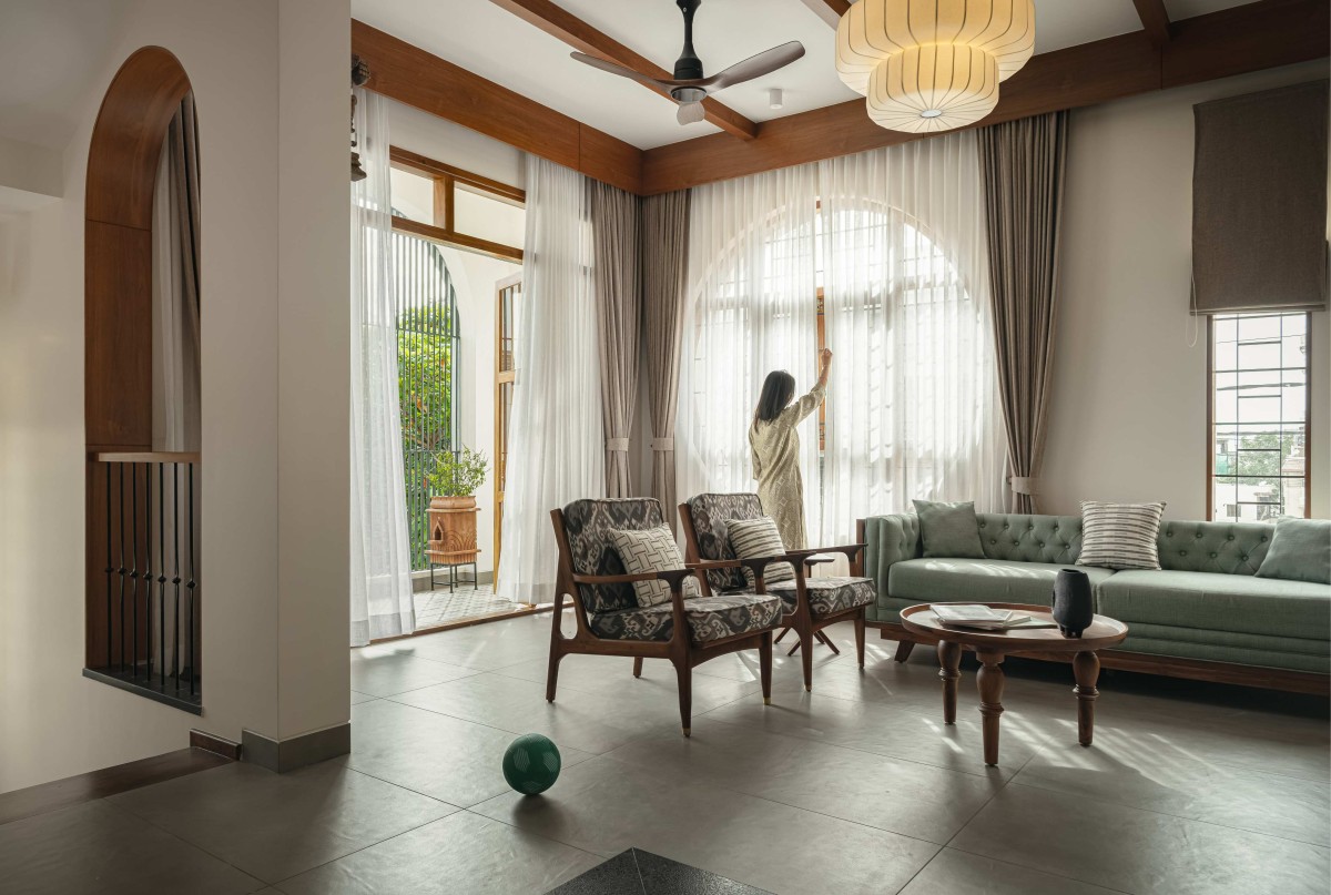 The living area sits alongside this volume and is anchored by an arched brick-clad backdrop that lends weight and warmth. Seating is arranged to allow quiet conversation, reading, or simply sitting with the courtyard in view. A small grilled balcony extends from the living space, finished in patterned flooring that continues the interior language. It is a space often used alone rather than in company, a quiet nook to begin the morning or let the evening slow.