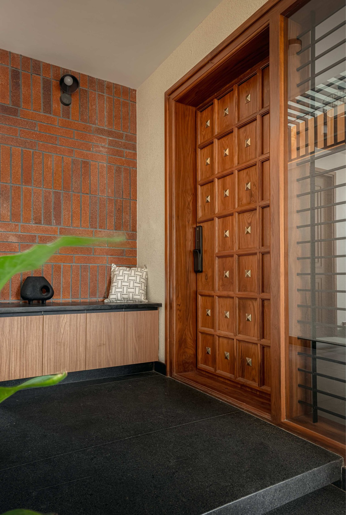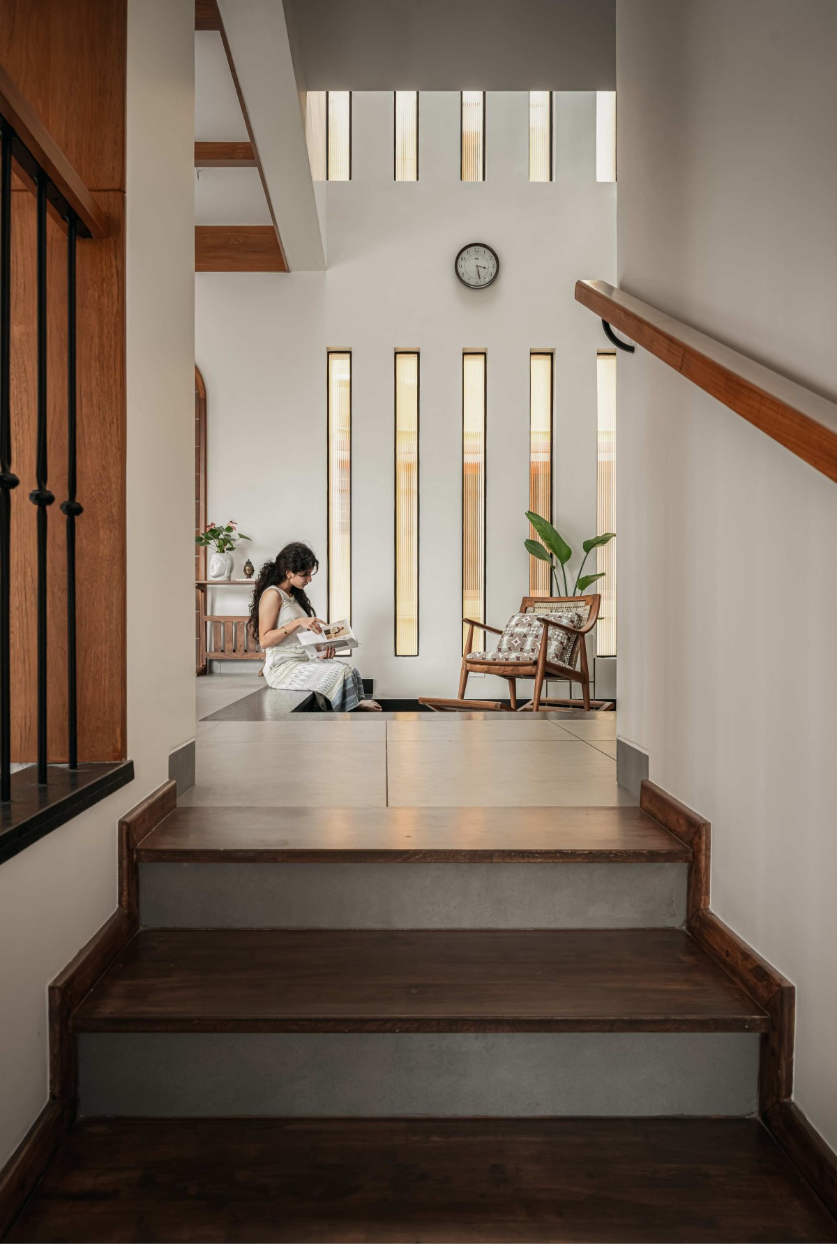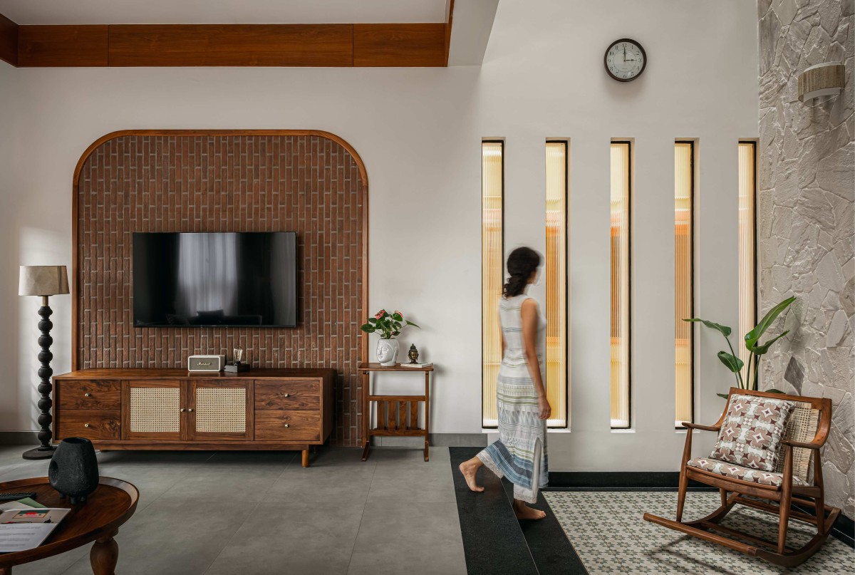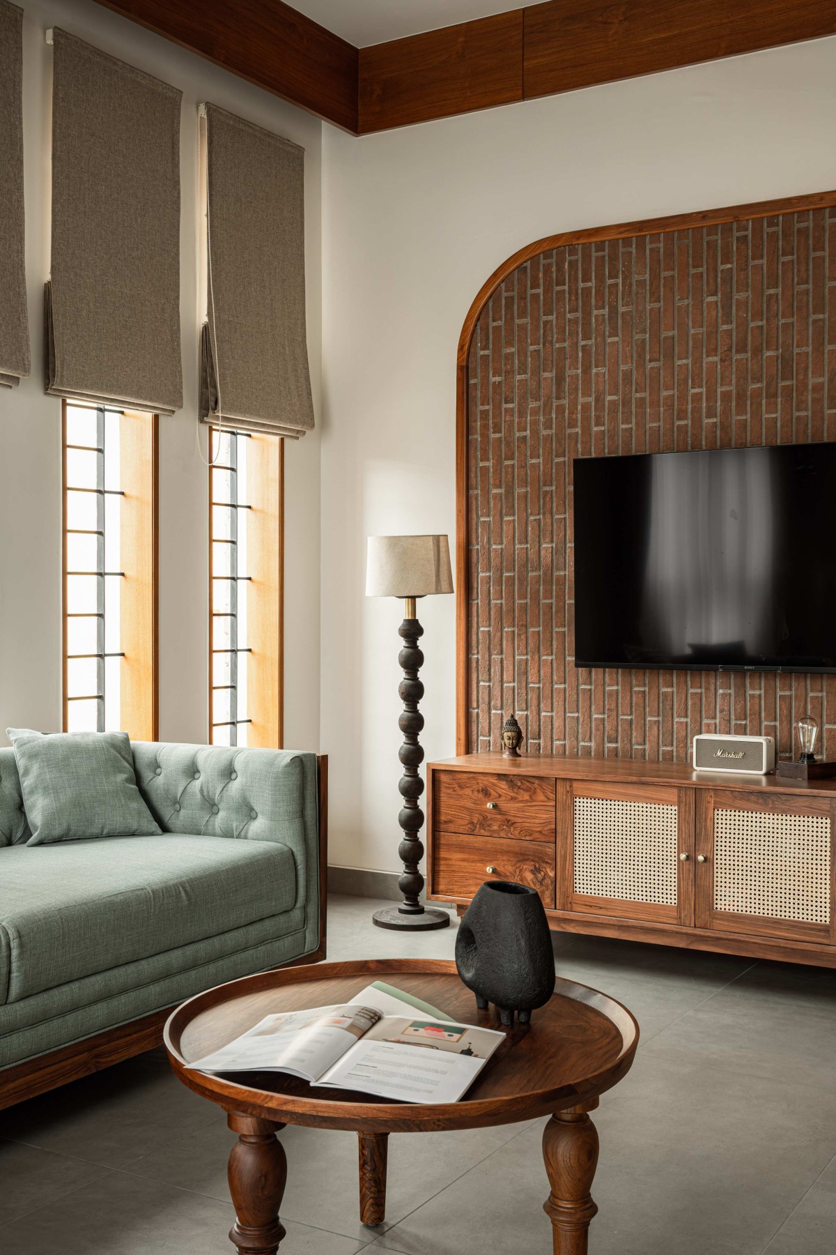 The living area sits alongside this volume and is anchored by an arched brick-clad backdrop that lends weight and warmth. Seating is arranged to allow quiet conversation, reading, or simply sitting with the courtyard in view. A small grilled balcony extends from the living space, finished in patterned flooring that continues the interior language. It is a space often used alone rather than in company, a quiet nook to begin the morning or let the evening slow.