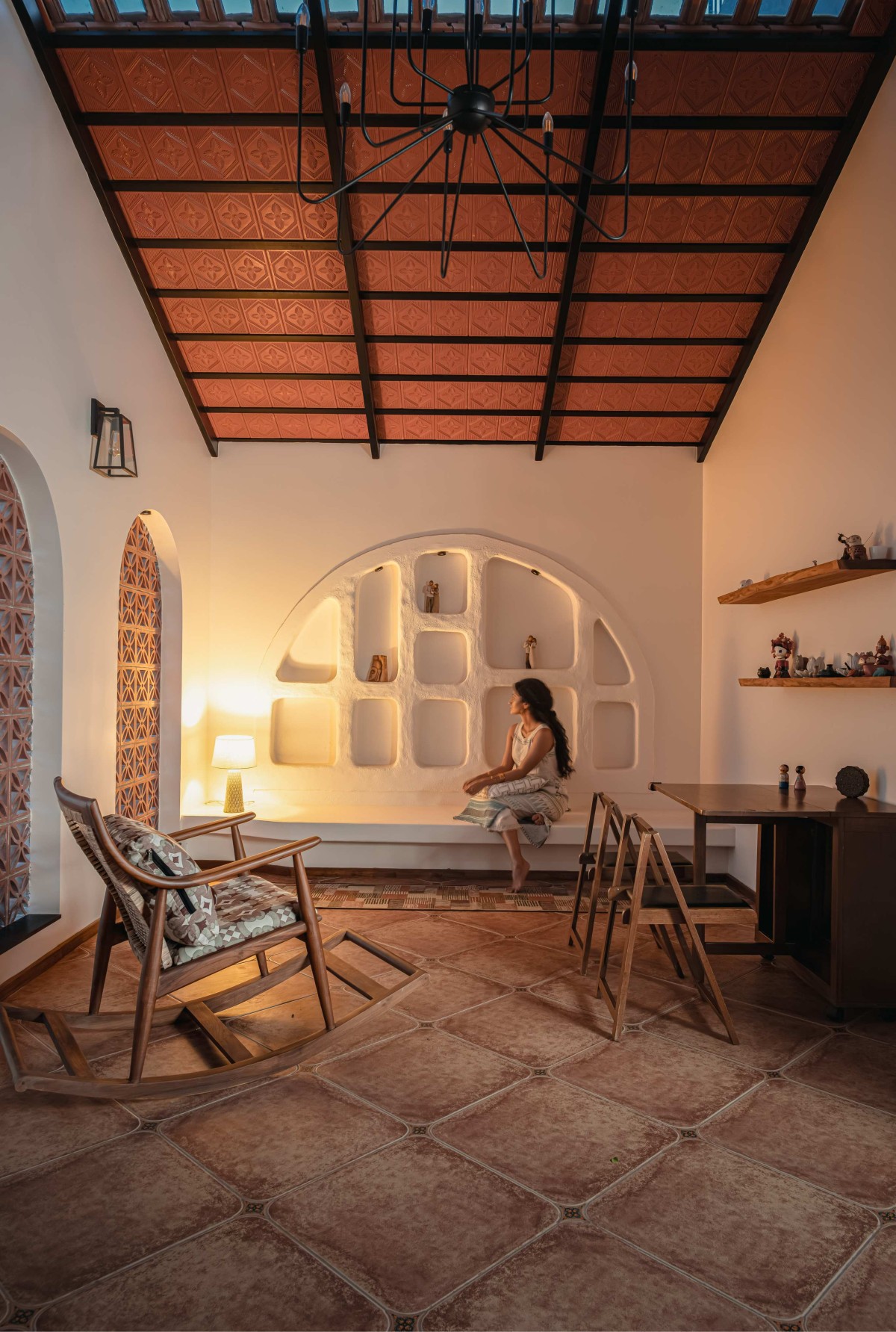 The terrace completes the home as a place of slowing down. Held under a double-sided Mangalore tile roof, the space is grounded with rustic Spanish flooring and enclosed by arched jaali openings that allow breeze and softened daylight to move through. The atmosphere here is quiet and unhurried, with light shifting throughout the day and settling into a warm stillness by evening.