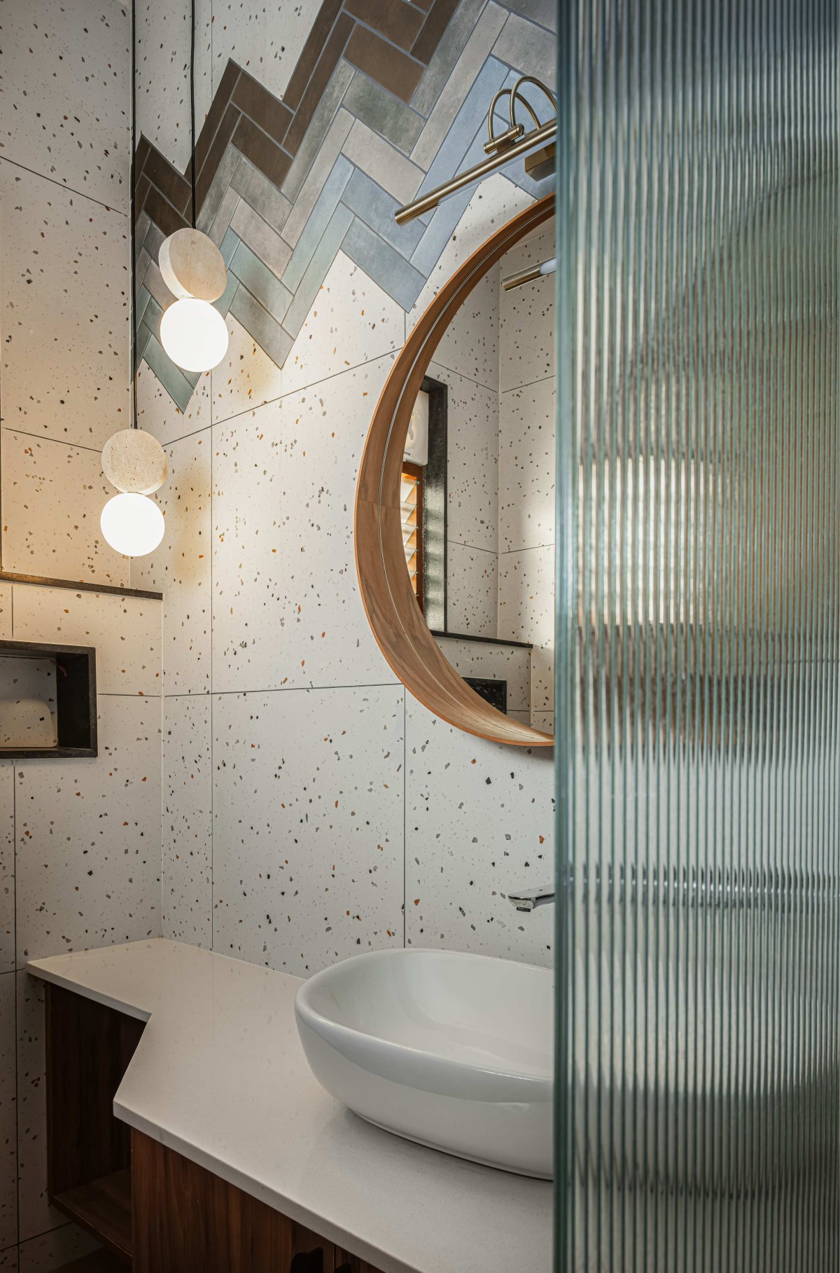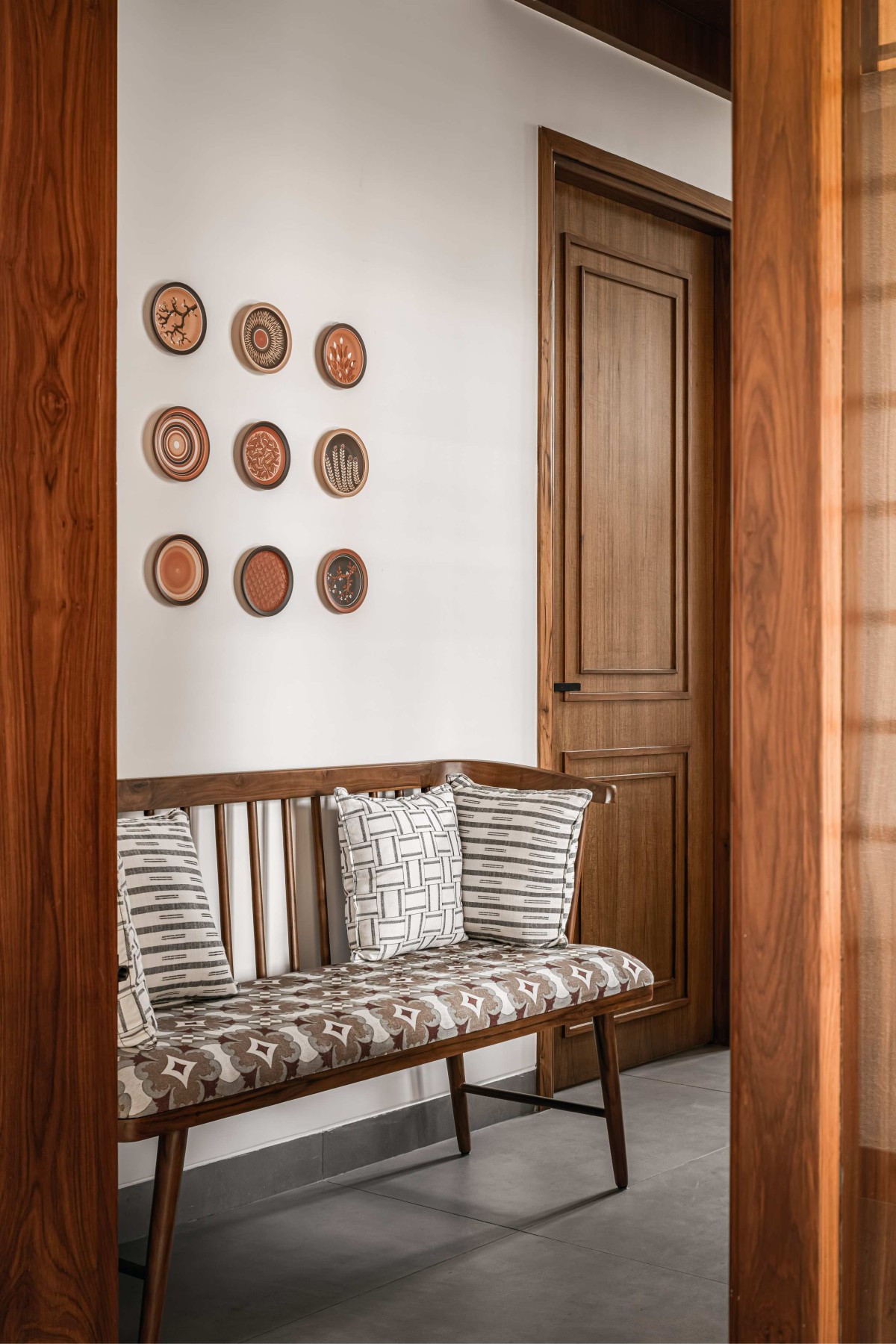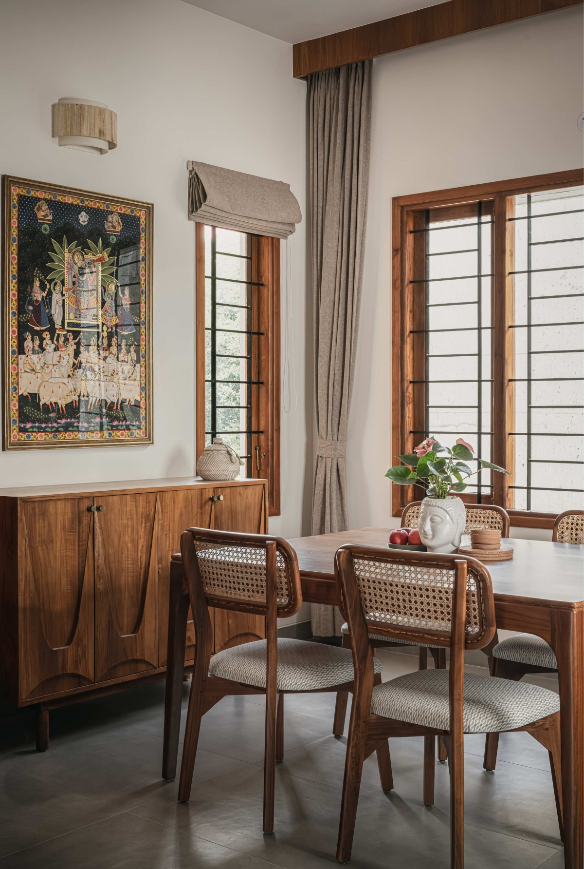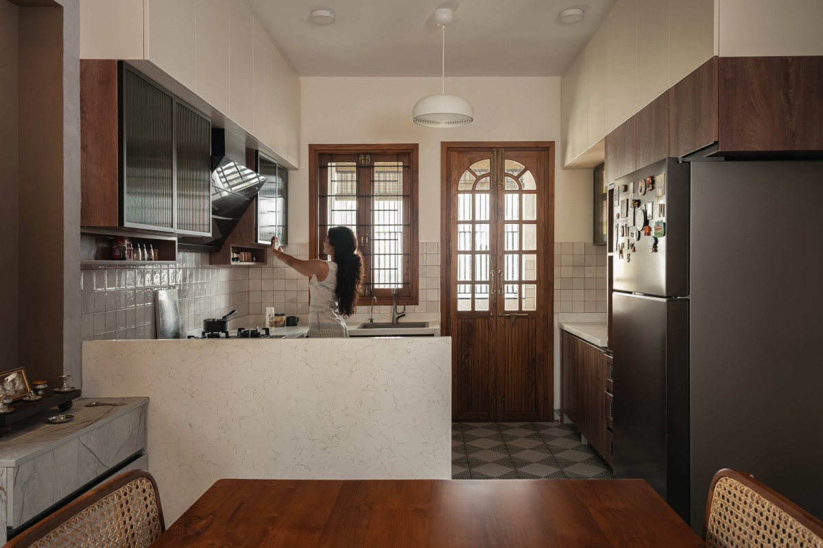 The living area exposed to the road is a long wall and treated with a large circular window which is the highlight element of the façade and slit windows.The dining area remains modest and composed, accompanied by a solid wood console and a framed Pichwai artwork that introduces memory and familiarity. The kitchen continues the same soft clarity with warm-toned shutters, a beige quartz countertop and a simple dado. A geometric patterned floor subtly signals the shift into the kitchen without breaking spatial continuity. Movement across these spaces is gentle and unforced.