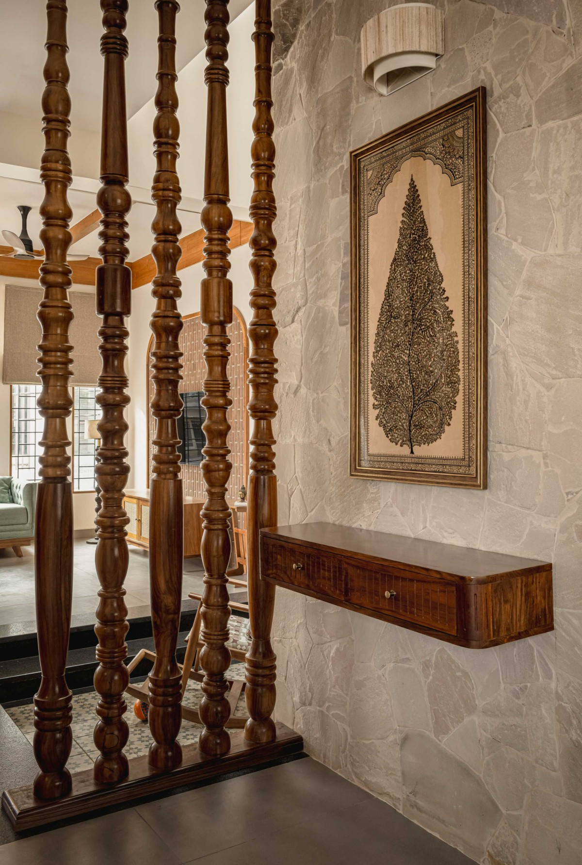 Detailed shot of wooden pillars of Shambhavi Residence by Design Matters Architect