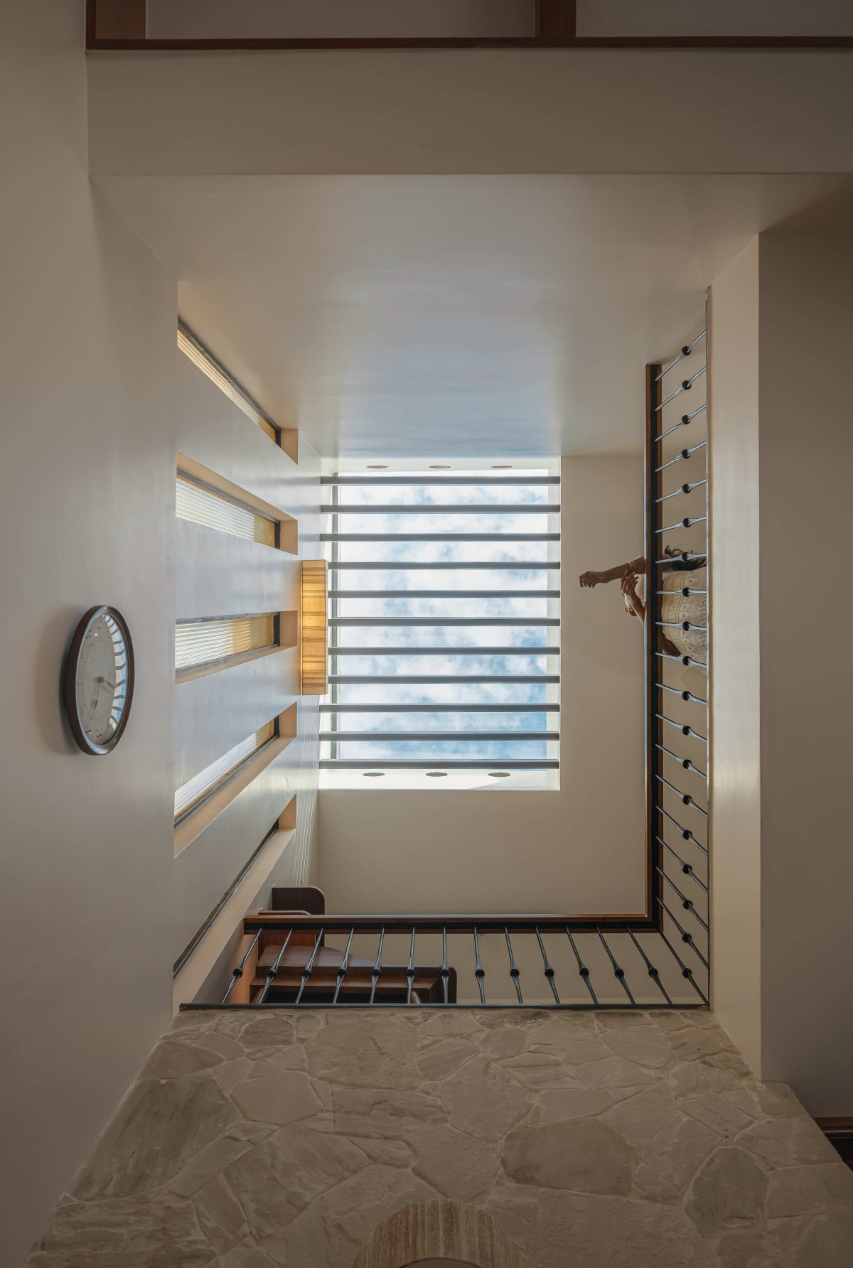 Natural light filters through slender frosted slit windows of the external courtyard wall and the skylight above and rests softly on the beige stone-clad wall. The light arrives slowly, shifts gradually, and settles evenly through the day, giving the living spaces a gentle rhythm. The courtyard this becomes the focal element as well as a space for pause. It is where the home breathes.