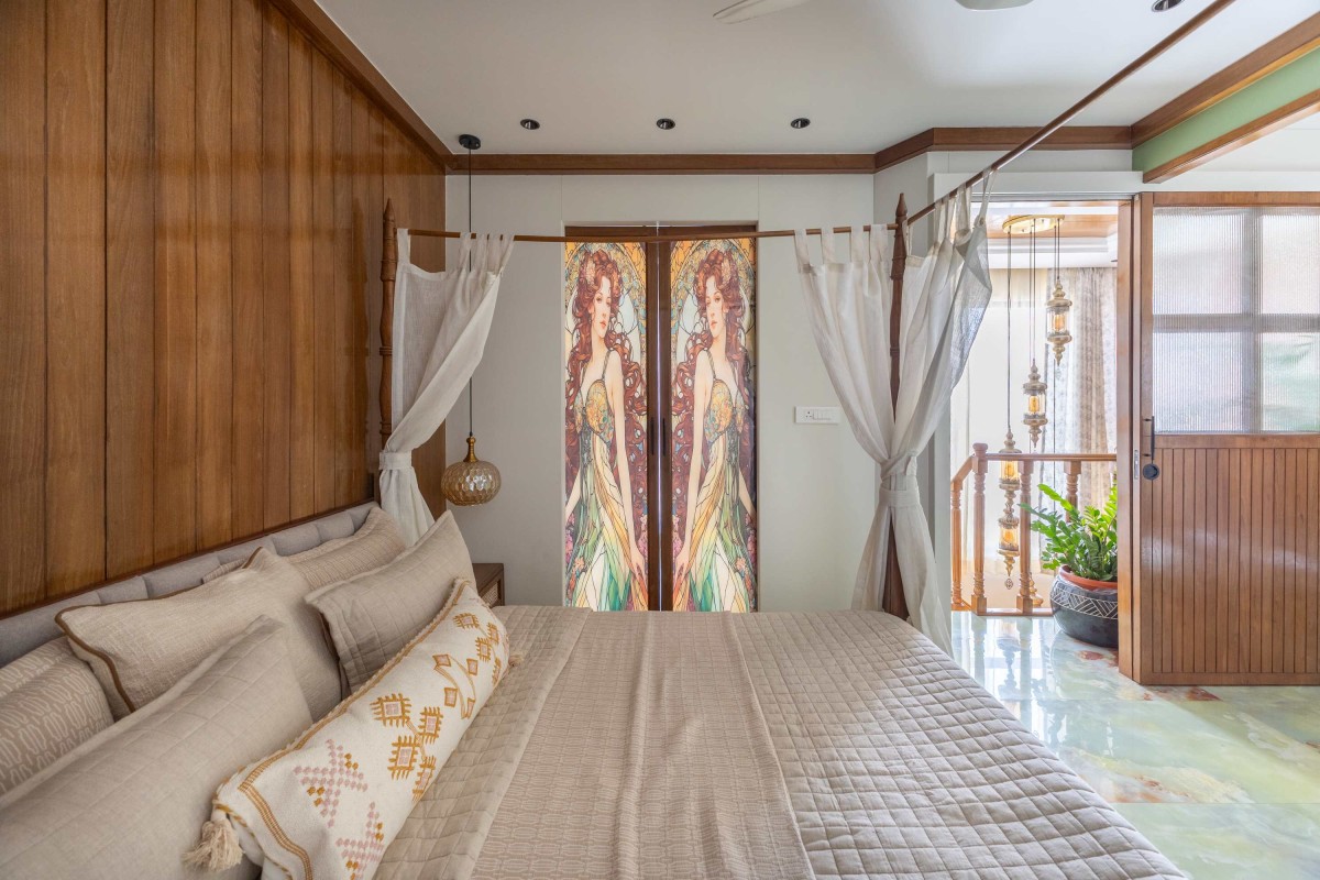 The master bedroom at Shilpagriha is a seamless blend of warmth, craftsmanship, and understated elegance. Wrapped in rich wooden paneling, the space exudes a cozy yet sophisticated character. The custom four-poster bed, detailed with sheer flowing drapes, becomes the focal point—adding a soft, romantic charm while maintaining a grounded, earthy aesthetic.