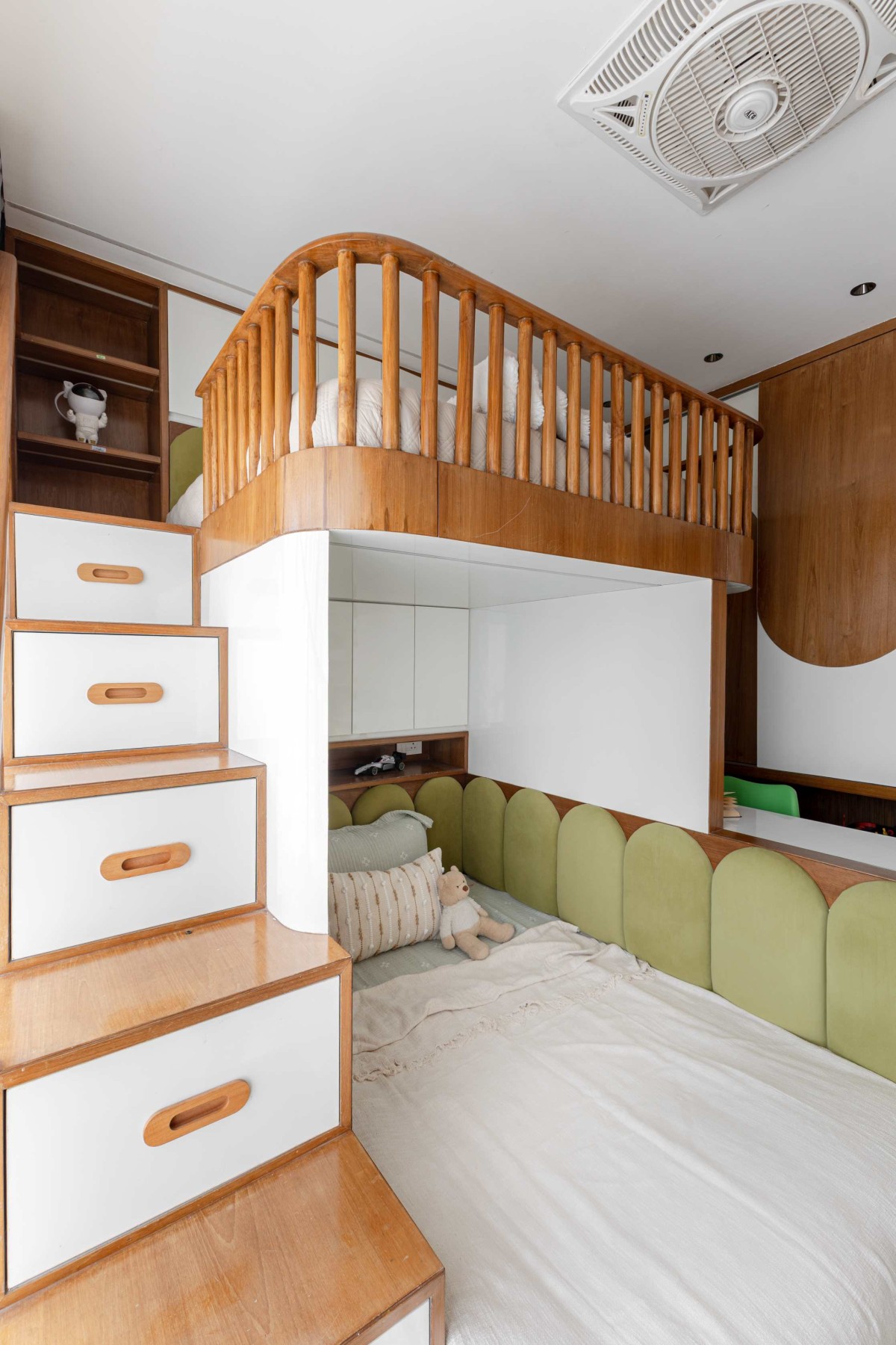 The lower bed is tucked into a cozy nook, highlighted by a sage green scalloped upholstered backrest that introduces texture and a gentle pop of color. Warm wood finishes paired with crisp white cabinetry maintain a calm, organized atmosphere, while built-in shelving ensures efficient storage and display.