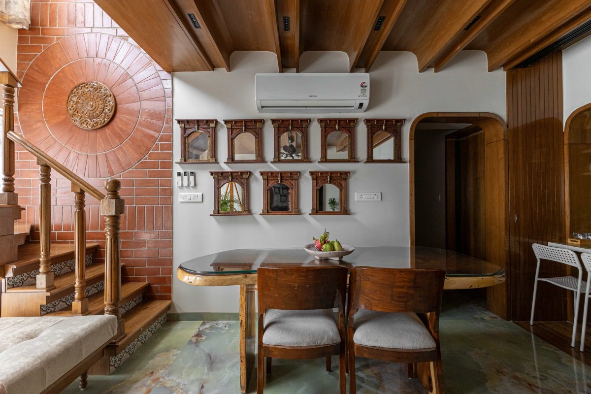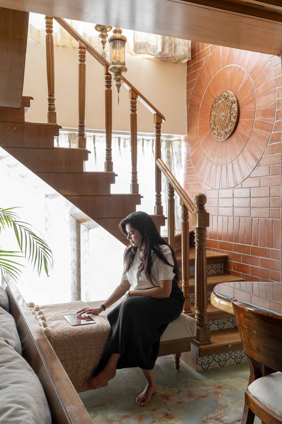 The staircase at Shilpagriha is designed as a striking vertical feature that celebrates craftsmanship and material warmth. Solid wood railings with intricately turned balusters lend a timeless character, while the terracotta brick-clad accent wall with a radial medallion detail creates a bold architectural backdrop.