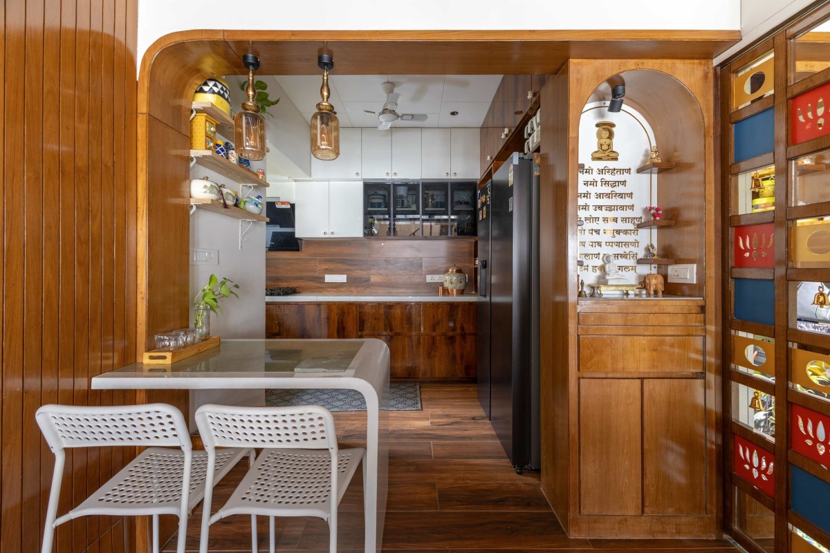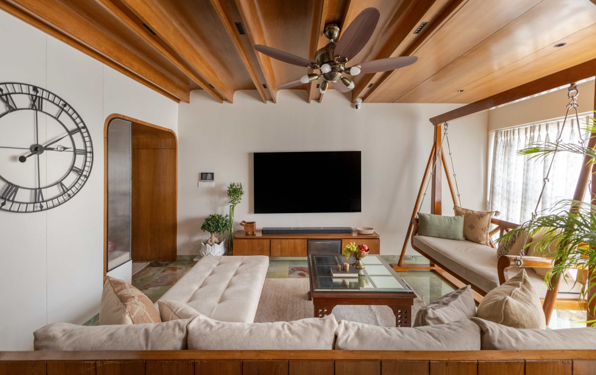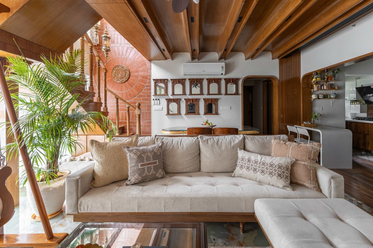 Natural wood forms the primary architectural language, establishing warmth, tactile richness, and continuity across spaces. Traditional elements such as arched openings, carved details, handcrafted features, and mandala-inspired motifs are thoughtfully integrated in a subtle and elegant manner.
