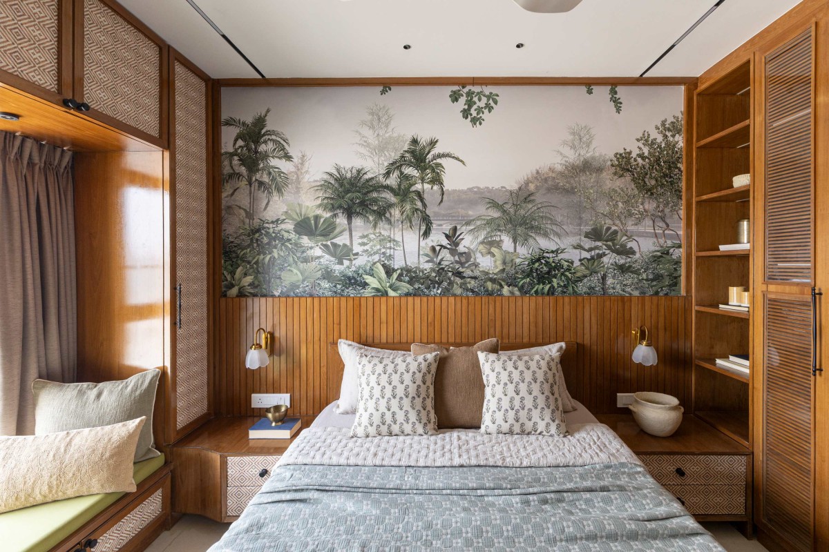 A bedroom where warmth meets craftsmanship. Teak-toned paneling and woven cane shutters celebrate traditional detailing, while the tropical mural softly extends the space, creating depth and serenity. Layered linens, subtle brass accents, and seamlessly integrated storage balance aesthetics with functionality — shaping a retreat that feels timeless, grounded, and quietly luxurious.