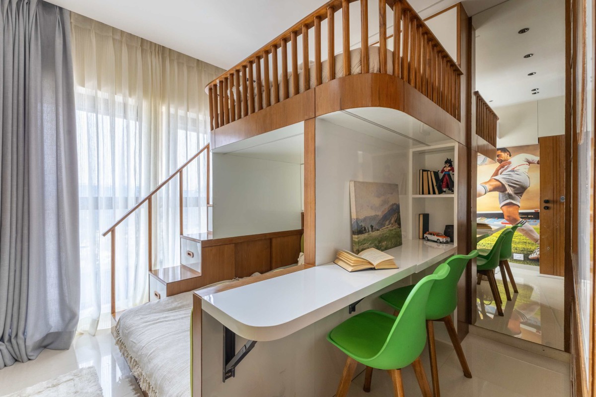 The kids' bedroom at Shilpagriha is designed as a balance of functionality and playful warmth. A custom-crafted wooden bunk bed with soft curves and rounded spindle railings becomes the focal element, creating a sense of safety and visual lightness. The staircase is thoughtfully designed with integrated storage drawers, maximizing utility without compromising aesthetics.