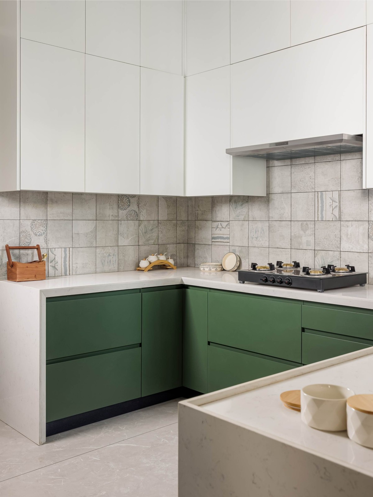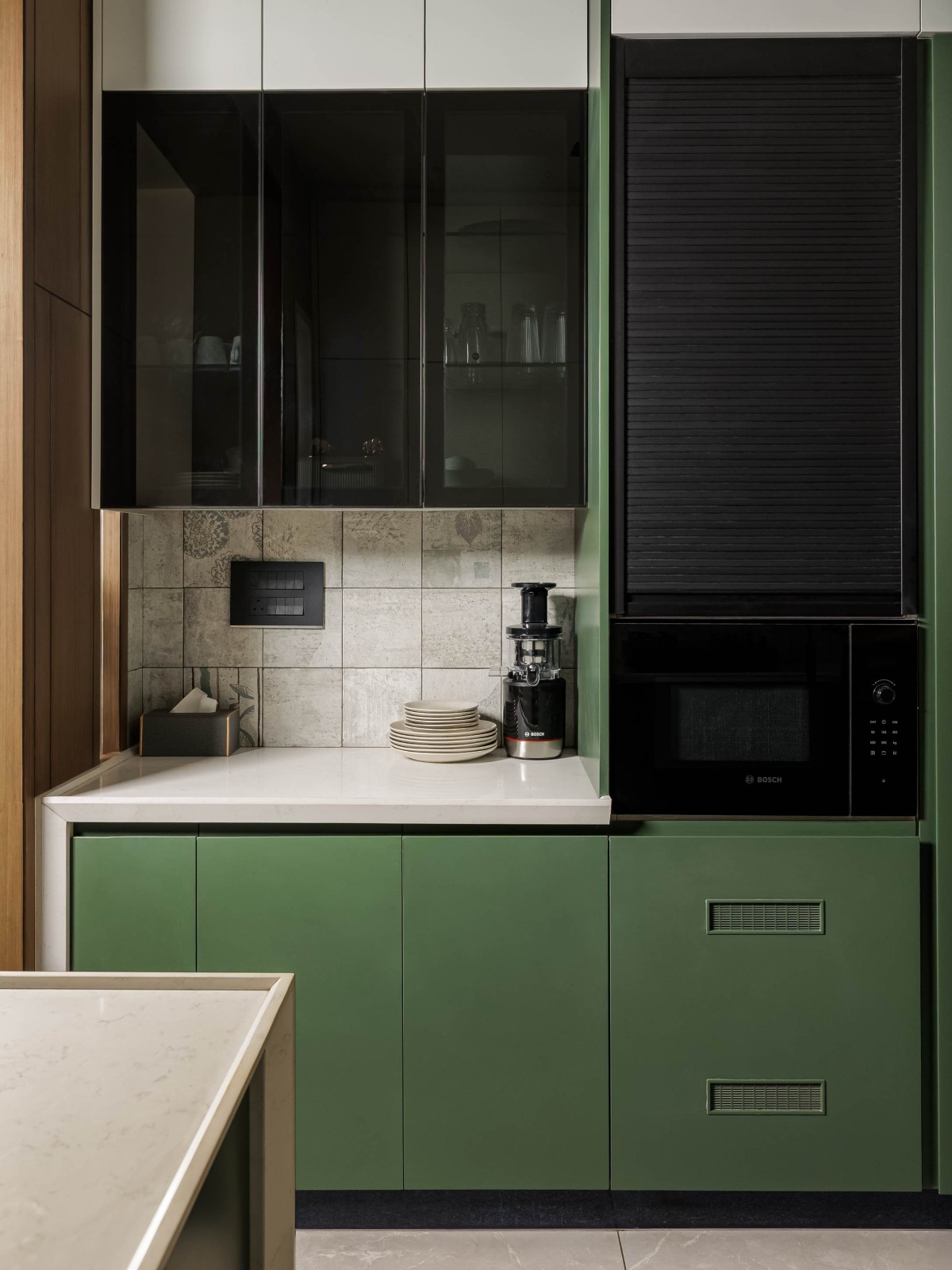 The kitchen introduces a subtle shift in palette. At the request of the homeowner, sage green cabinetry is paired with white cabinets and quartz countertops. Bright accent tiles form the backsplash, adding visual lift without overwhelming the restrained aesthetic.