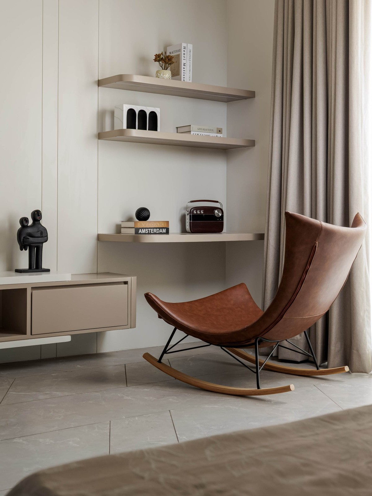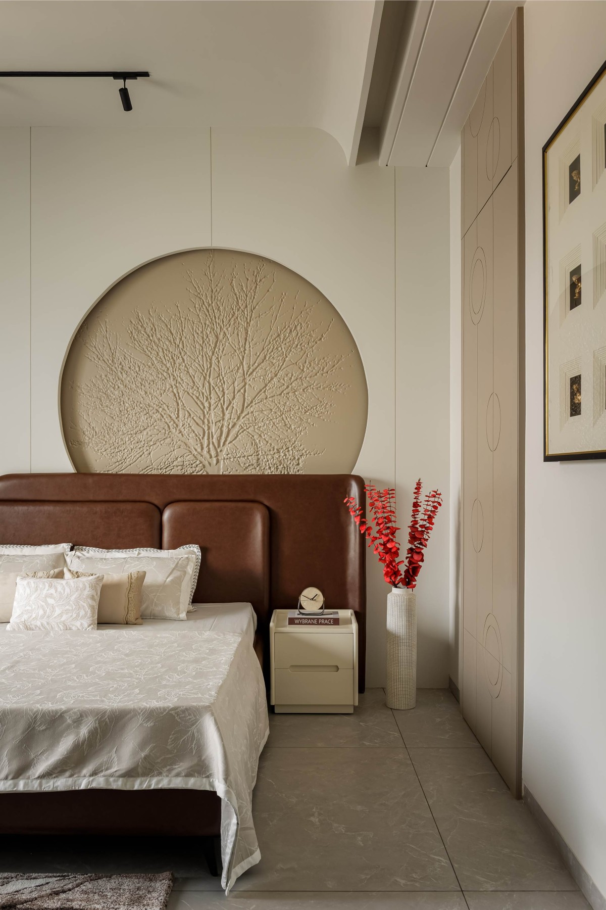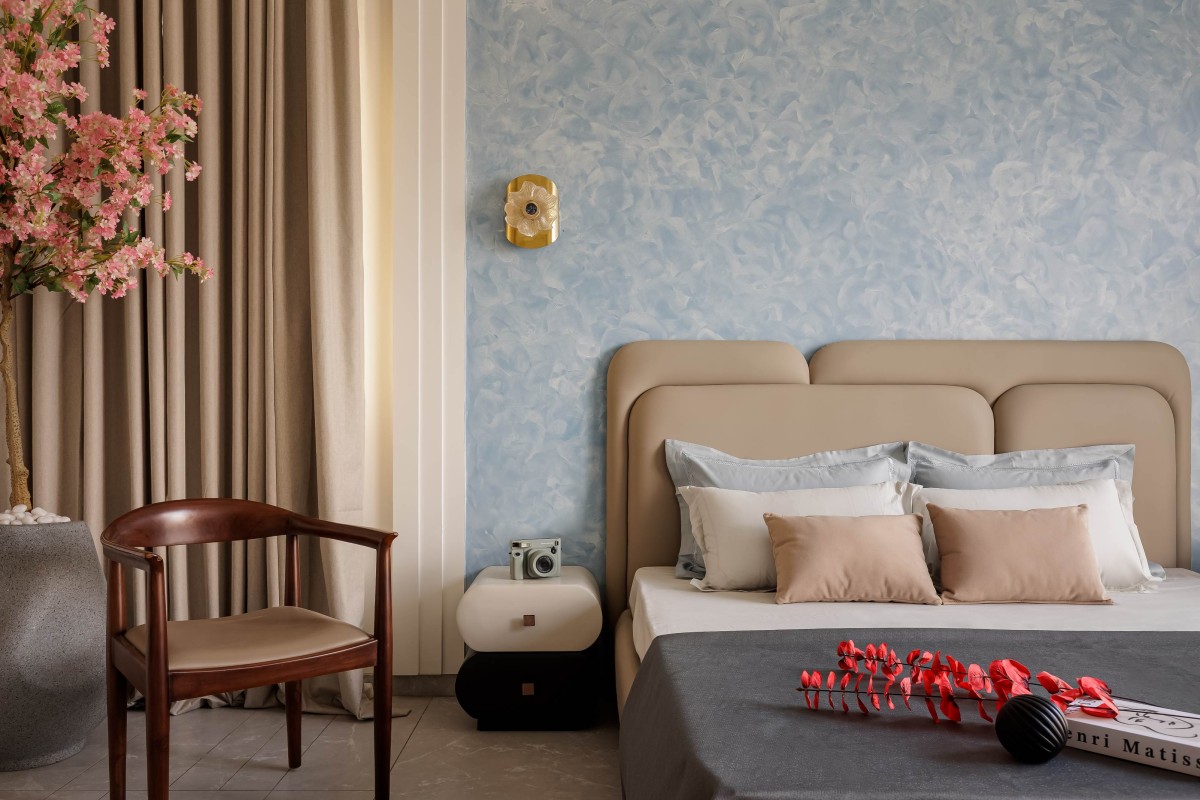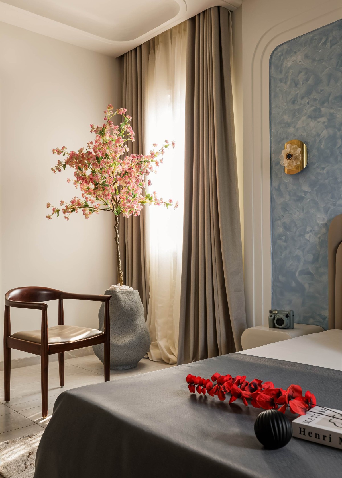 The private rooms reflect individual personalities. The master suite emphasizes calm with clean lines, softened by gentle curves and anchored by a teal four-poster bed. A reading nook by the window, accented with bohemian artwork, provides a peaceful retreat. The son’s room features a bold 3D tree mural within a circular inset and a concealed door leading to a walk-in wardrobe with chevron-patterned rattan and fluted glass shutters. A study nook with floating shelves and a rocking chair adds functionality. The daughter’s room adopts softer tones with stucco-textured paint, floral sconces, and delicate décor, while the guest bedroom introduces cooler greys balanced by wooden artworks.