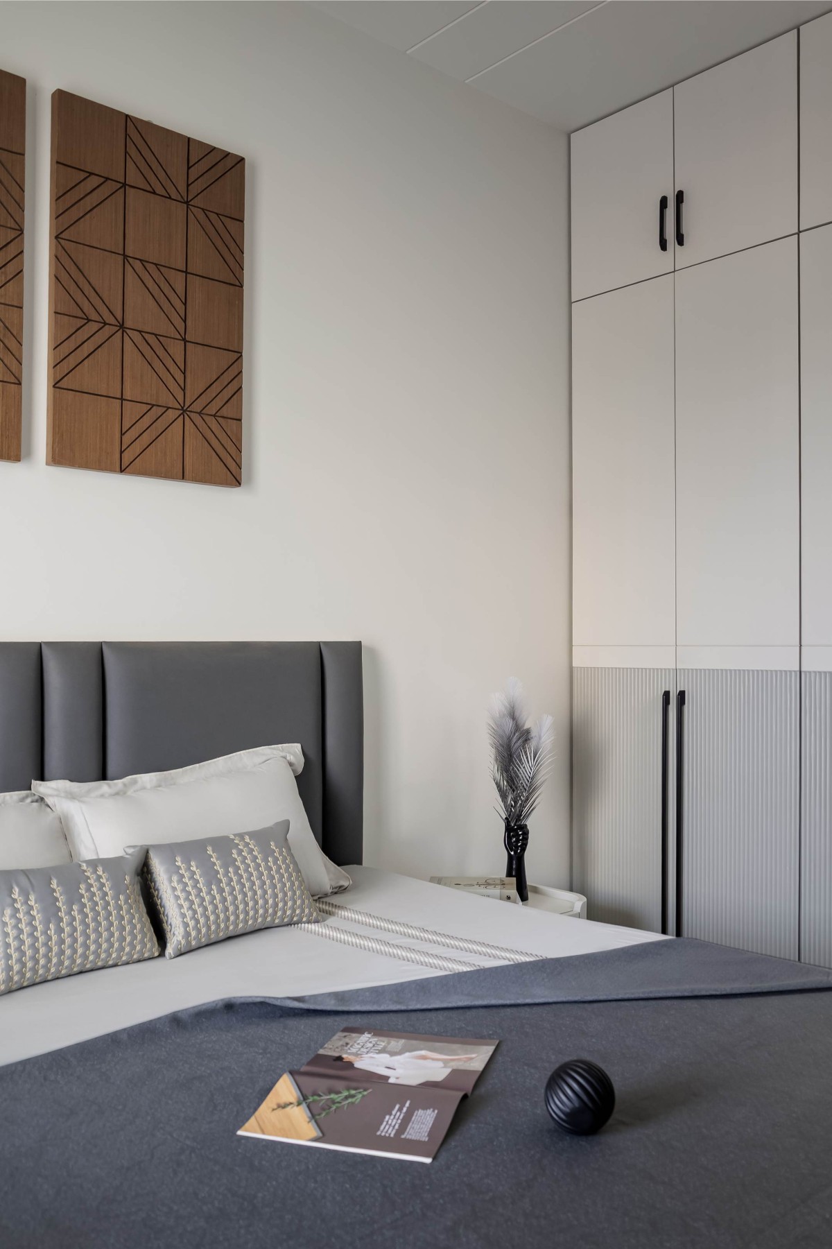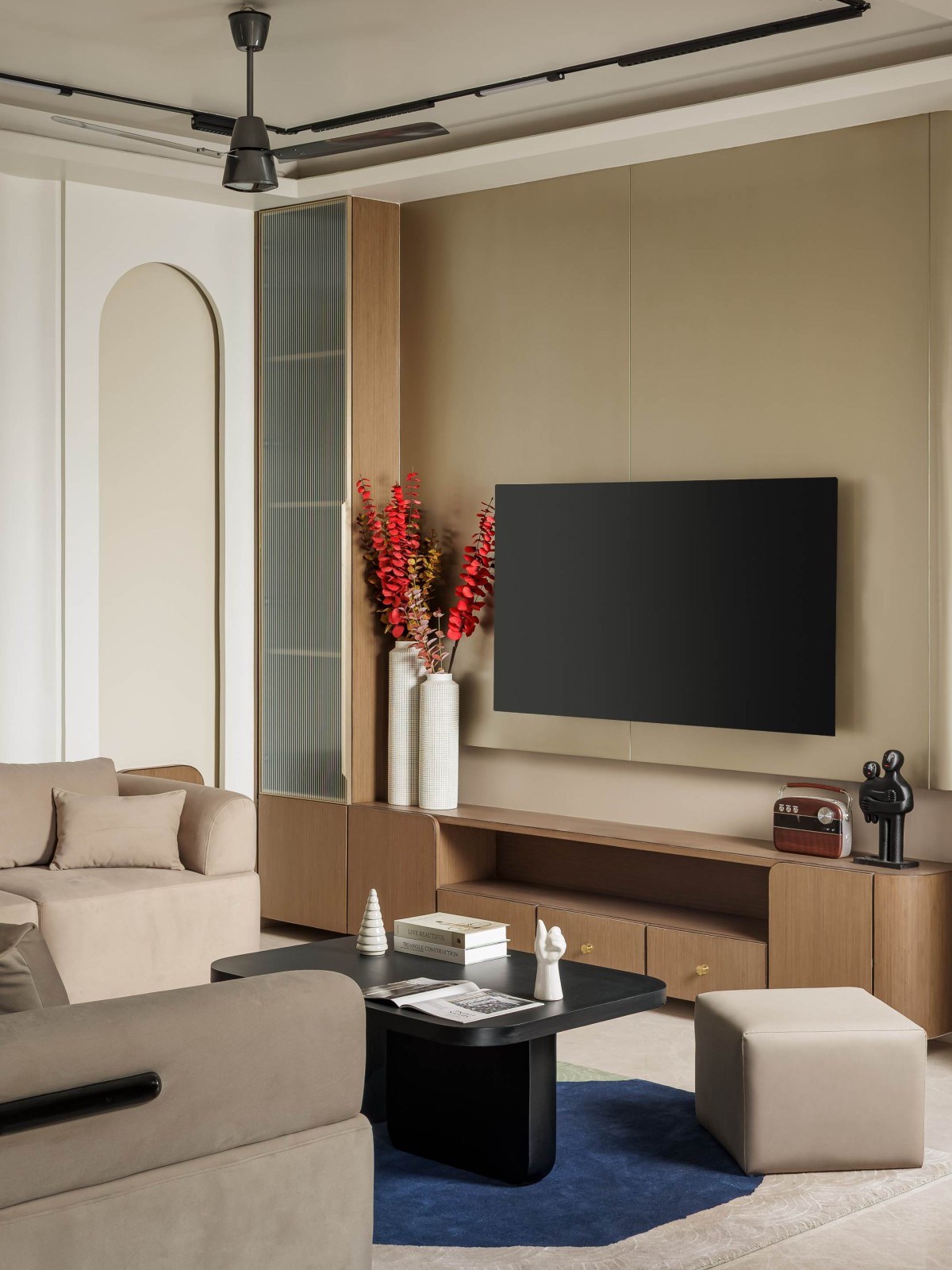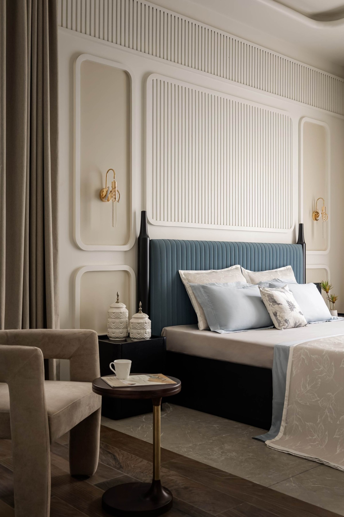The private rooms reflect individual personalities. The master suite emphasizes calm with clean lines, softened by gentle curves and anchored by a teal four-poster bed. A reading nook by the window, accented with bohemian artwork, provides a peaceful retreat. The son’s room features a bold 3D tree mural within a circular inset and a concealed door leading to a walk-in wardrobe with chevron-patterned rattan and fluted glass shutters. A study nook with floating shelves and a rocking chair adds functionality. The daughter’s room adopts softer tones with stucco-textured paint, floral sconces, and delicate décor, while the guest bedroom introduces cooler greys balanced by wooden artworks.