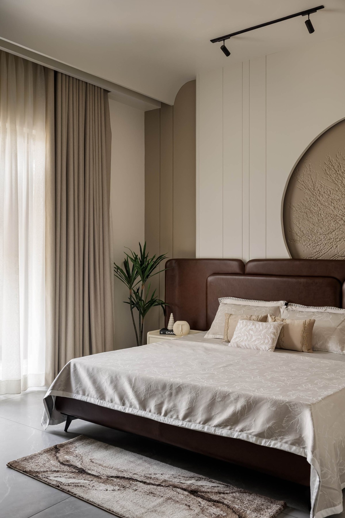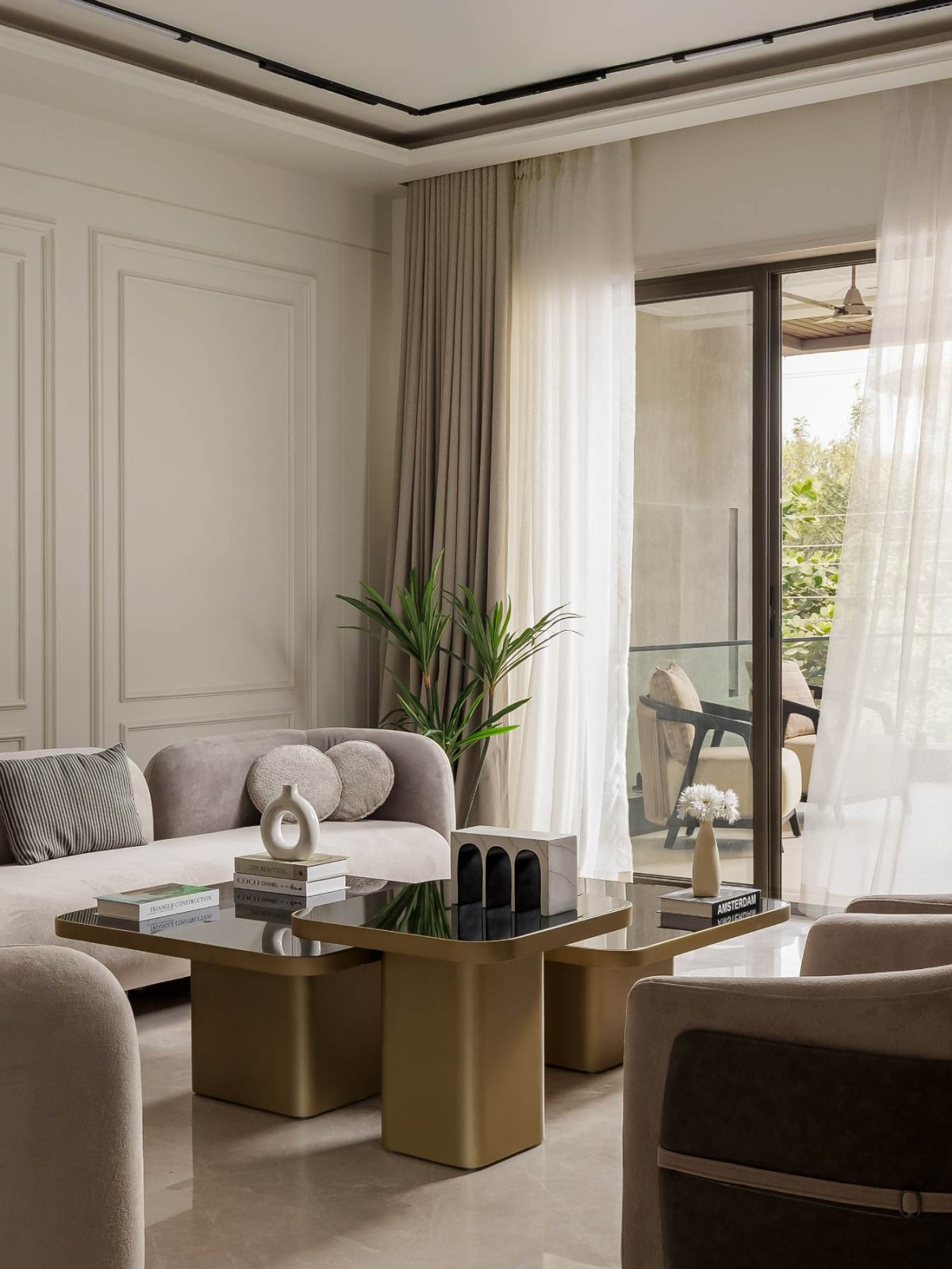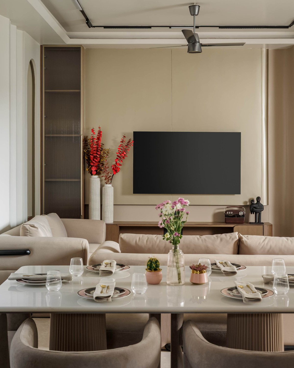 Moving deeper into the house, the communal areas unfold in a soft spectrum of beige, connected by a recurring motif of arches. A sliding partition allows the spaces to be separated when necessary while maintaining a sense of openness. The dining area features a six-seater table with ribbed, tapering legs and an onyx marble top, complemented by brass-finished chairs. Nearby, a cleverly designed crockery unit conceals the electrical board behind veneer panels, blending functionality with design.