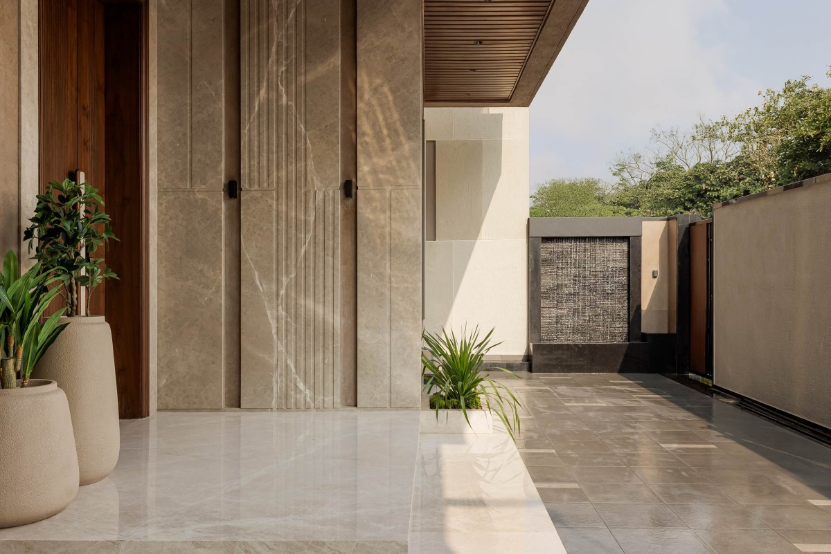 Named Shivarpan, the residence expresses reverence subtly rather than through overt symbolism. The porch sets the tone with Italian marble flooring paired with a teakwood main door accented by a marble-finished handle. Inside, the foyer creates a quiet yet meaningful welcome through a lotus motif embossed on the wall. Rather than serving as mere decoration, the element gently acknowledges the significance of arrival.