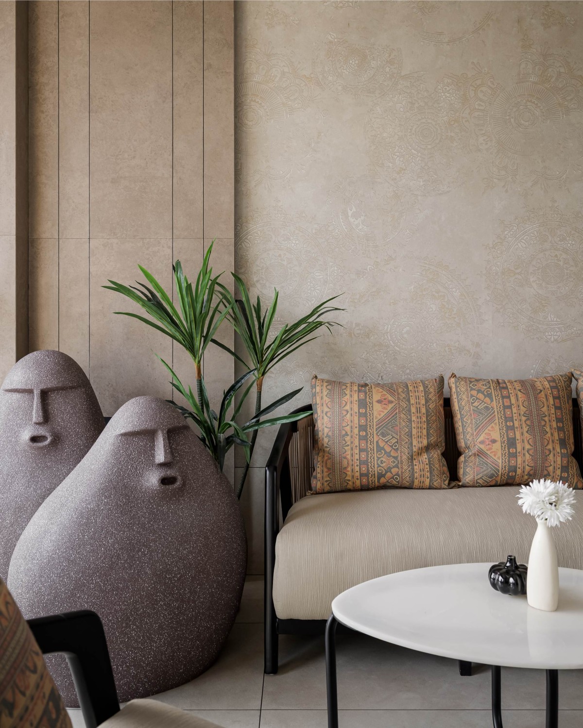 Upstairs, a previously unused hall has been transformed into a family lounge that opens onto the terrace. Wainscoted walls and expansive windows blur the boundary between indoors and outdoors. The terrace itself is designed as a relaxed gathering space with plush seating, ethnic cushion prints, mandala-patterned tiles, and ferrocement artefacts.
