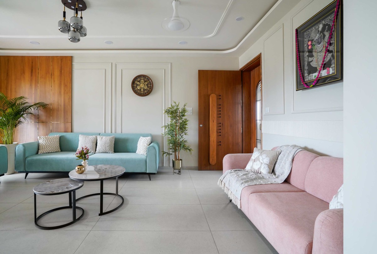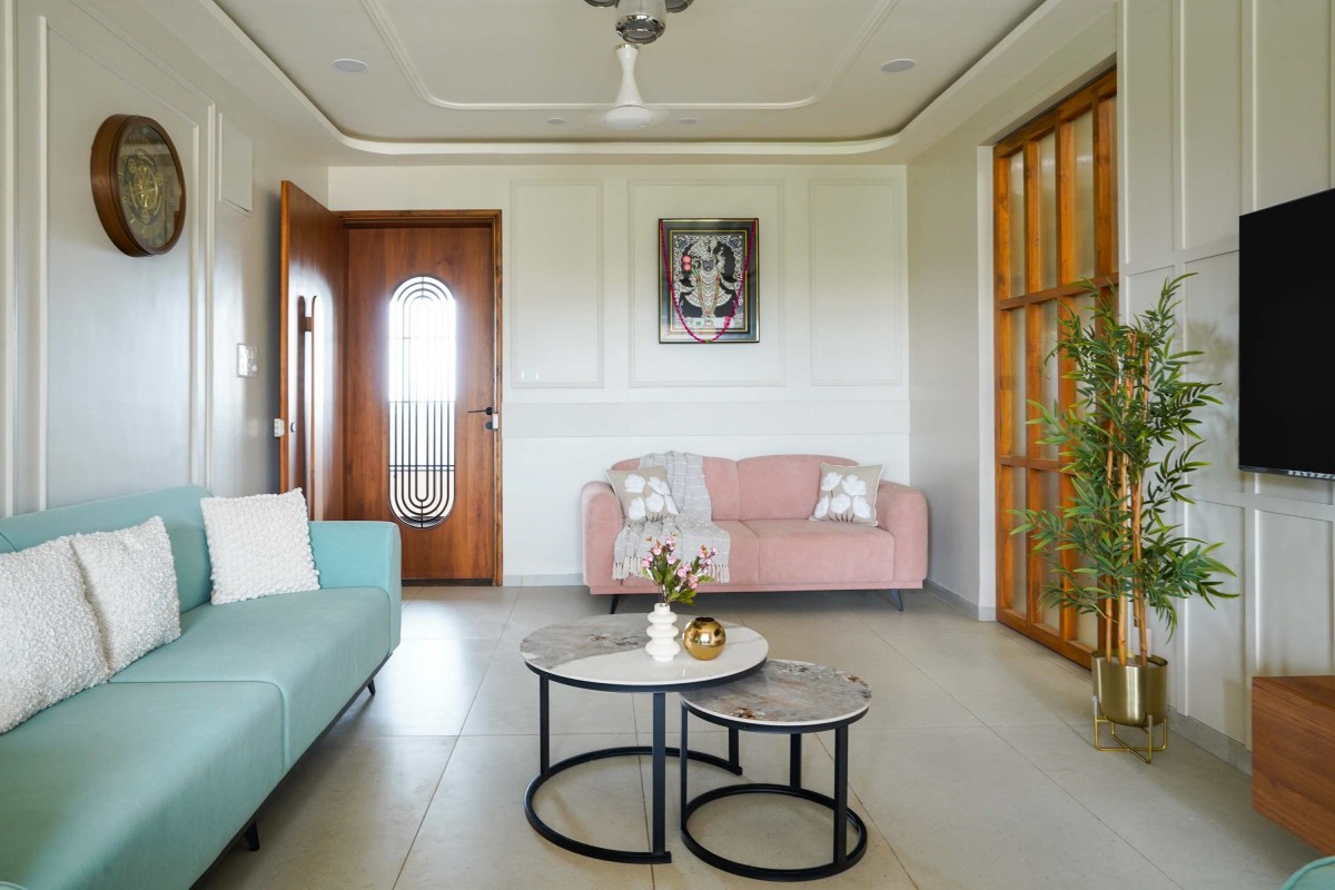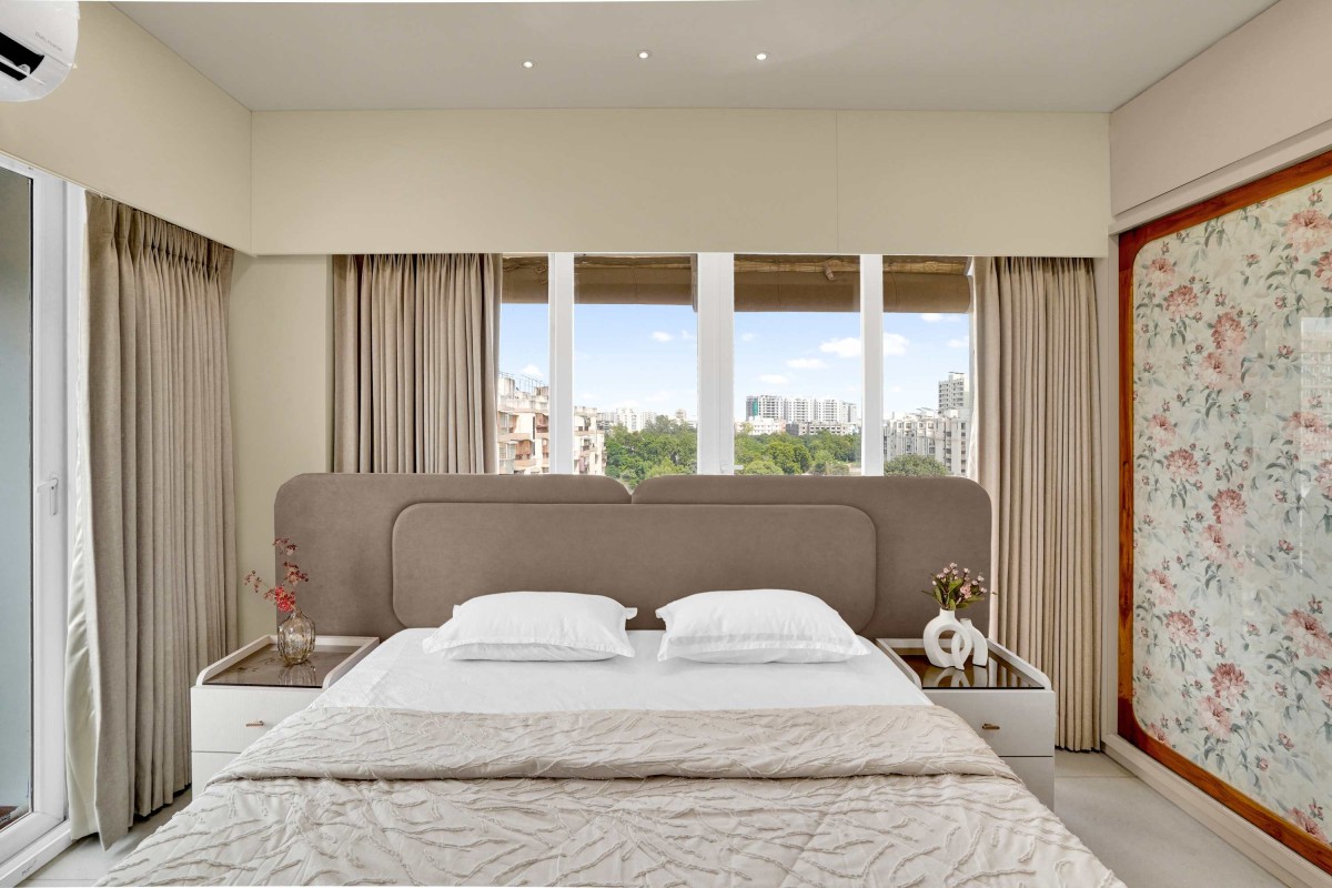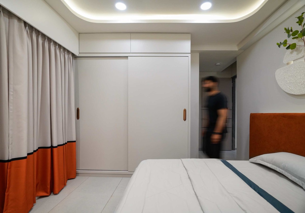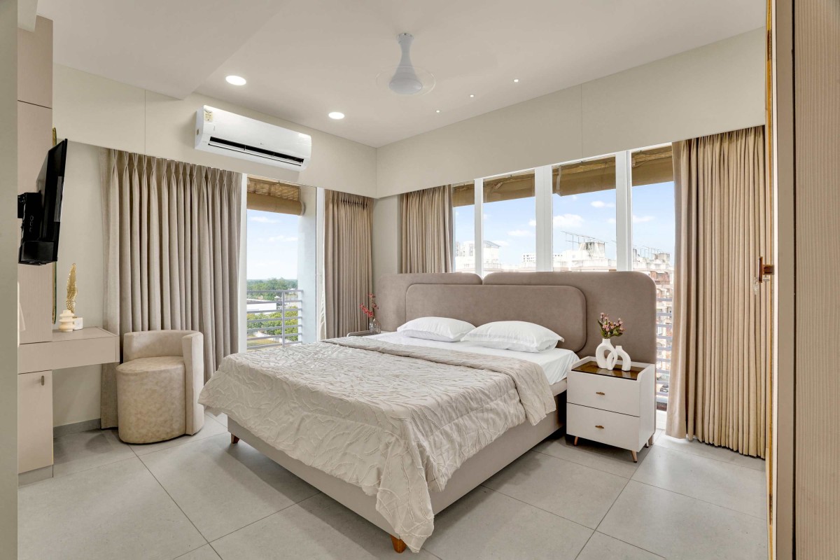 Each bedroom carries a distinct identity while staying loyal to the overarching design grammar. The master bedroom leans into refined simplicity—ample amount of light, elegant trims, muted tones, and seamlessly integrated storage create an envelope of calm. The daughters’ shared room is a gentle expression of boho playfulness, with airy hues, multifunctional furniture, and patterns that spark creativity. For the grandparents, comfort leads the aesthetic: ergonomic furniture, slip-resistant surfaces, and decluttered circulation ensure ease without compromising elegance.
