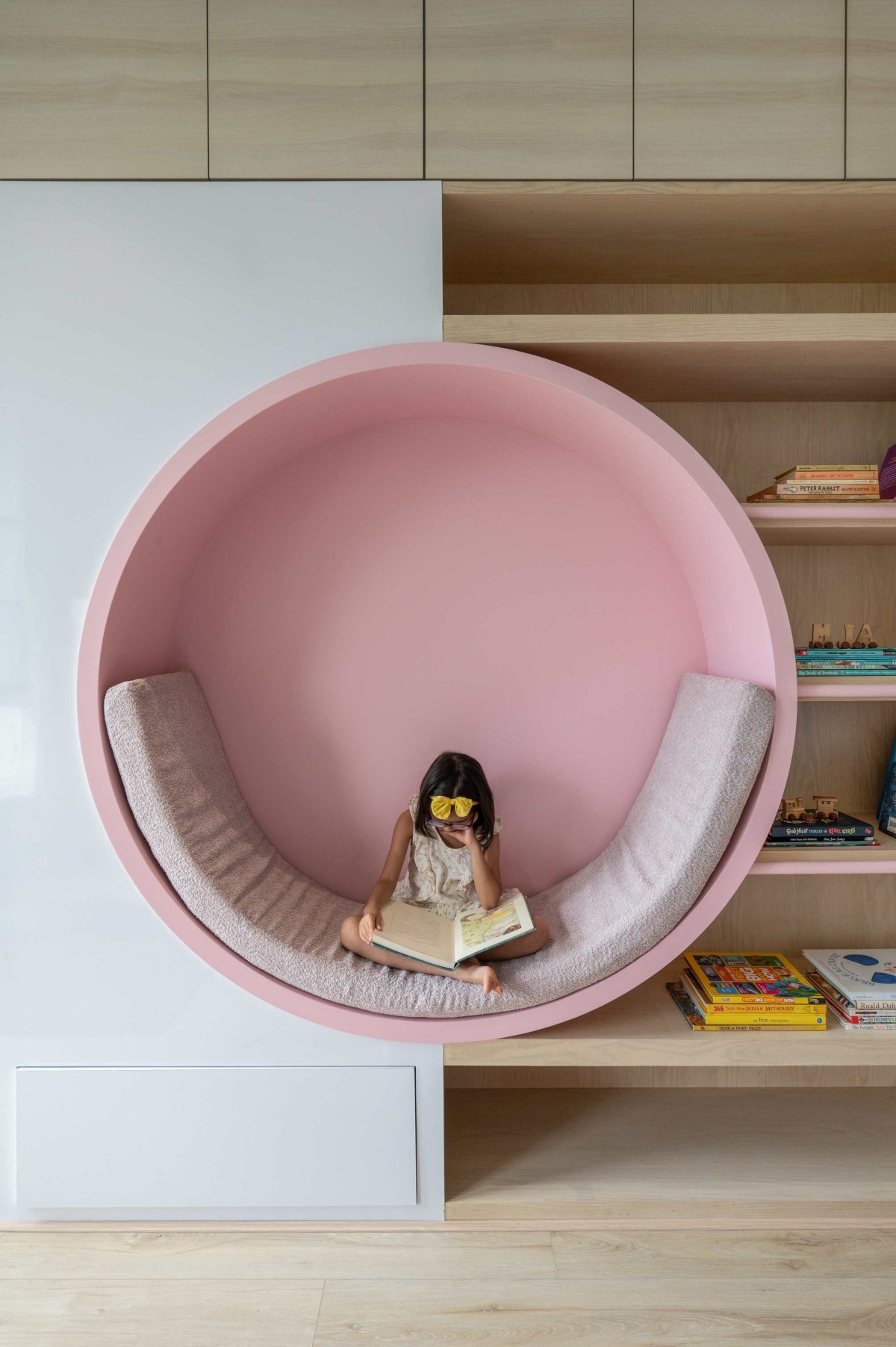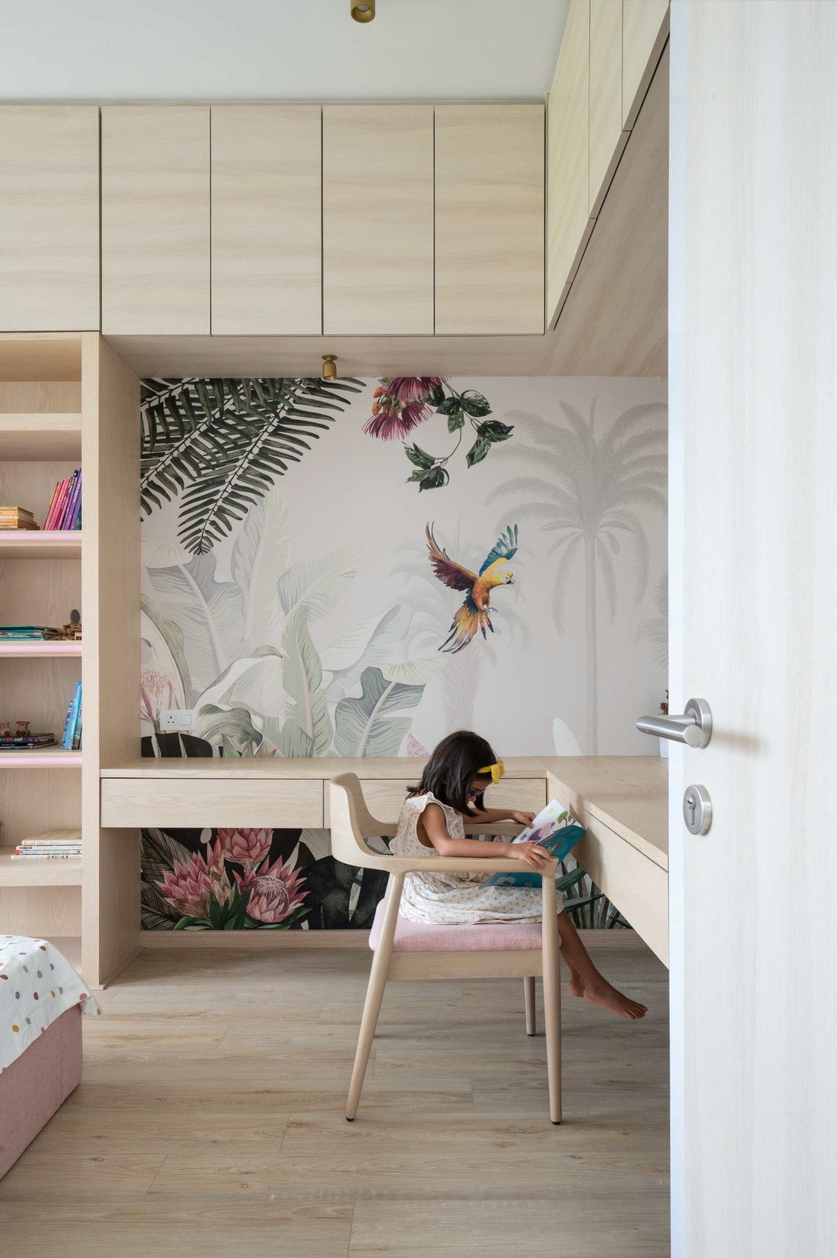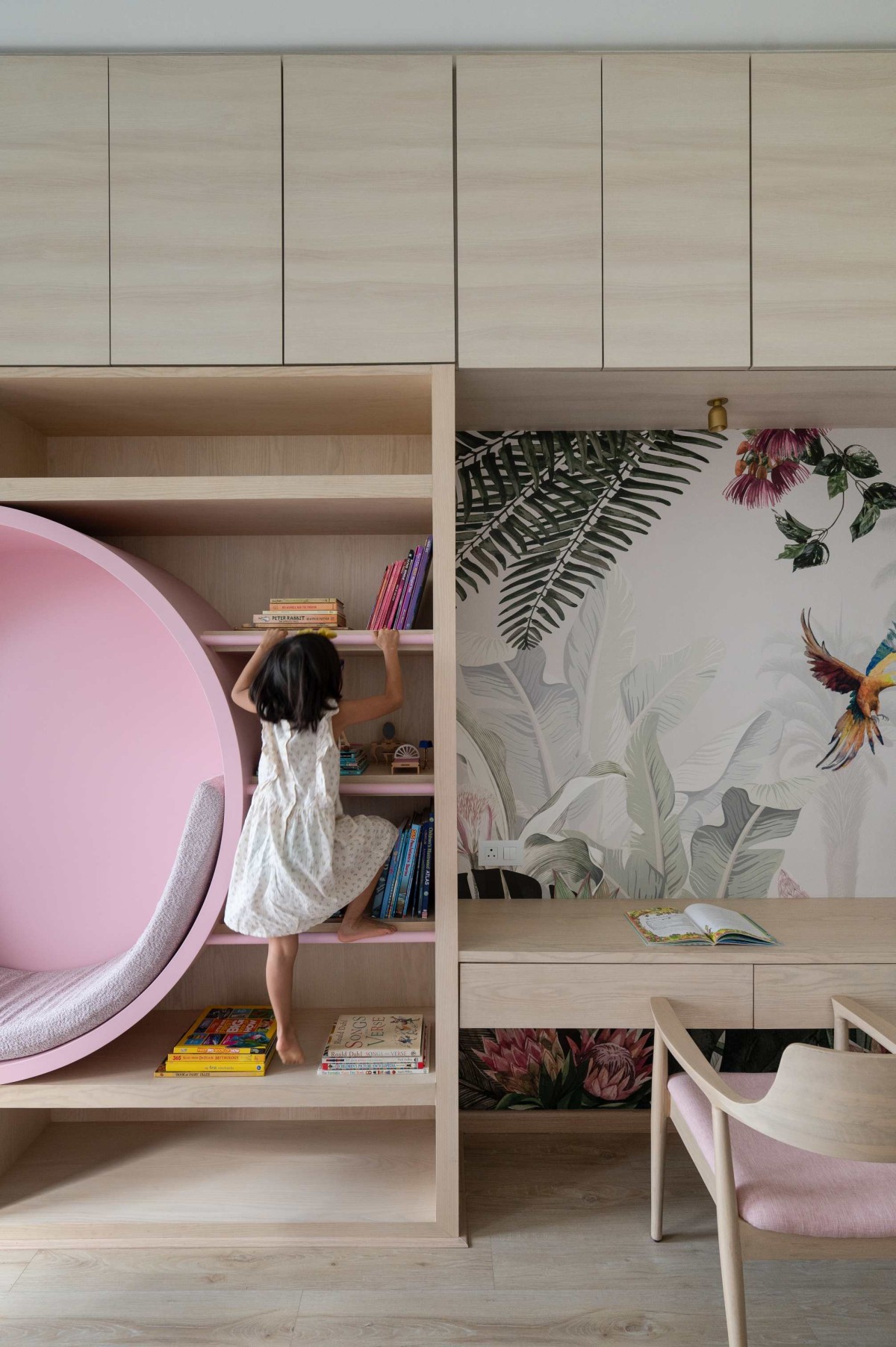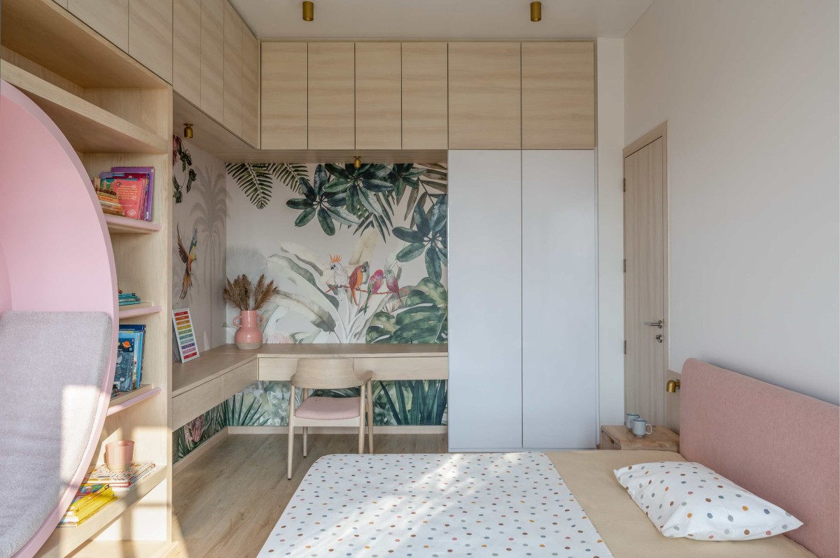 The kids room is a beautiful pop of color and has a lot of playful design elements. The tropical amazon wall paper that is paired with blush color that compliments the daughter’s personality and her liking.