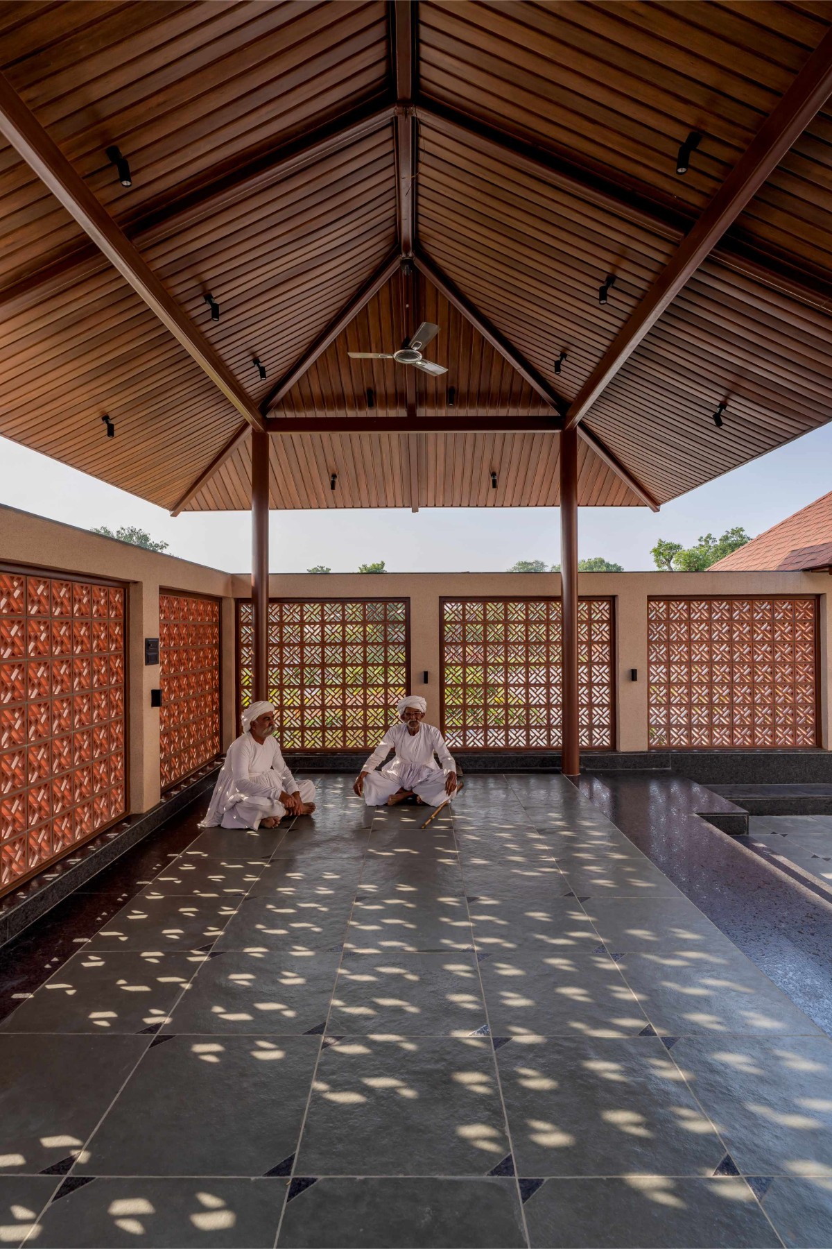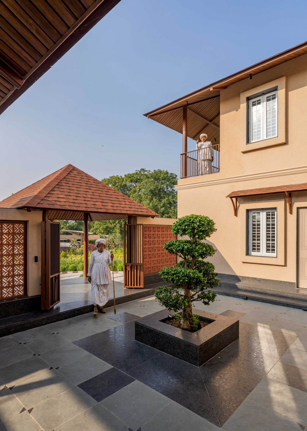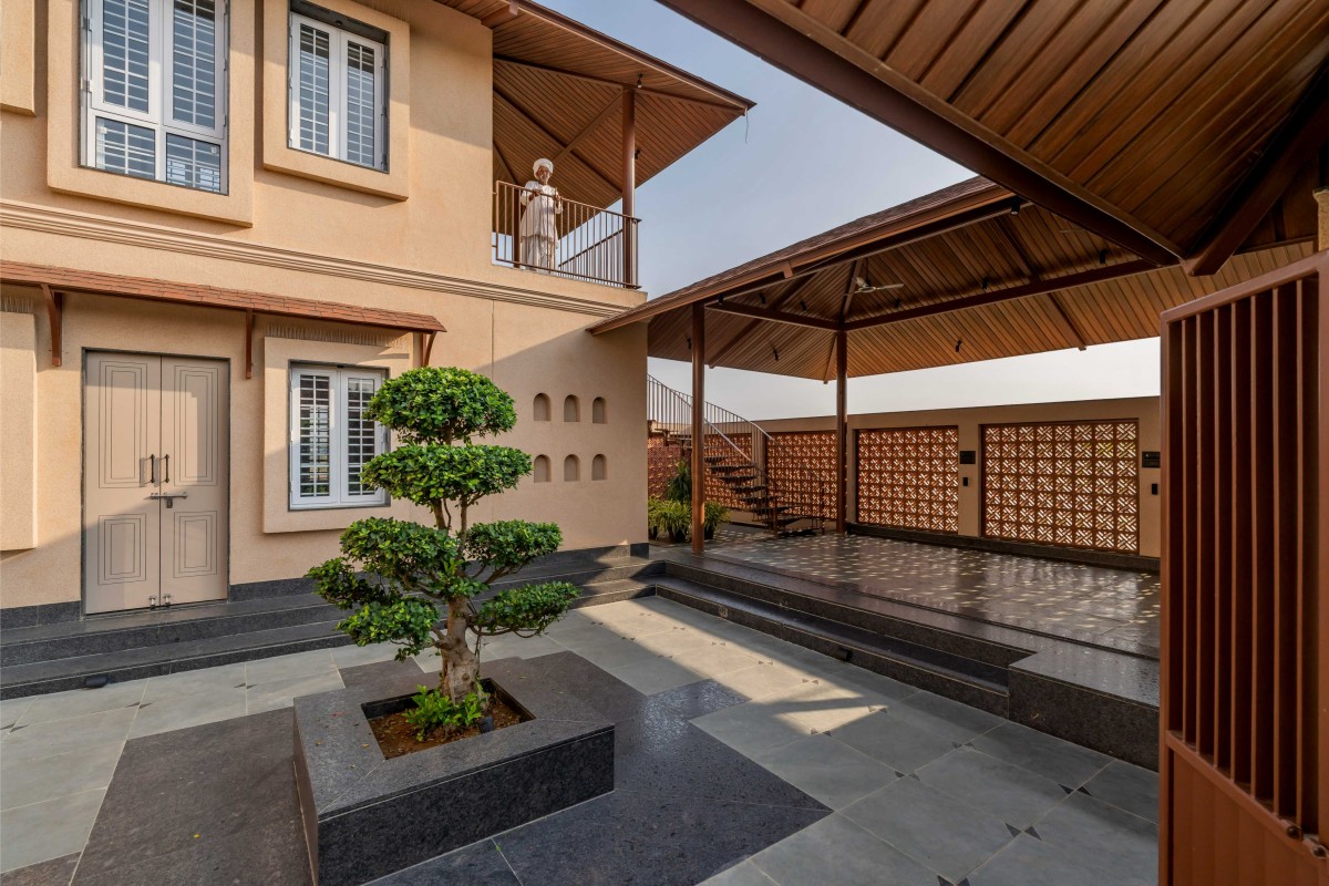 Material choices further root the project in its context. Textured plastered walls soften the massing and recall traditional village homes. Terracotta jaalis line the south-west shaded portico, enabling cross-ventilation while casting intricate patterns of light on the natural stone floors. Indian stone flooring composed of kota and kadappa stones ensures durability and thermal comfort, and invites visitors to sit on the floor, as is customary in this part of the world. At the heart of the entrance courtyard sits a carefully nurtured bonsai, tended by the client for years, symbolizing continuity, patience, and the personal history that grounds the home.