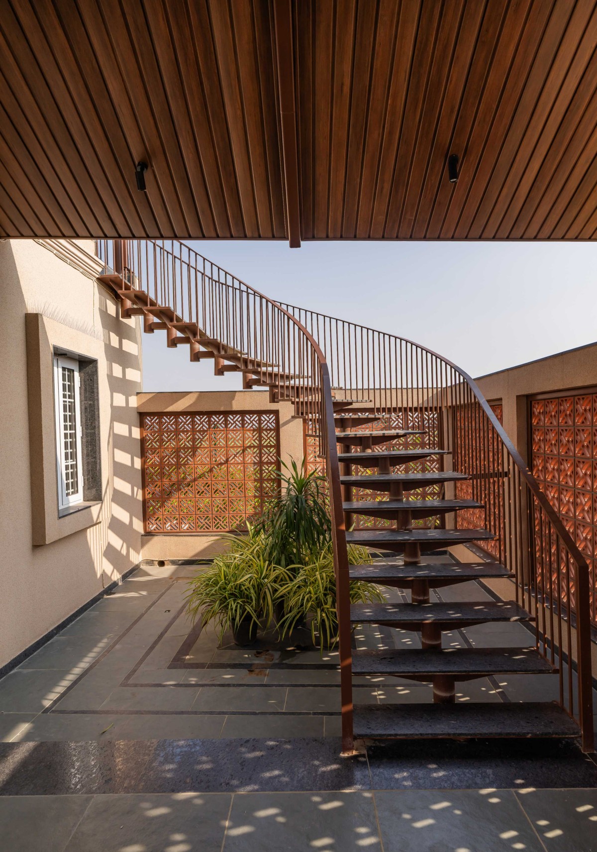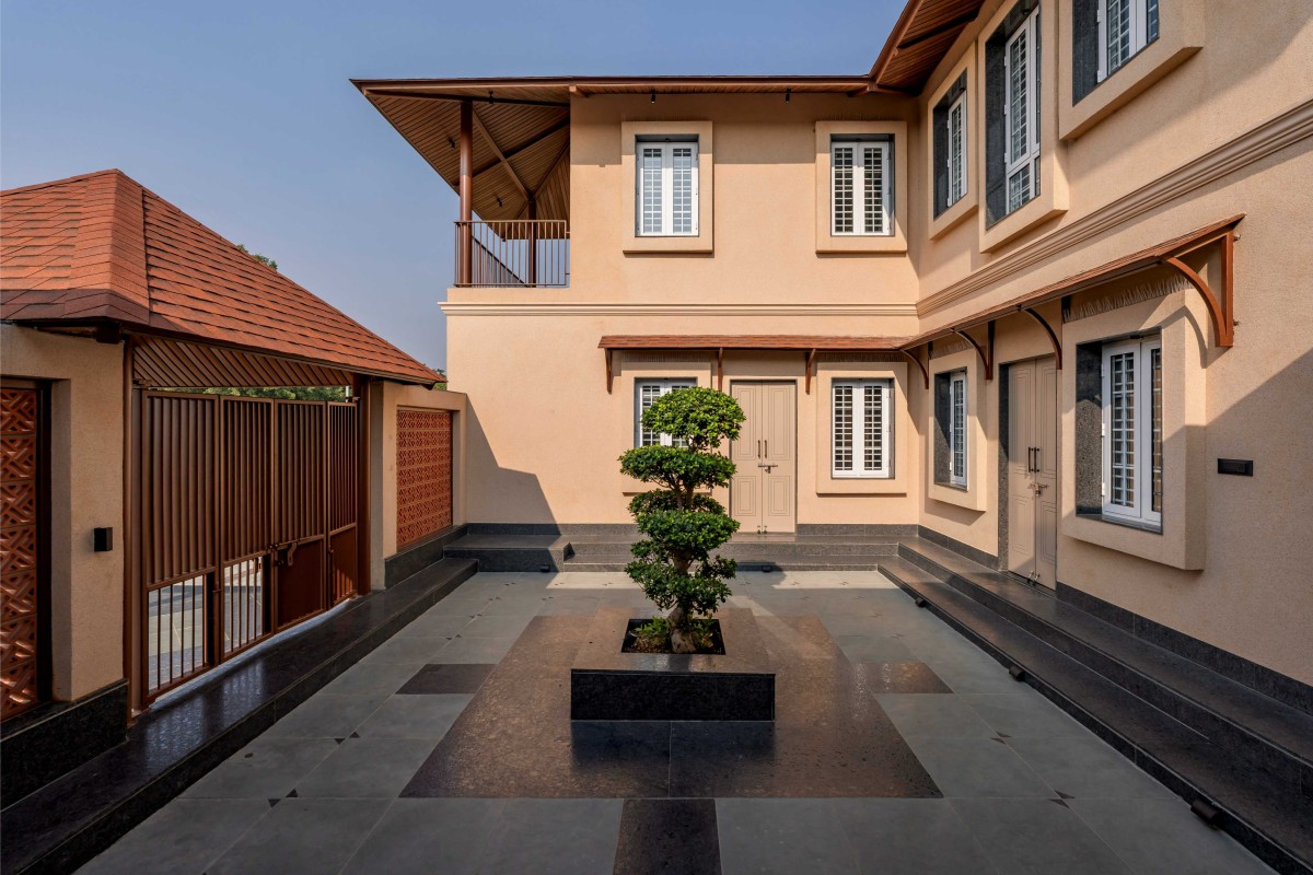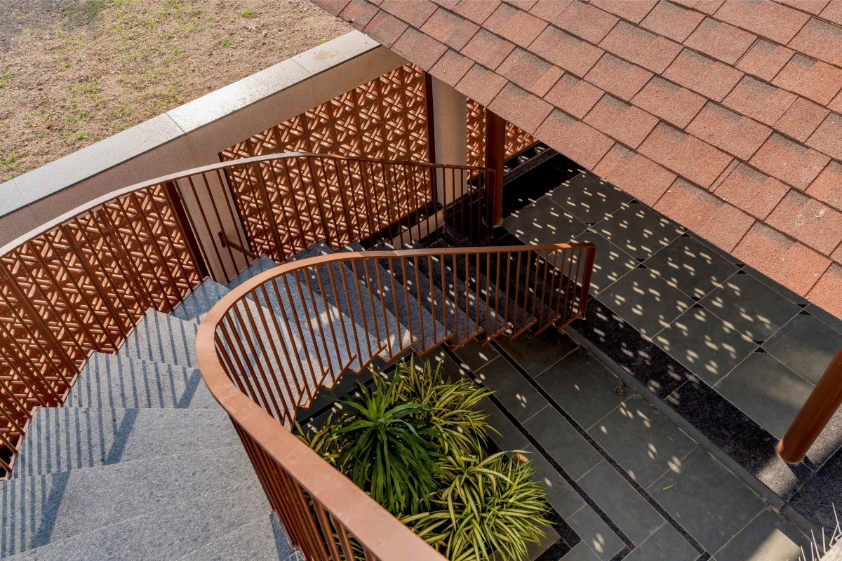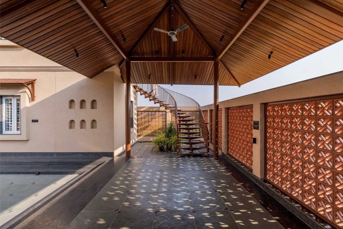 The planning of the house addressed these layered requirements through a design centered around the courtyard, which became the home’s spatial, emotional and social nucleus. The building is arranged as a series of thresholds; plinth, verandah, jaali screen, courtyard, each softening the transition between inside and outside. The form draws from familiar regional typologies: sloping clay-tiled roofs, extended eaves that provide shade, and deep verandahs that act as breathing spaces throughout the day. A lightweight spiral staircase ties the lower and upper levels together, adding visual movement without overwhelming the simplicity of the structure. The circulation is calm and fluid, with shaded passages encouraging a slow pace as one moves through the home.