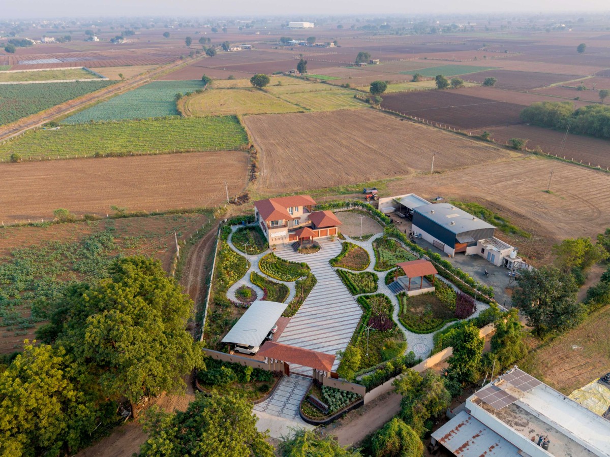 Set within an agricultural landscape, around 50 kilometers from Ahmedabad, the house sits on the client’s ancestral farmland, surrounded by fields, grazing paths, and the gentle rhythms of village life. This weekend retreat evokes childhood memories of warmth, humble spaces, and a courtyard where everyday life unfolds unhurriedly — while local Rabari pastoralists pass through the fields and neighbors arrive with quiet familiarity.