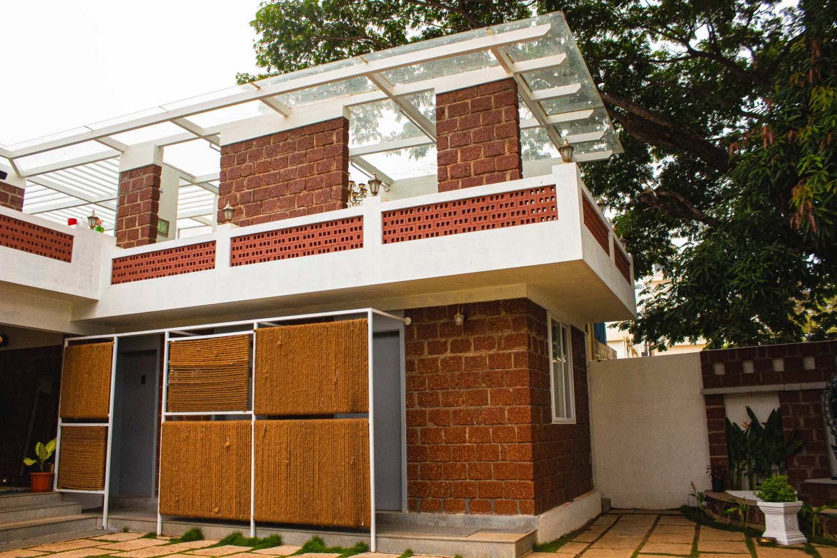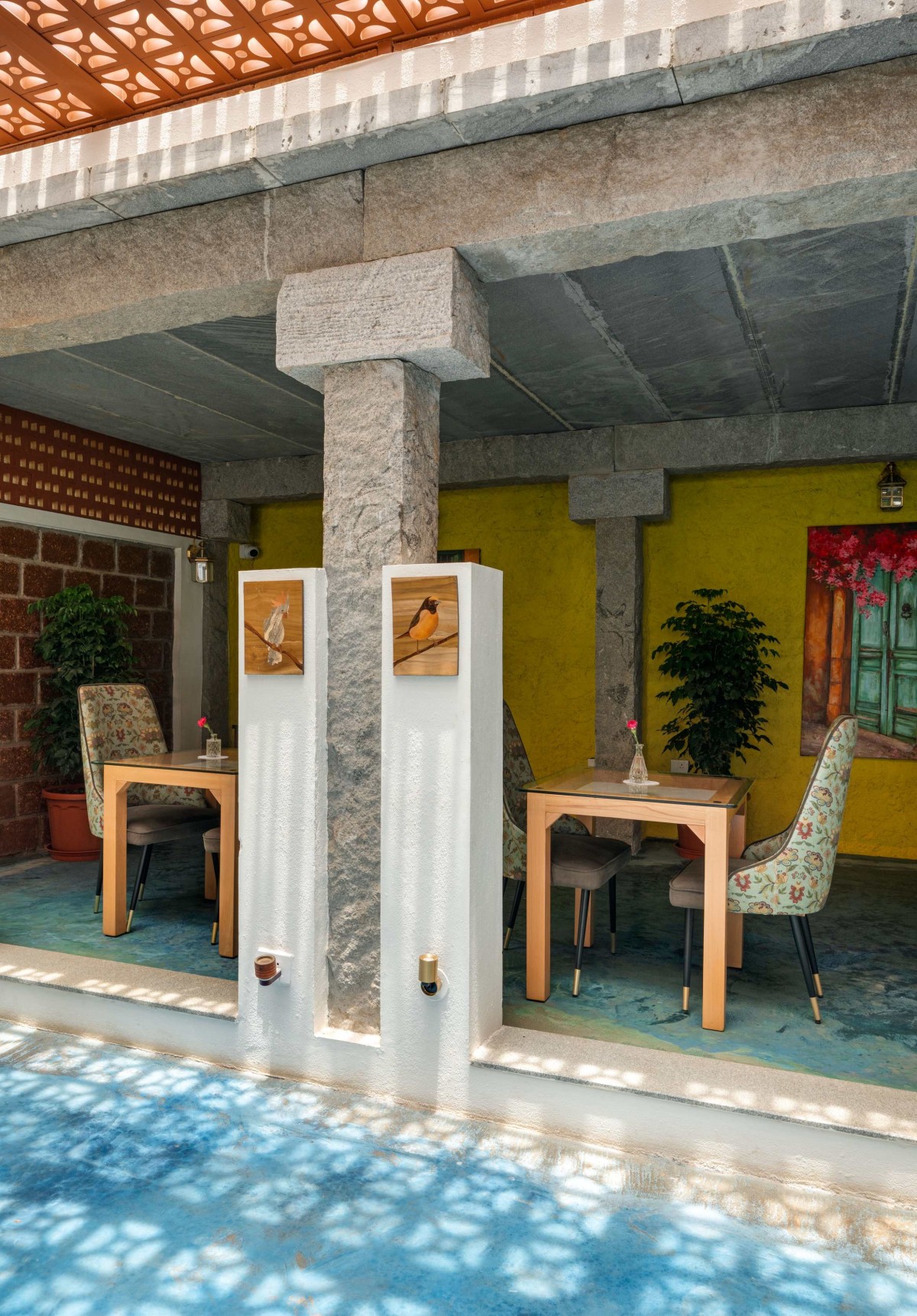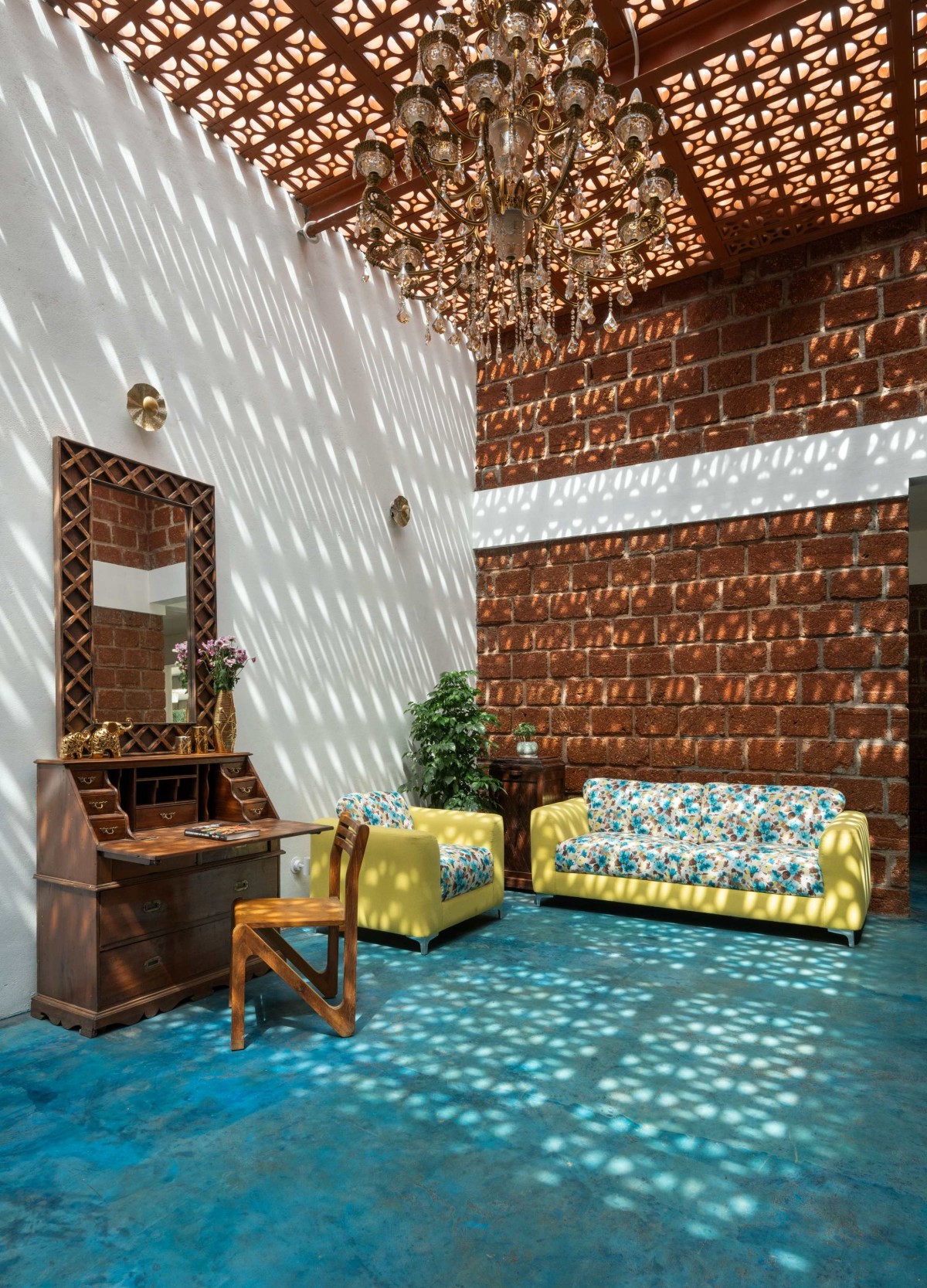 The construction process was equally meticulous. Locally sourced laterite, stone slabs, and brick masonry were assembled with precision, with stone beams and slabs cut and placed on site. The flooring, executed in Vacuum Dewatered Flooring (VDF), incorporates subtle blue and green pigments, creating a cool, composed surface that complements the material palette. Artworks collected from Chitra Santhe and curated antiques are interwoven throughout the interiors, enriching the spatial narrative and encouraging exploration.