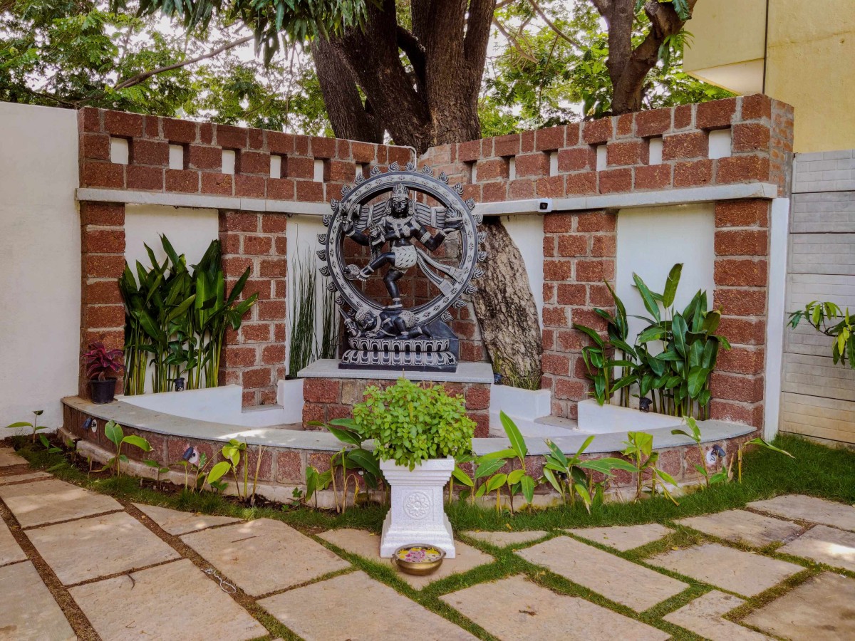 At the heart of the project stands a 6.5-foot stone sculpture of Lord Nataraja, commissioned from a prominent sculptor. Positioned as the culmination of the spatial journey, the sculpture embodies stillness within movement—a focal point that evokes contemplation and quiet reverence. For the architect, a classical dancer and devotee, this element is both symbolic and personal, reinforcing the belief that the site itself holds an enduring spiritual resonance.