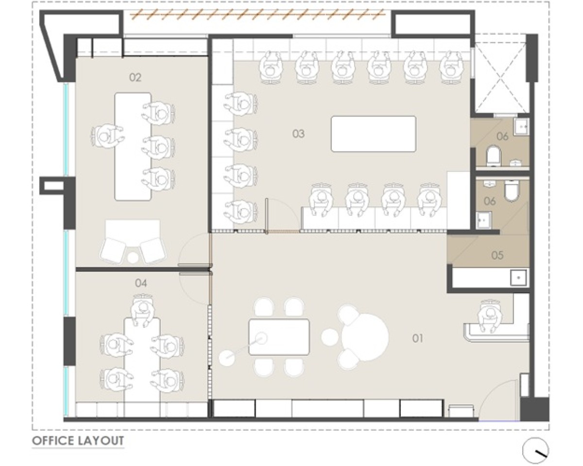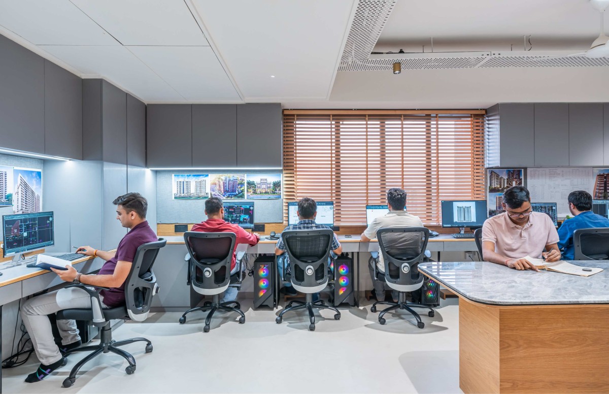 A completely open-plan workspace that encourages interaction and collaboration among team members. The lack of enclosed cubicles ensures a free-flowing, transparent work environment that enhances efficiency. Carefully planned workstations allow for ease of communication while maintaining an organized and uncluttered space.