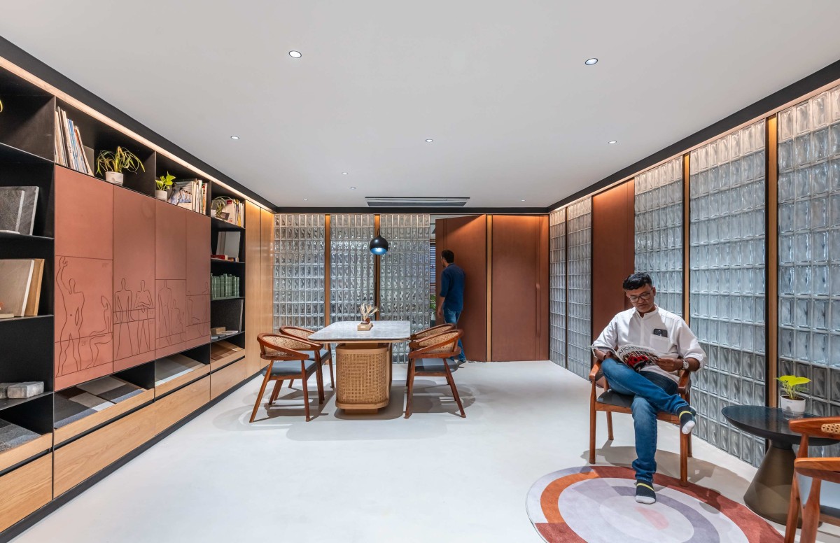 Making a statement right from the entrance. The reception area welcomes you with a bold coloured wall mural, beautifully showcasing architecture and building elements that define the space. Designed as an engaging and welcoming space rather than a formal waiting area. Houses a material library shelf with liquid metal shutters, which incorporate engravings of a standard-heights of human figure symbolizing Le Corbusier’s modular, adding an artistic and conceptual depth to the space. The reception desk and surrounding elements are curated to feel cohesive and modern, ensuring visitors experience the studio’s design philosophy from the moment they enter.