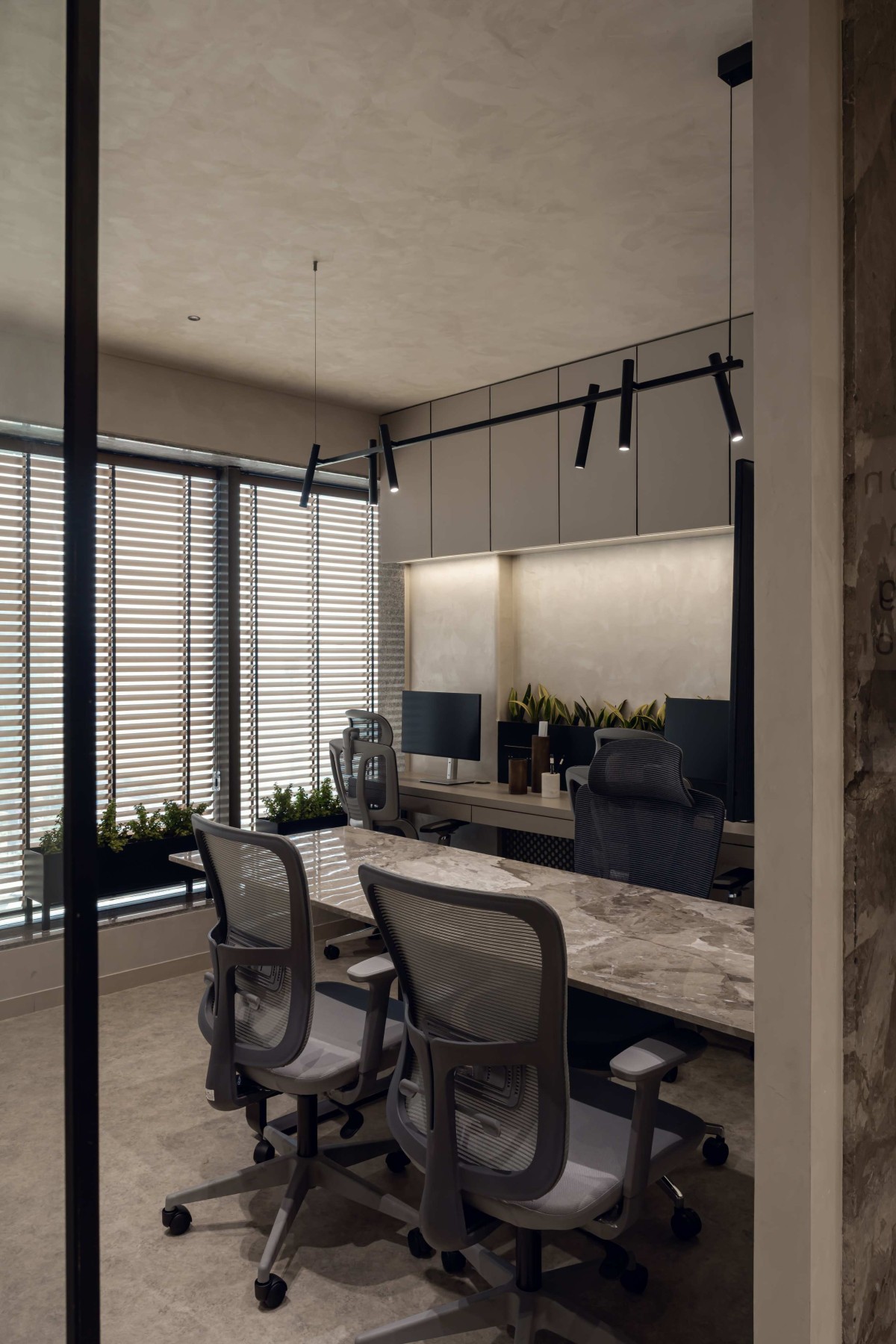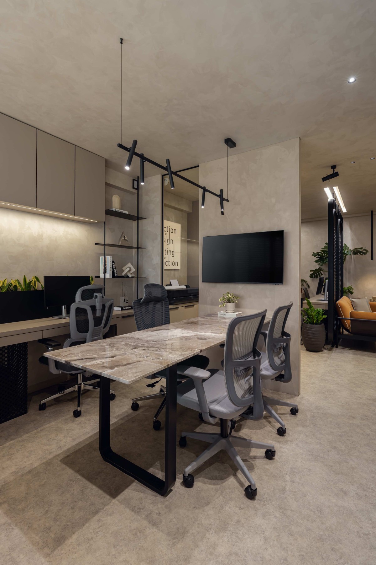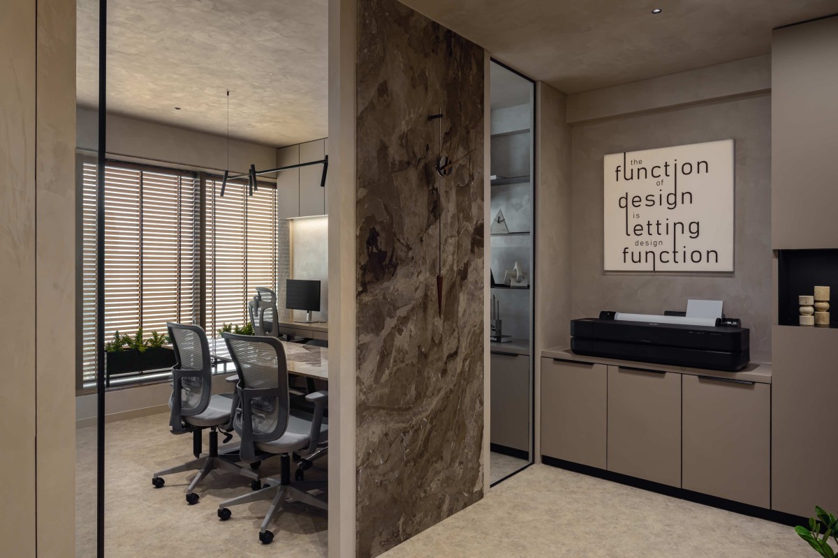 The heart of the office is the Design Strategy Cabin, a space that defies conventional hierarchical office planning by housing all three partners together in one collaborative environment. Rather than separate offices that might create barriers to communication and collaborative thinking, this cabin features three partner workstations arranged around a central conference table. This table is crowned with the same carefully selected Italian marble that appears at the entrance and on the waiting area side table—bringing the material full circle through the office journey. This marble was chosen specifically because it contains the entire color spectrum of the office within its natural veining: from the palest cream to the richest desert beige, with all the subtle variations in between. It serves as both the aesthetic foundation and the unifying element that ties every space together.