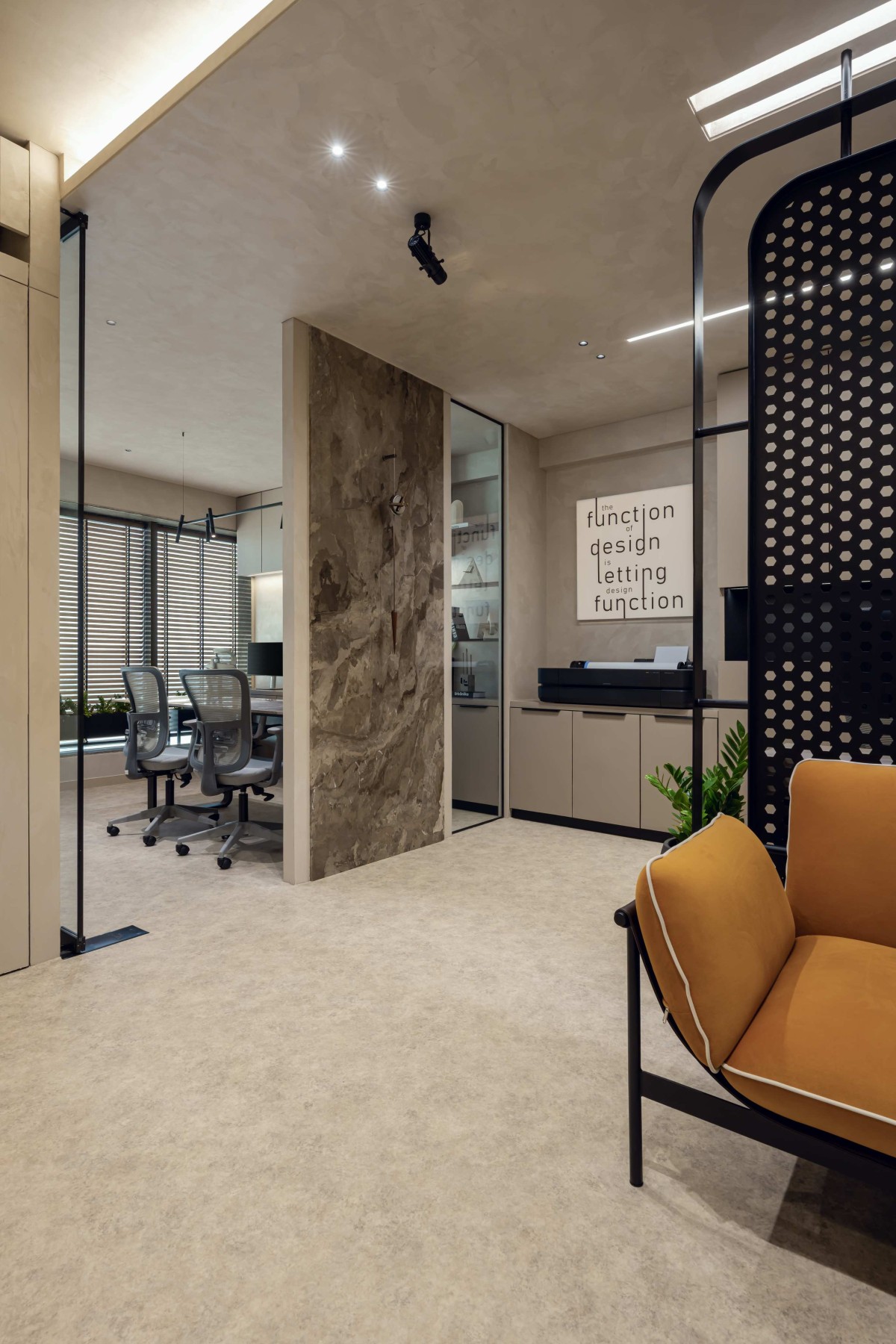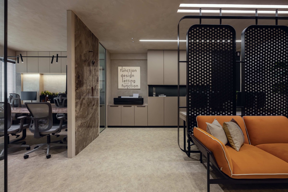 Throughout the office, fabrication appears as a recurring material signature—in the entrance nameplate, the honeycomb partition, the sofa legs, the side table column, the freestanding shelf—each application demonstrating different possibilities of metalwork while maintaining visual consistency through the matte black finish. Similarly, the Italian marble appears in multiple contexts—vertical column, horizontal tabletops, accent elements—showcasing how natural materials can be applied in varied ways while maintaining coherent design language. This repetition isn’t monotonous; instead, it creates a sense of intentional design thinking where materials are carefully selected and then explored through multiple applications, demonstrating depth of consideration and commitment to a unified vision.