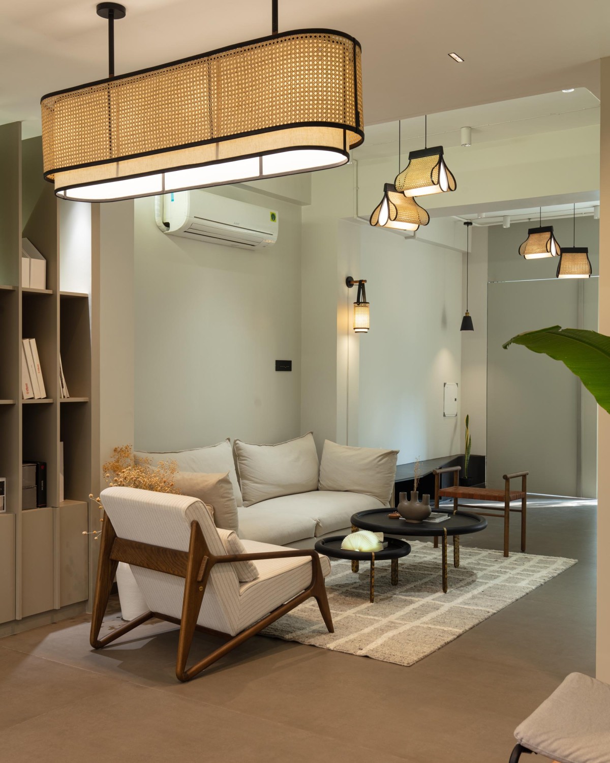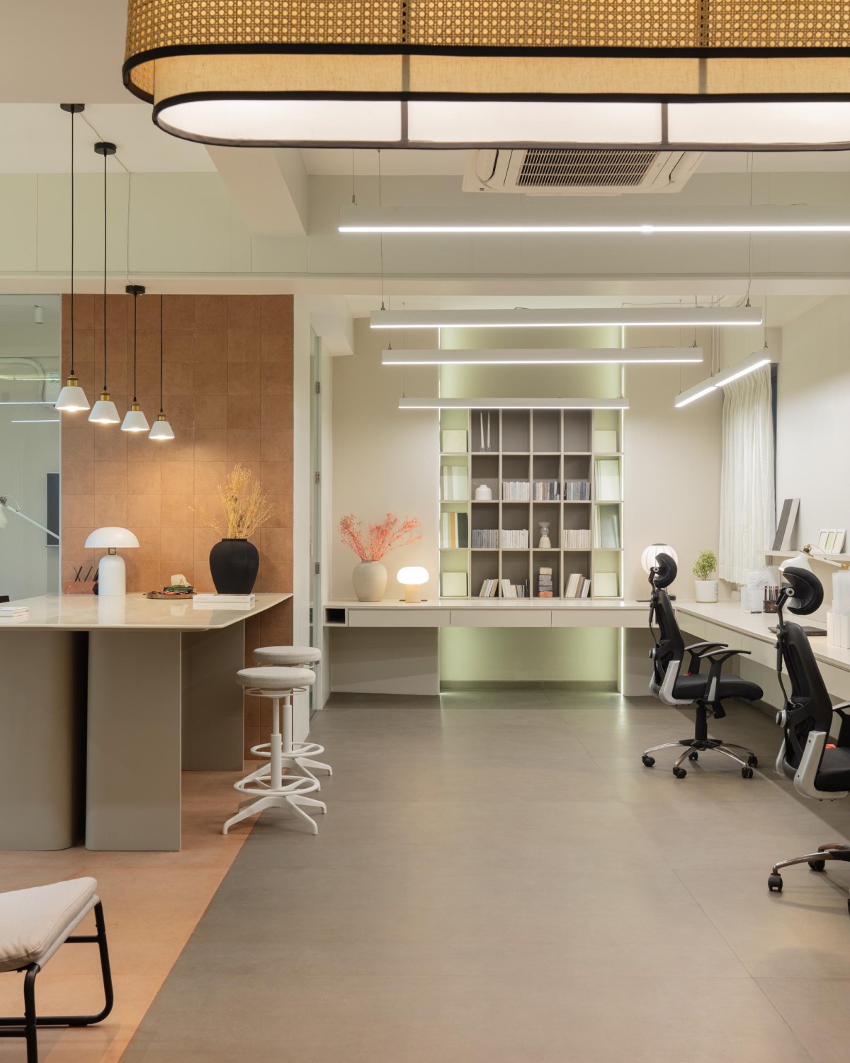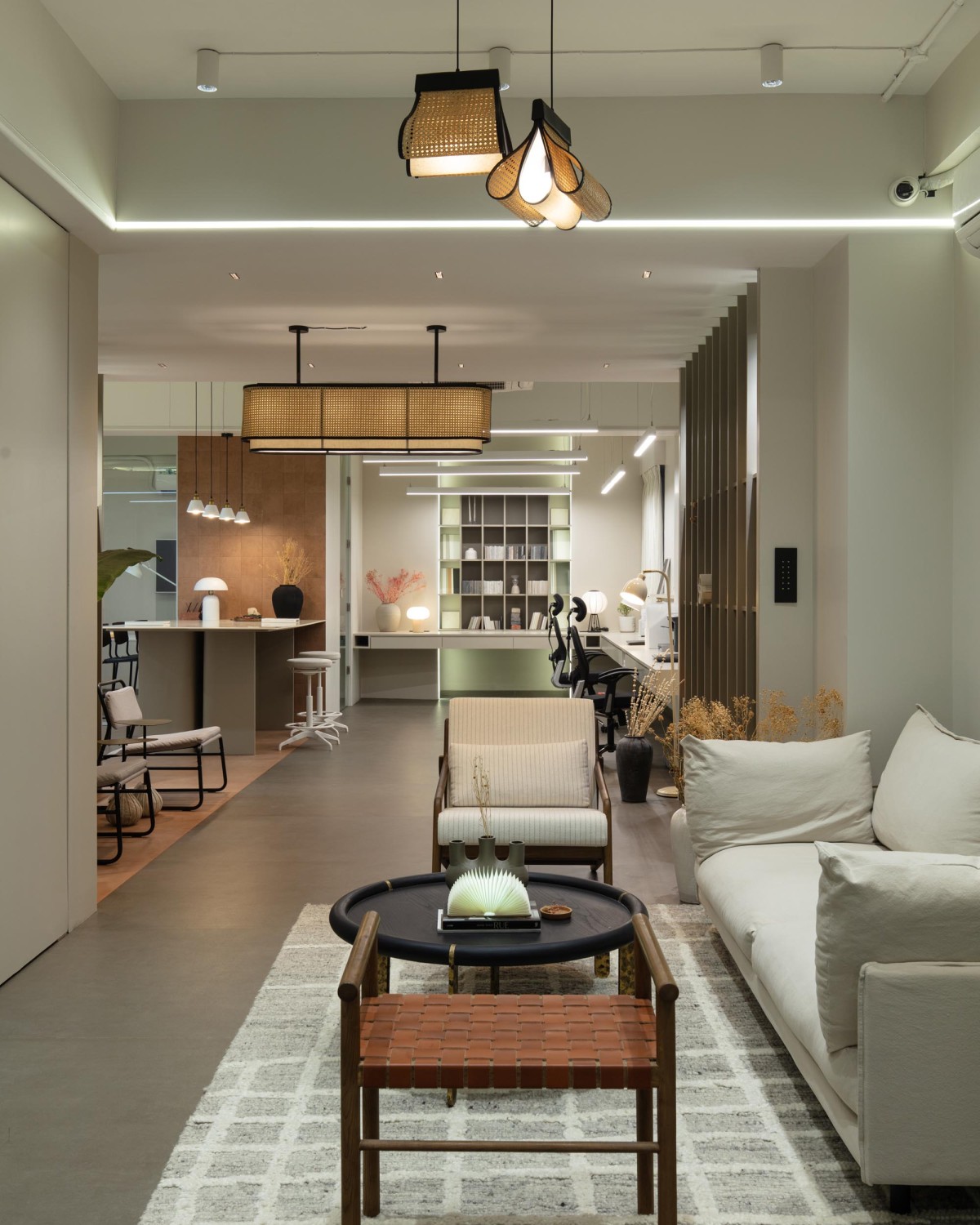 A restrained palette of warm neutrals anchors the interior, allowing texture to take precedence over color. Cane, wood, stone, fabric, and muted metal finishes are layered thoughtfully, resulting in a space that feels both contemporary and timeless. Lighting plays a crucial role—not as a decorative afterthought, but as an architectural element that shapes mood and rhythm throughout the day. Diffused, warm light softens surfaces, reinforcing the studio’s residential character.
