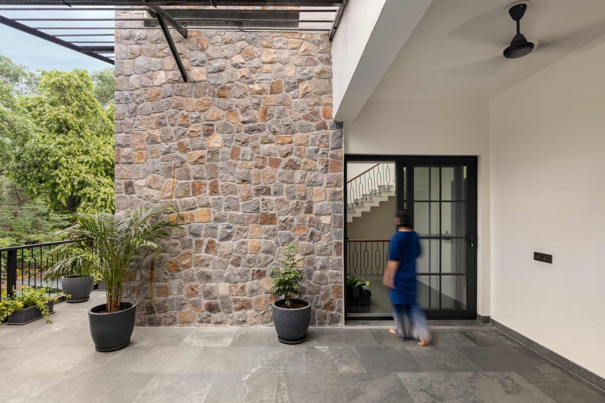 Material choices are rooted in geography, considering vernacular resourcing. The external façade and the dining area are clad in hand-laid Aravalli stone, grounding the house in local textures and materials. Interiors feature Kota stone flooring for thermal comfort and a timeless finish. Construction waste was even repurposed into flooring and the water body, reinforcing a low-waste, resource-conscious approach.