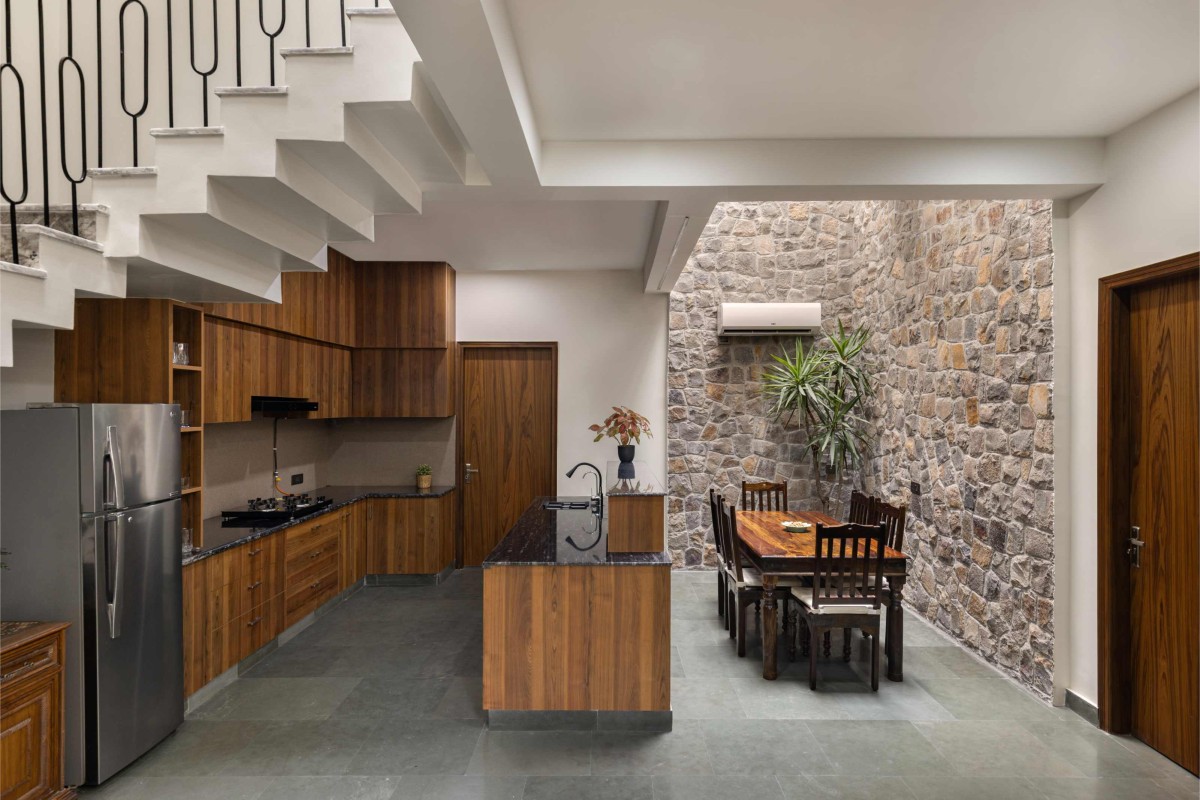 Due to the compact footprint and generous setbacks, four open-to-sky voids were integrated within the plan to bring natural light and ventilation to internal spaces. These are positioned strategically: at the entrance foyer, beside the dining area where they also define a cutout zone and reading nook, along the staircase core, and within the first-floor bathroom. Each of these light wells ensures natural illumination and passive cooling while connecting spaces both horizontally and vertically. These voids function as spatial lungs, ensuring daylight, passive cooling, and visual continuity across floors.