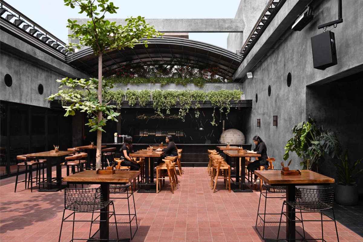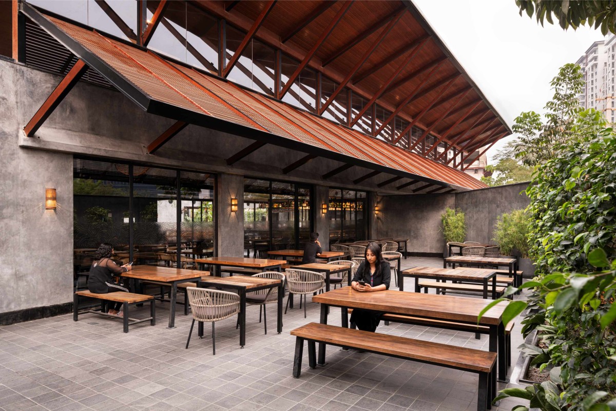 The restaurant incorporates several carefully thought-out, sustainable details. The sloped roof bathes the space in natural light, while louvered jute drapes shield southern glazing from glare, reducing reliance on artificial lighting and air conditioning. Sliding glazing systems enable cross-ventilation, and an innovative air cooling system powered by kitchen RO plant water serves 75% of the seating area. The choice of less processed materials, like rough granite flooring, not only adds character but also minimises maintenance needs, embodying the restaurant's philosophy of mindful, efficient design that evolves beautifully with time.