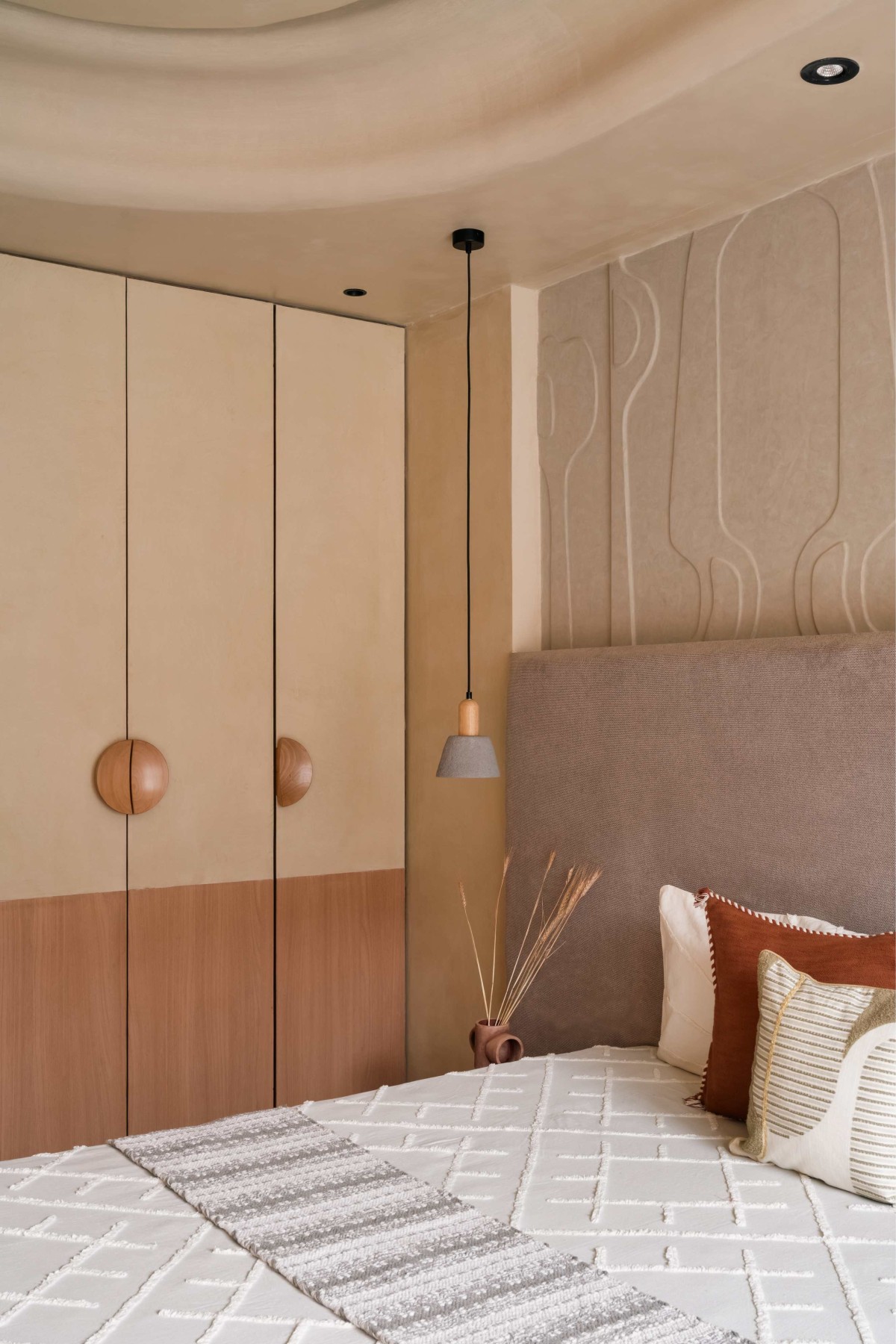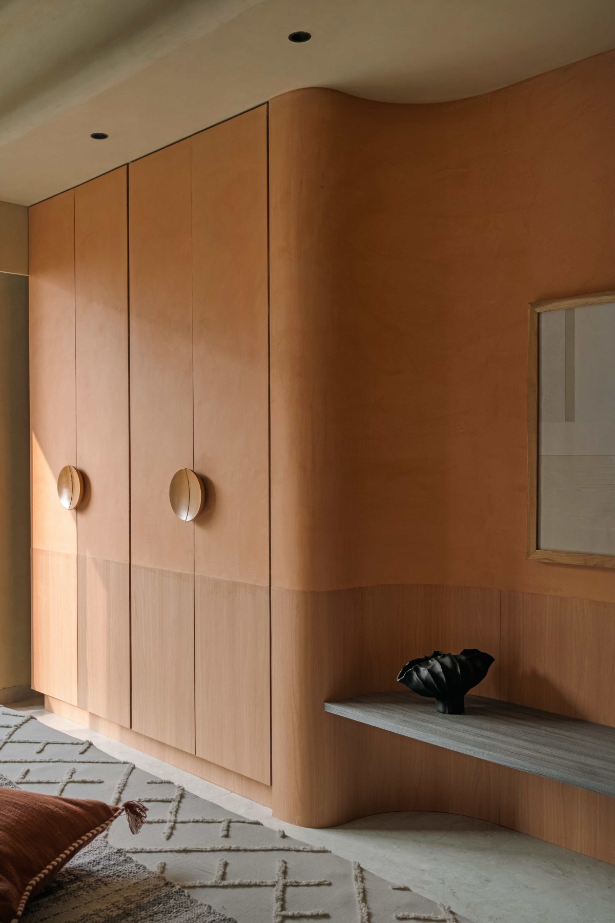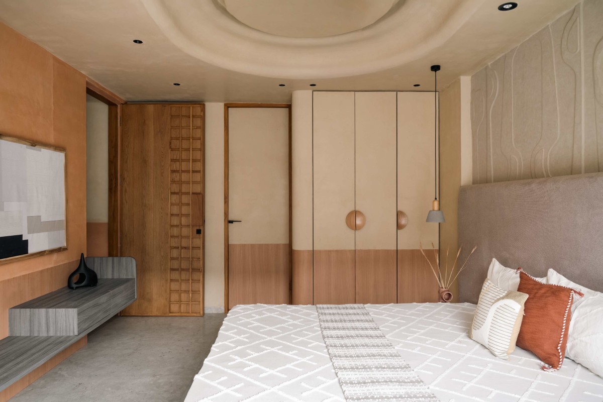 The master bedroom is the epitome of the "Terra-Form" concept—a seamless cocoon with curvilinear walls, softened edges, and a gently contoured ceiling that eliminates visual breaks while the feature wall in terracotta creates a warm focal point.