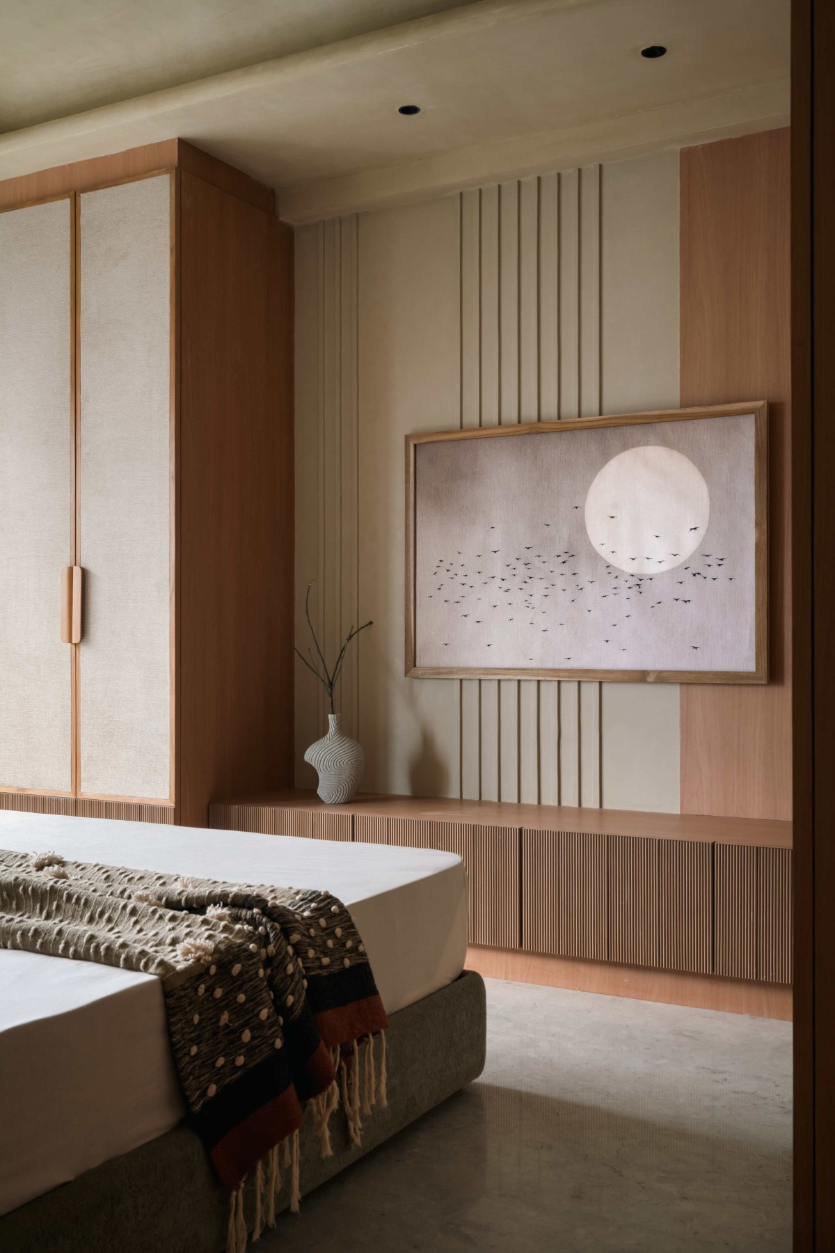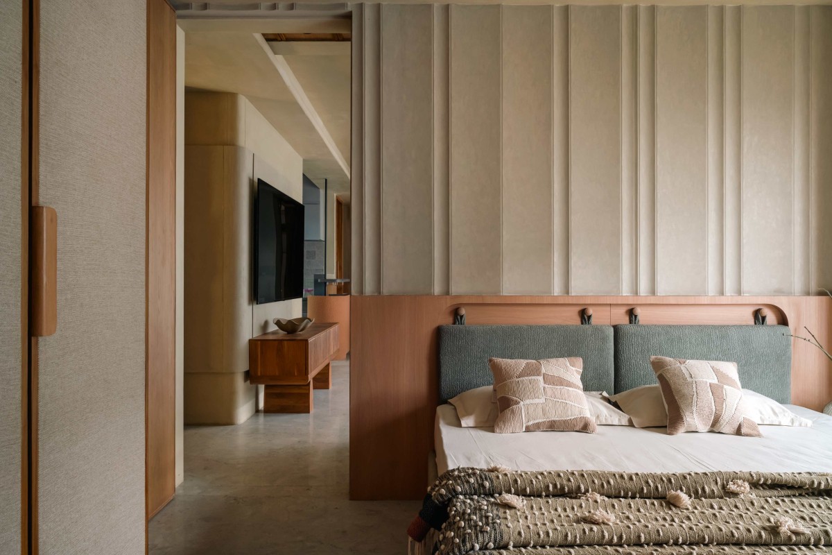 In contrast, the third bedroom is restrained and composed, featuring muted tones, symmetrical wall panelling and fabric-finished wardrobe shutters that add softness and layered texture.