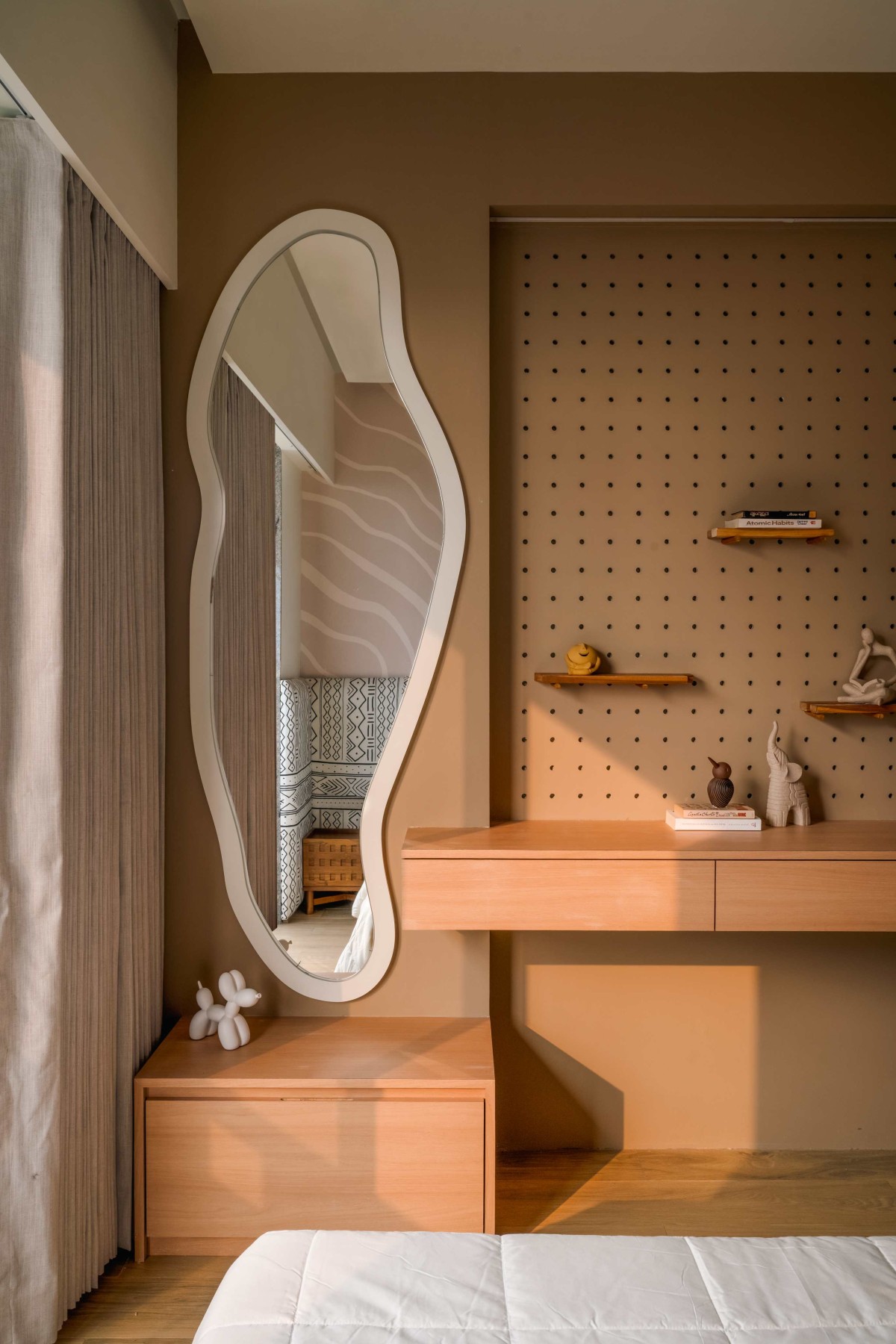 The kids’ room, envisioned as a multipurpose space, breaks the monochromatic stillness with a dynamic interplay of patterns and textures to create a lively, playful feel.