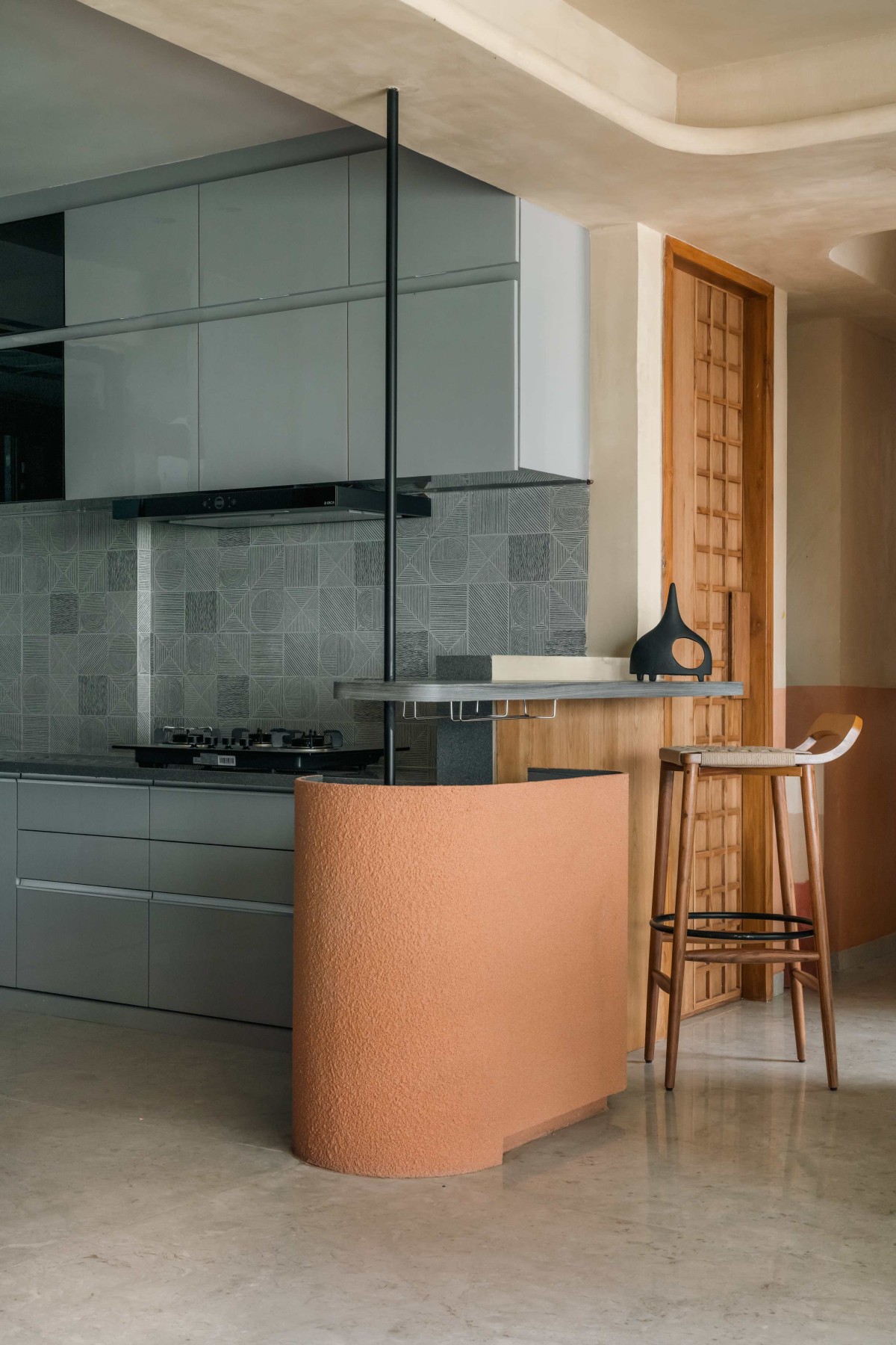 The dining area, conceived as a serene extension of the living space- creates a moment of pause with an arched architectural backdrop that introduces rhythm and softness. A terracotta-finished bar table acts as a transitional element between the dining and kitchen areas, balancing functionality with material expression —a bold element that segregates the zones while maintaining visual continuity.