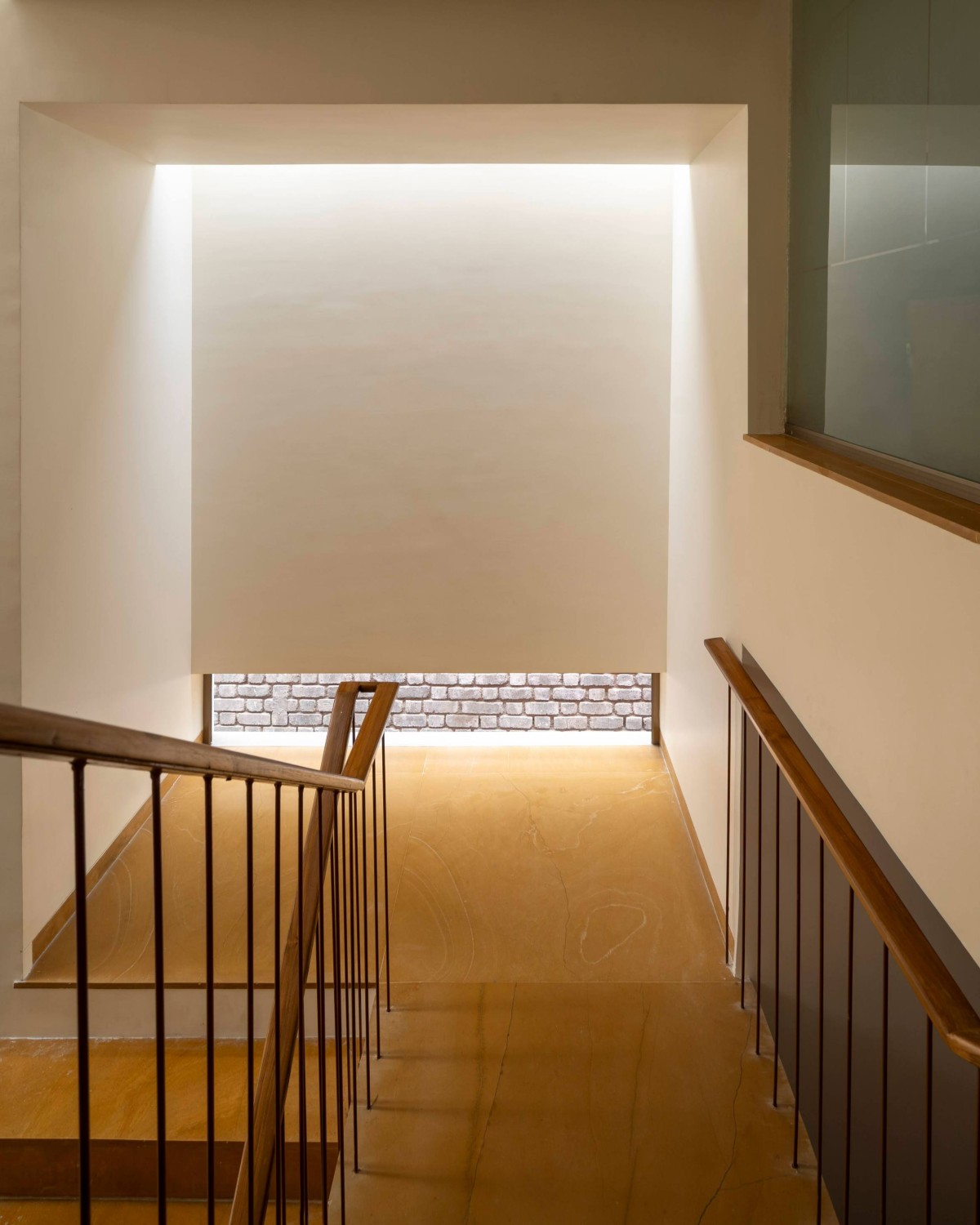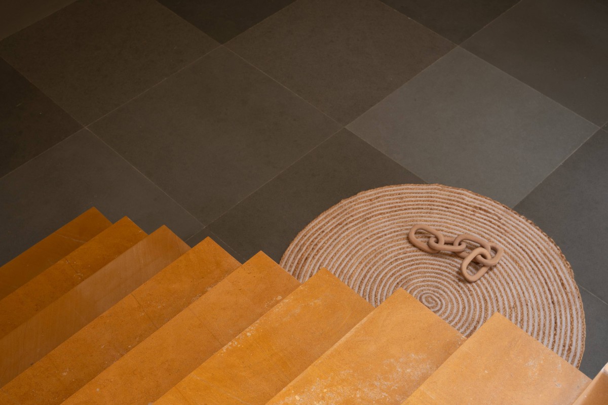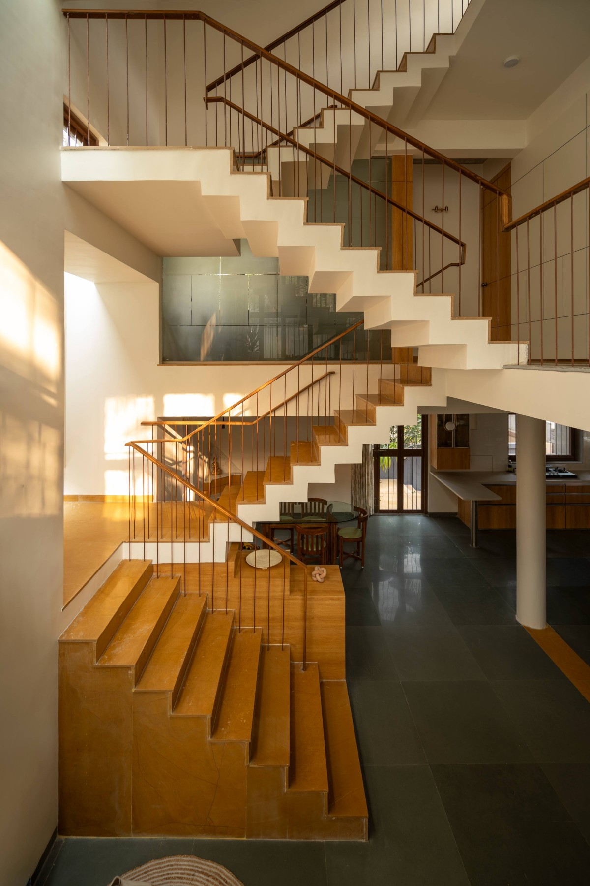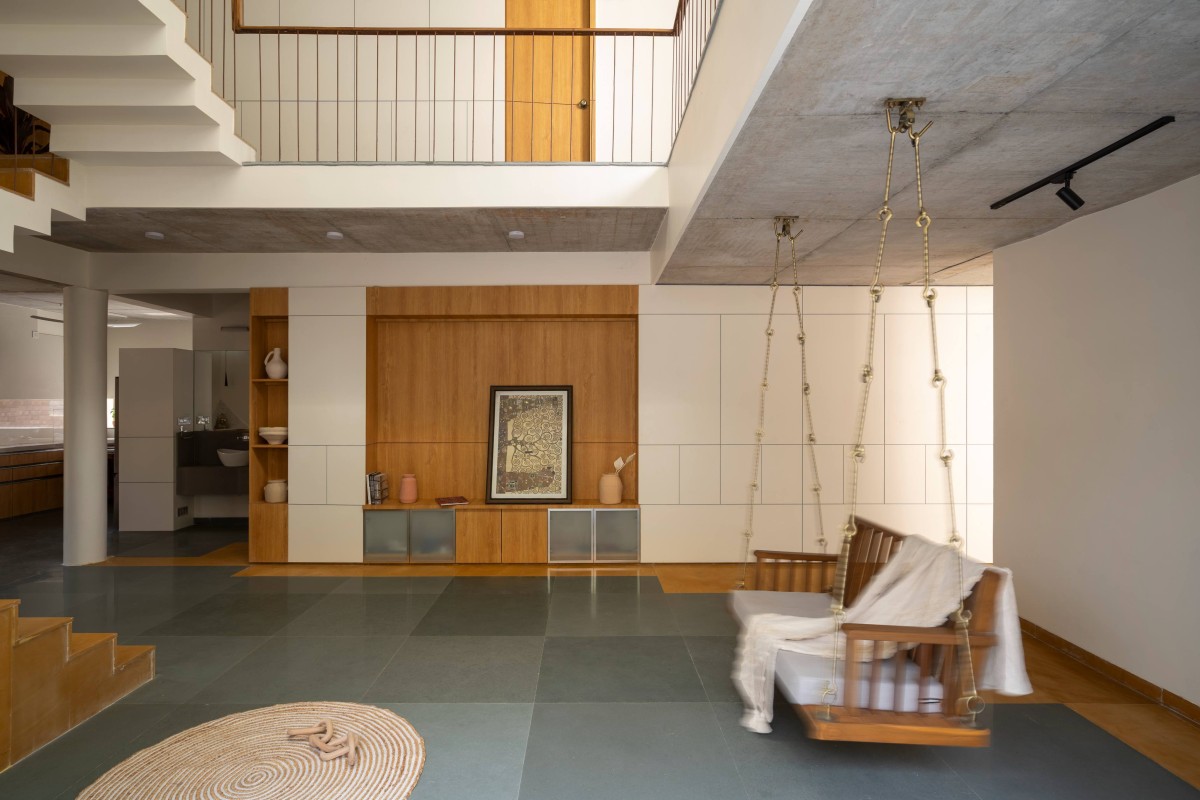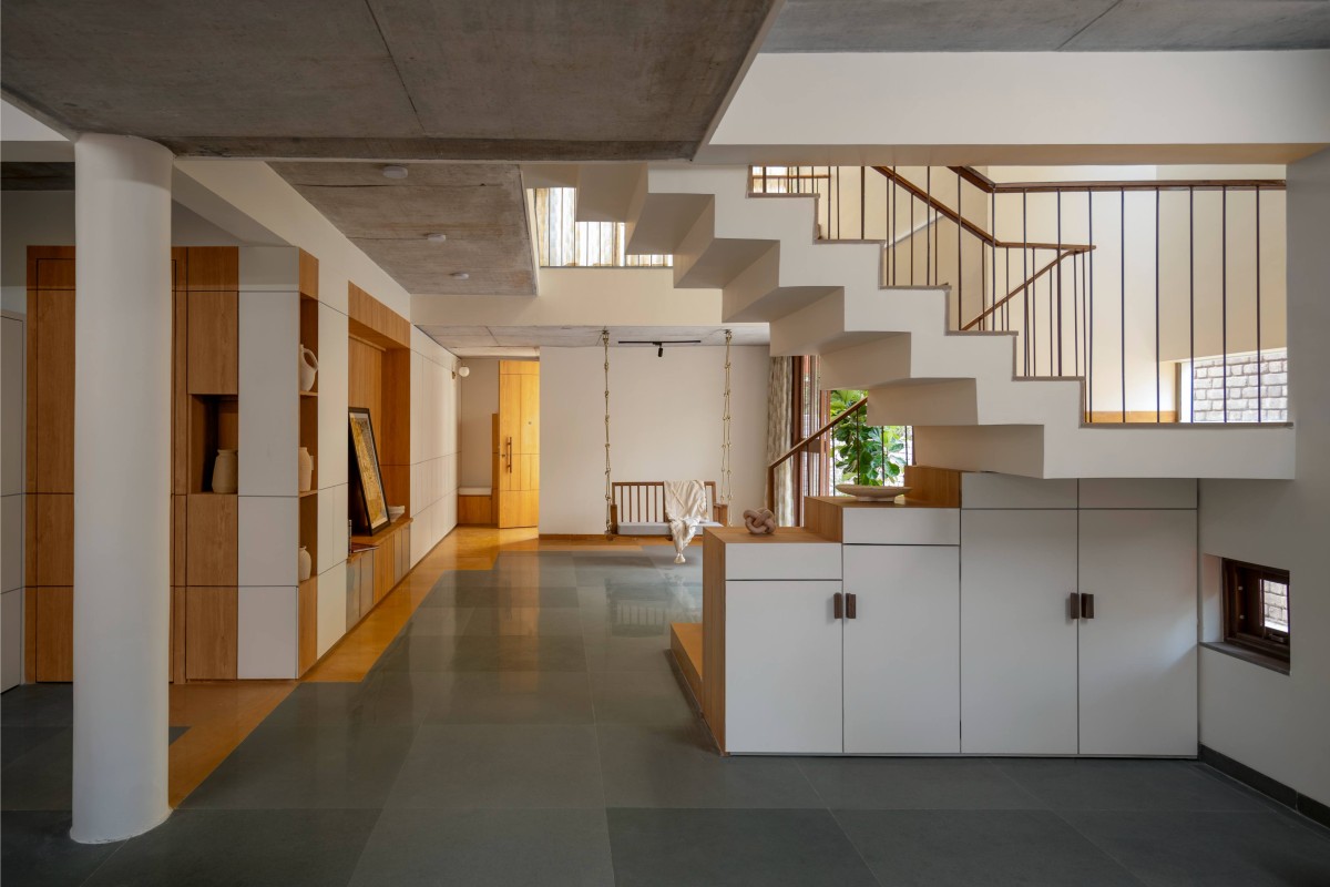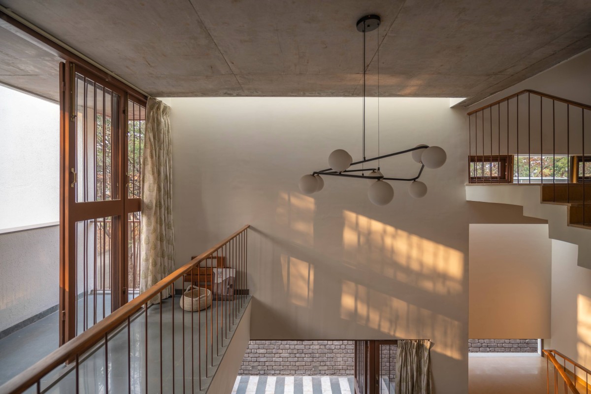 The staircase has a unique sectional shift. One mid landing stretches outward beneath a skylight’s embrace, while the other remains sheltered within. This shift creates striking contrasts as one ascends to the first floor and then to the terrace.