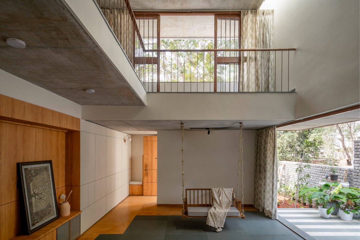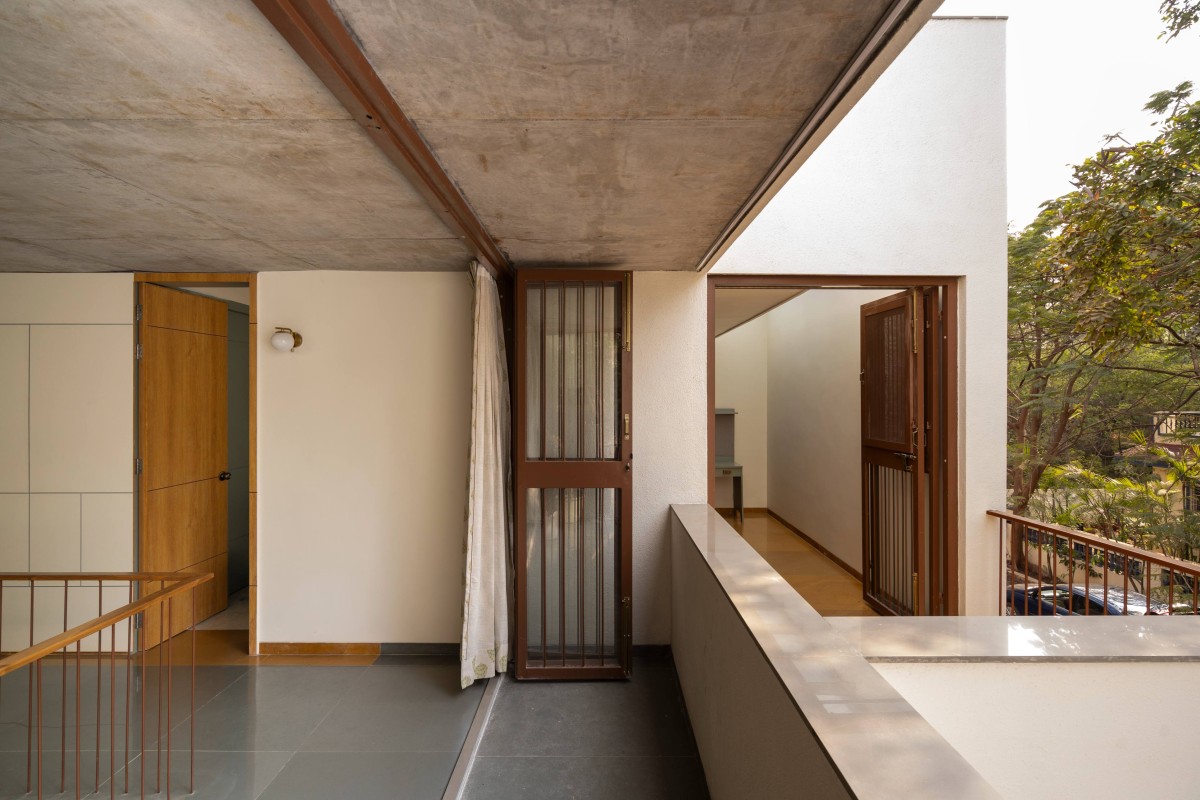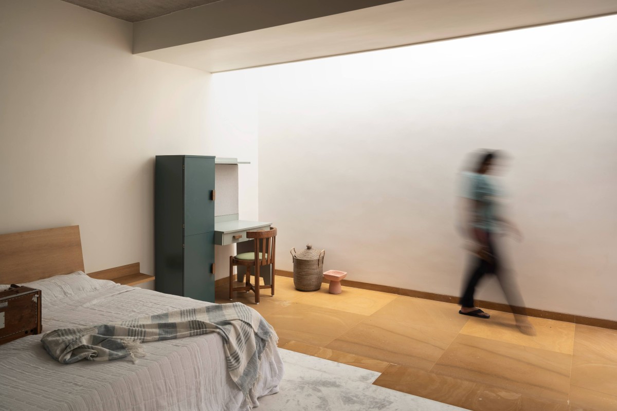 The first-floor corridor is illuminated by a skylight and overlooks the living below, connecting the two bedrooms and a study. The west bedroom is shielded from the afternoon sun, while the east bedroom has a large seating window. A pair of standing balconies visually link these bedrooms, creating a space for conversation. A northeast corner window in the study, fills the room with a warm sunlight. A cut-out channels this light onto the Buddha in the mandir, a level below.