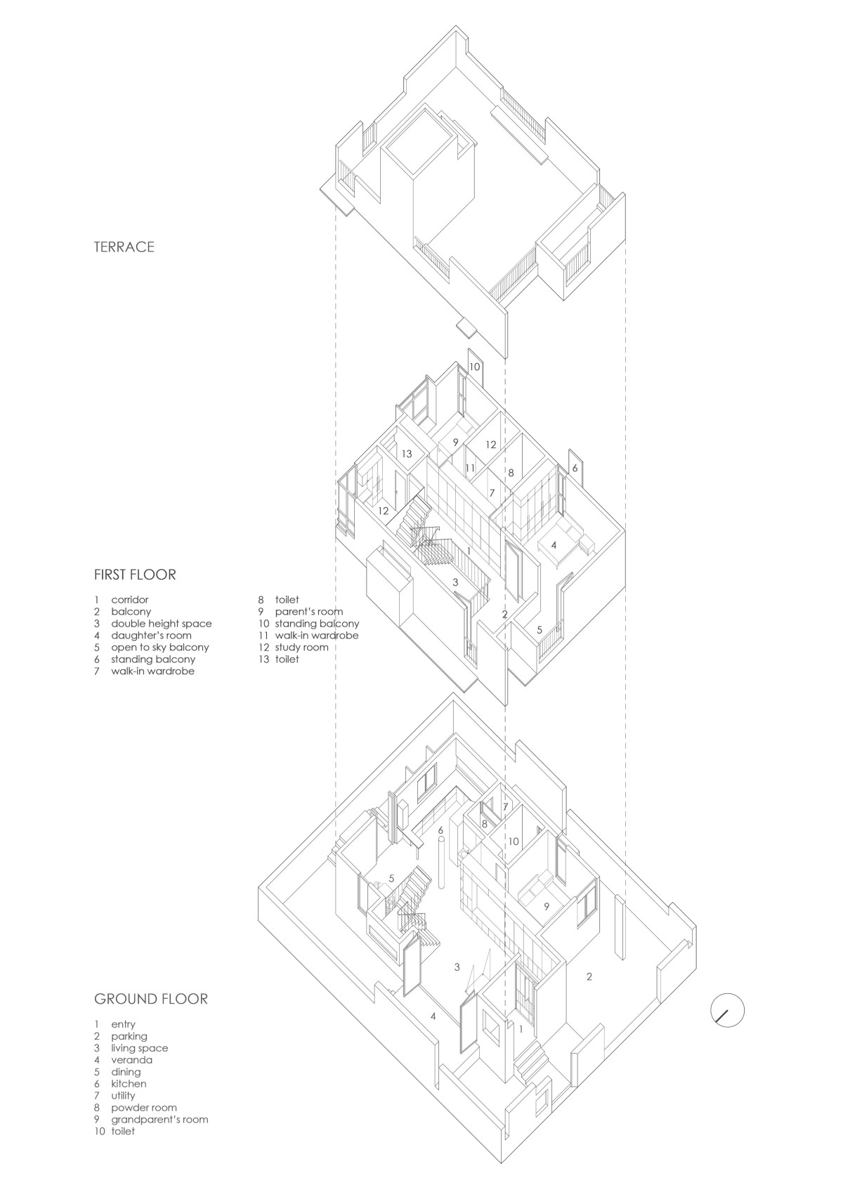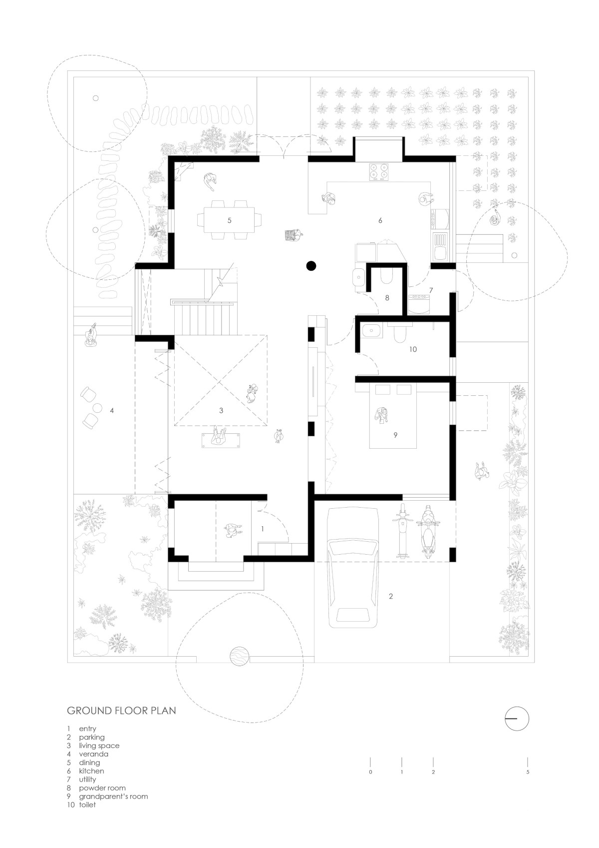 The ground floor features a double-height living area that flows into a veranda, blurring the boundary between indoors and outdoors. The staircase separates the open-plan dining and kitchen from the living area. The grandparents' bedroom is located in the southwest corner.