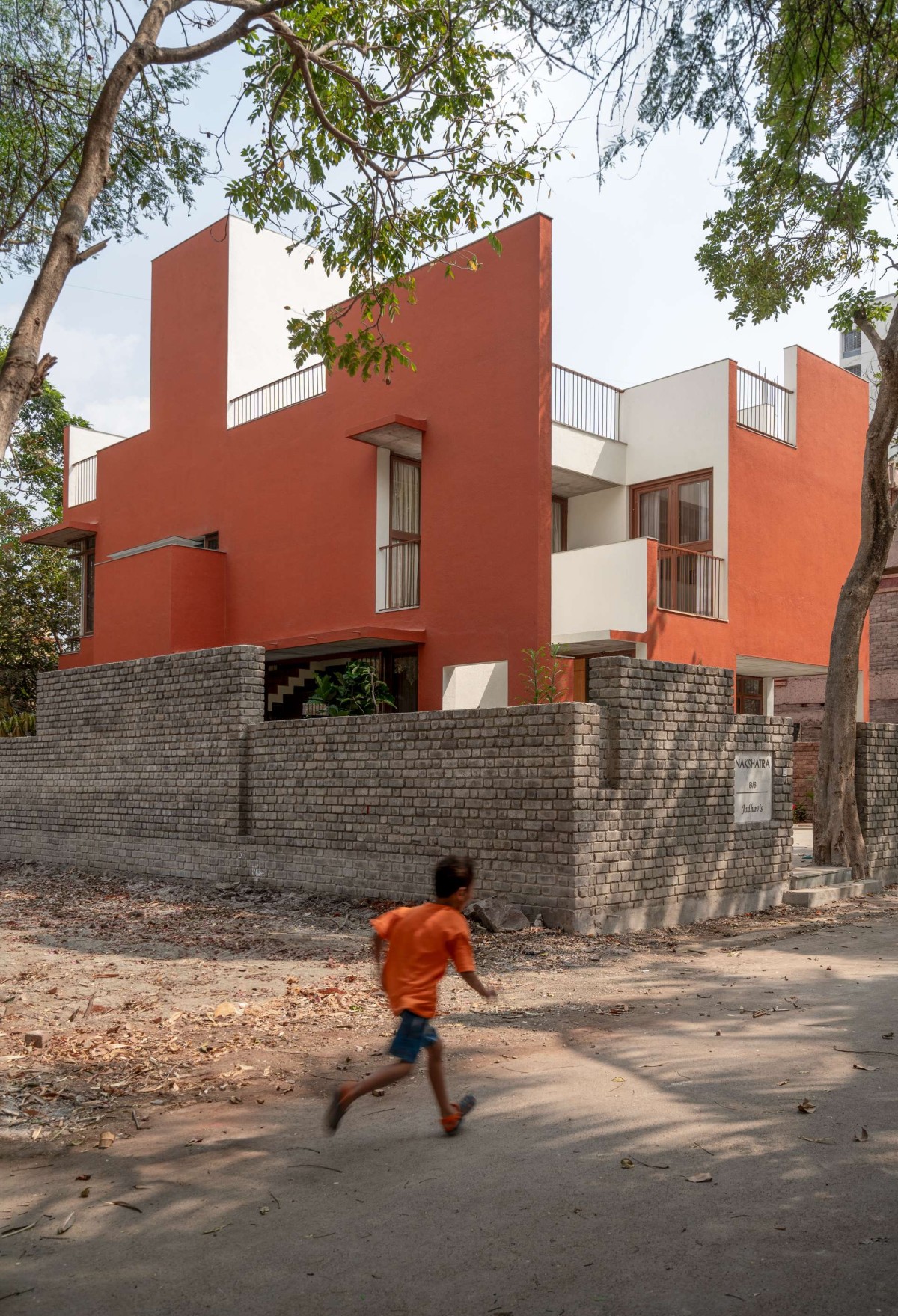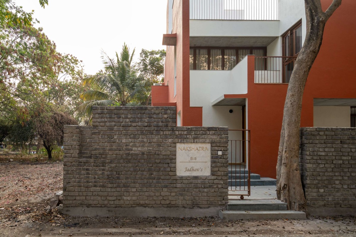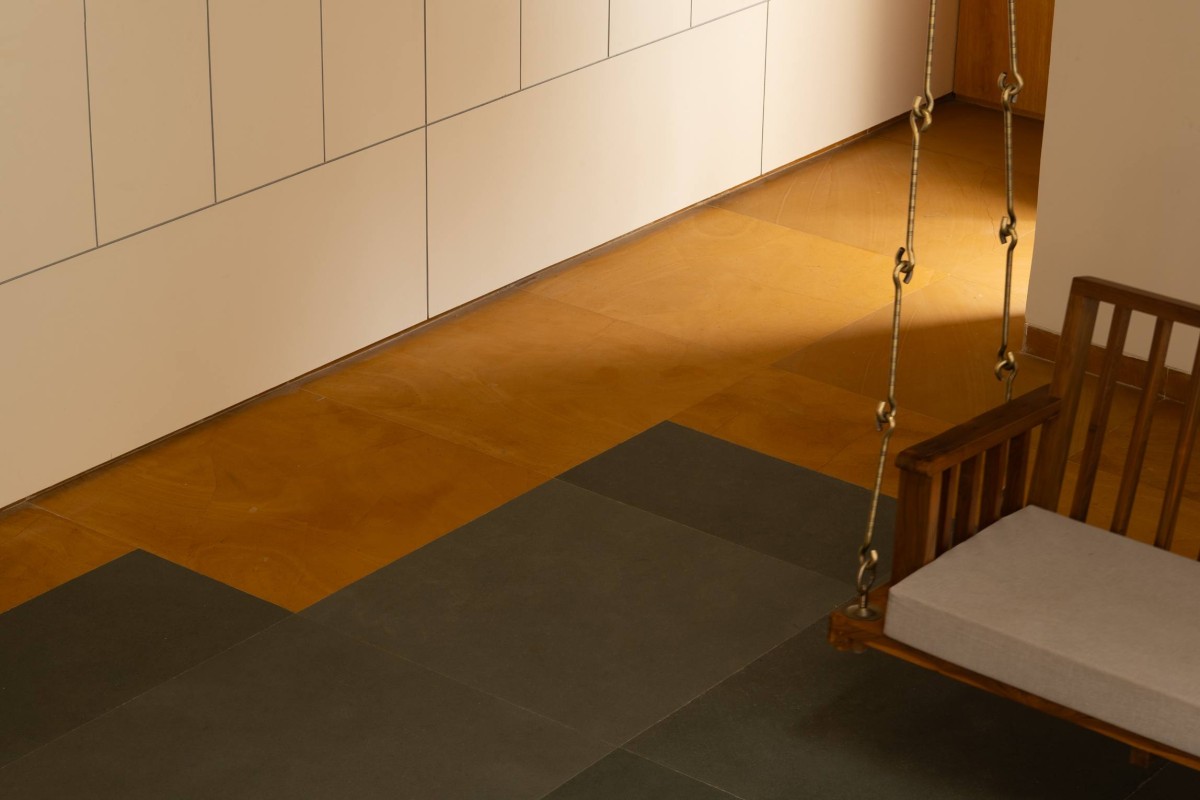 The building’s clay red exterior replicates the bright blooms of the African tulip tree. Further, the common areas are paved in Kota, transitioning to white Banswara in the bedrooms, with yellow Jaisalmer accents running throughout. The flooring design follows the building's form, creating a seamless flow. The ceiling remains in its raw concrete state, while minimalist carpentry in white, wood and pastel tones adds warmth, creating a cozy and inviting space.