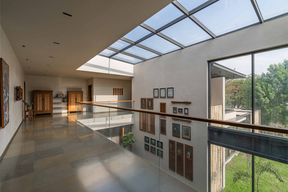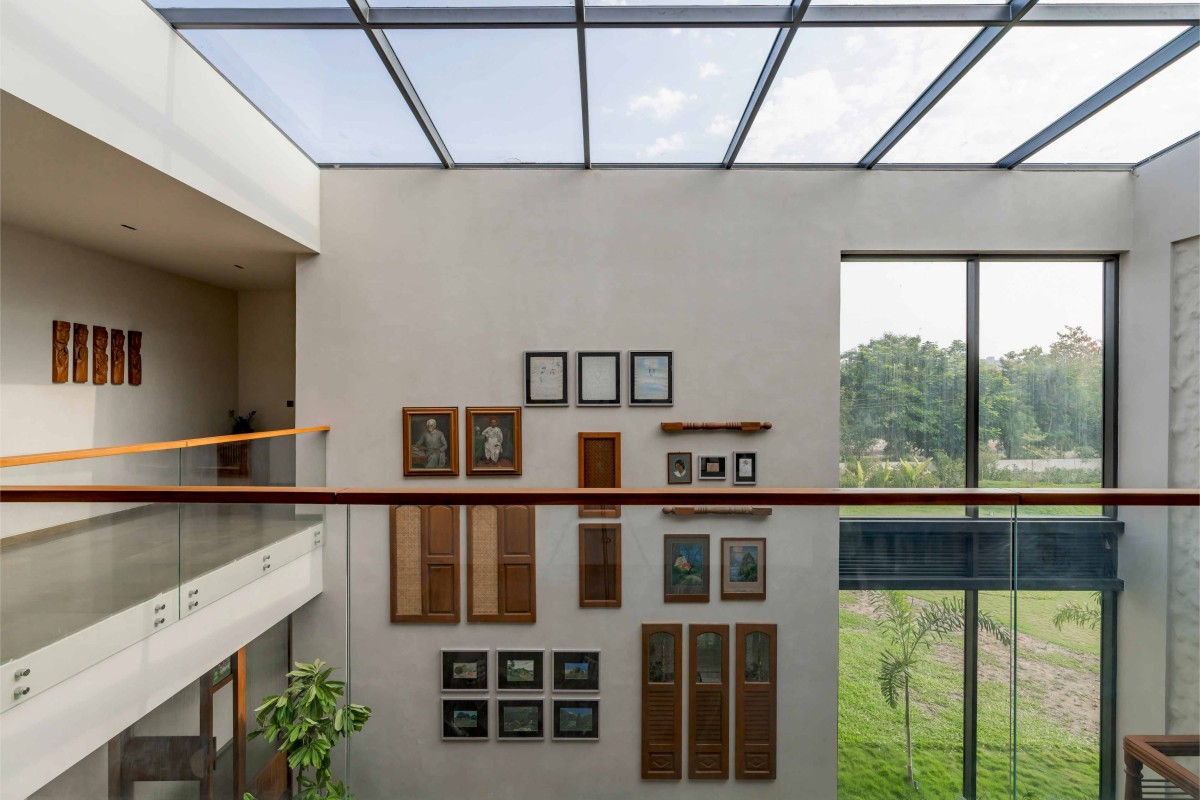 The orientation of the mansion is designed to reflect the vernacular aesthetics in the design. The massing is thoughtfully porous, opening to various landscapes in all directions. While the north and east facades enjoy a panoramic open lawn in front, the west faces an intimate backyard space. The harsh southern heat is mitigated by minimal openings while housing service areas. Response of any architecture to the site marks its ecological landmark. A northeast-facing massing was designed to take in ample natural light while mitigating the southern sun of Ahmedabad adding value to the built.