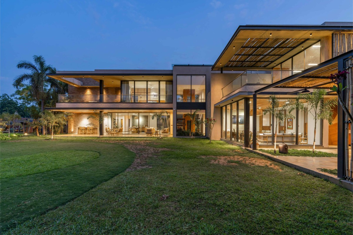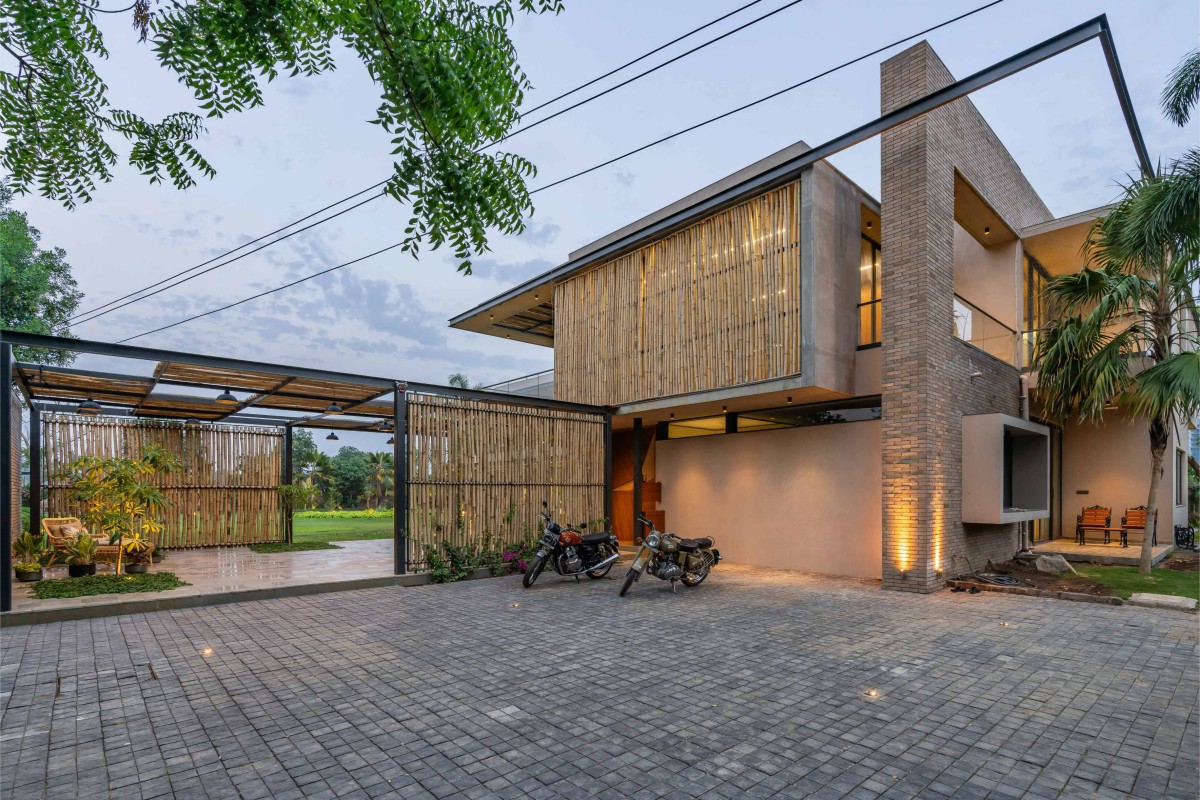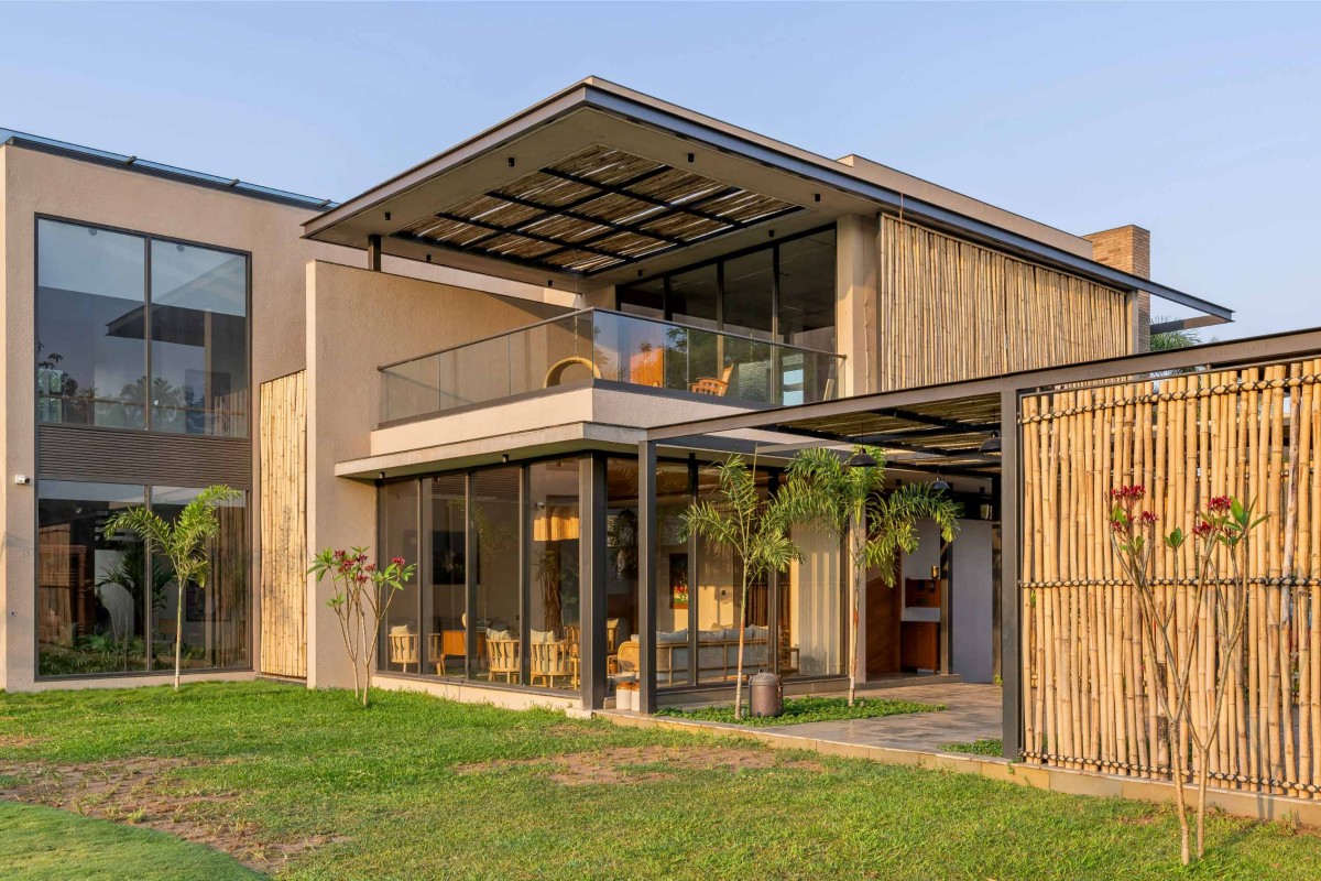 The house underlines creativity in a cost-effective and ecological design through reclamation and upcycling old wood into new furniture pieces. The overall materiality of this project portrays an earthy and unique aesthetic. It has modernity, with a touch of classicality. The major elevation is enhanced by the bamboo screen entrance and a flying girder, whereas the rest aesthetic is proclaimed by wood furniture, brick walls, and the landscape within. The interiors stand out by the cane and warm lighting with neutral plastered walls.