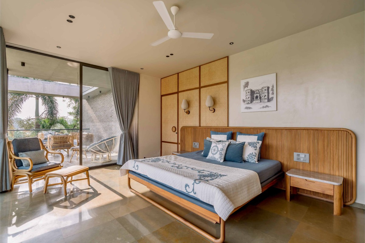 Other rooms include a master bedroom featuring a grand balcony and a children's room adorned with vibrant details contrasting with its subtle interiors. The children’s room gives splashes of green in otherwise subtle and earthy interiors.