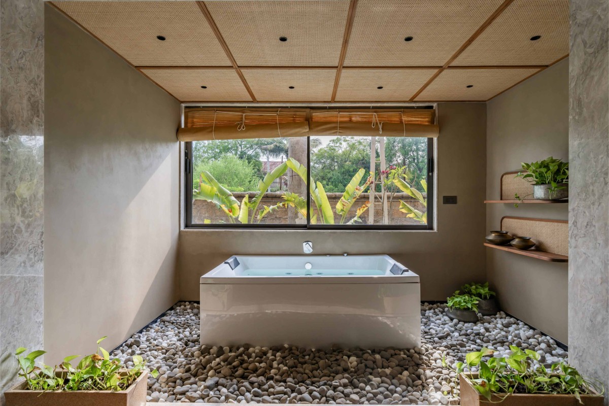 A bamboo canopy welcomes one to meander through the soothing entry plaza, with Kota stone flooring, that instantaneously evokes a breezy, homely feeling. The islanded trees create a childlike zeal directing one to the abode, while the altering bamboo screens fabricate ‘purdahs’ of privacy within. These bamboo trellises exhibit an excellent play of shadows with their visual display.