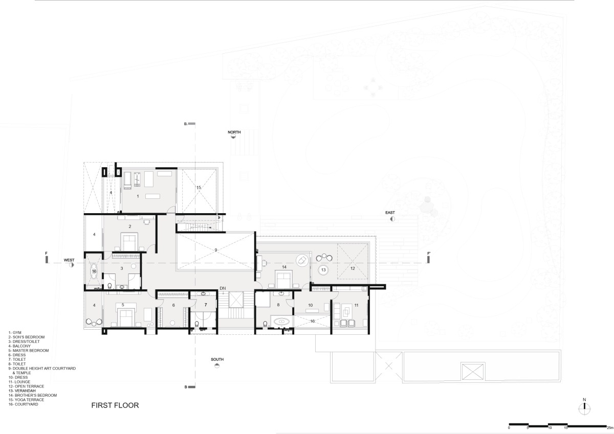 Ascending the stairway, the layout is designed to transition into more private areas, specifically the bedrooms nestled away from the main thoroughfare. The private bedroom, currently occupied by the client’s brother, opens onto a tranquil open terrace oriented towards the east. His bathroom opens in a pacific courtyard- a metaphor that this house is, it connects the landscape everywhere within.
