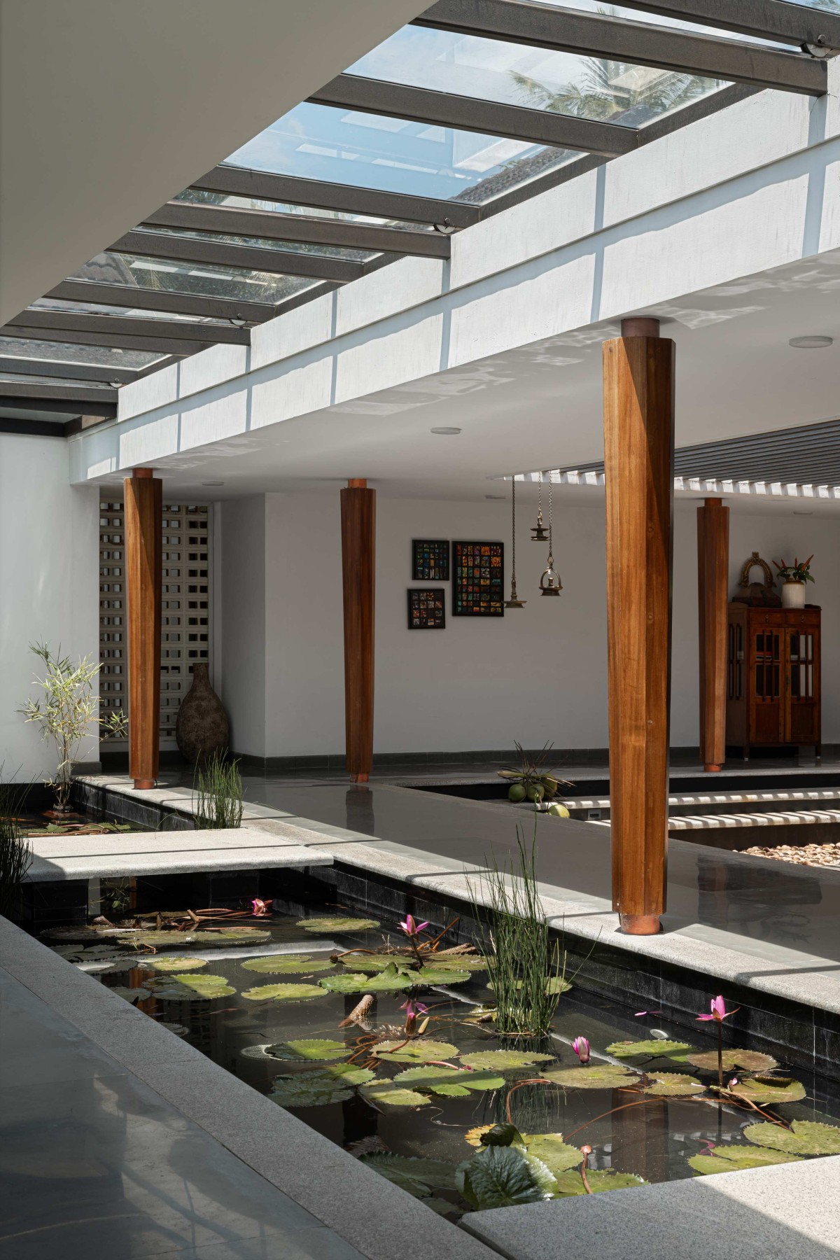 The project serves as a precedent for environmentally conscious architecture. Oriented to harness the natural wind flow, the home has an ingenious feature- a Jali wall. This perforated screen prioritises natural ventilation and lighting. Combined with the open layout, this element ensures that the interior remains comfortable even on the hottest days, significantly reducing the need for artificial cooling. Maximizing sunlight penetration, natural light floods the spaces throughout the day. The project demonstrates how modern homes can be both comfortable and sustainable, reducing their carbon footprint without compromising on livability. Furthermore, the singularly large 600 square feet Lily Pond assists in altering the home's microclimate and adding serenity to this already muted and calm abode.