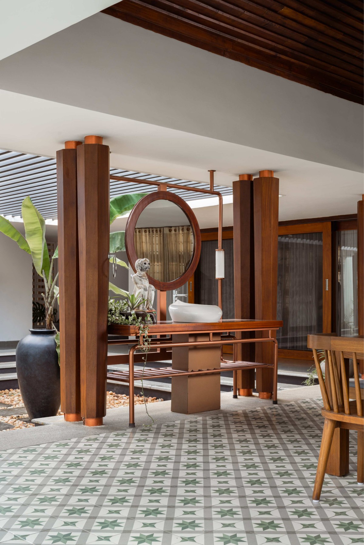 This home is a quintessential Kerala house layout – characterized by its sloping roofs, central courtyards, and extensive use of timber. Instead of confining living spaces within four walls, the intention was to create a fluid, open-plan layout where spaces seamlessly flow into one another, retaining the connection with nature. The intriguing interplay is created by juxtaposed volumes topped by pitched roofs around the central nucleus that is the courtyard, connected by corridors covered with a single flat roof.