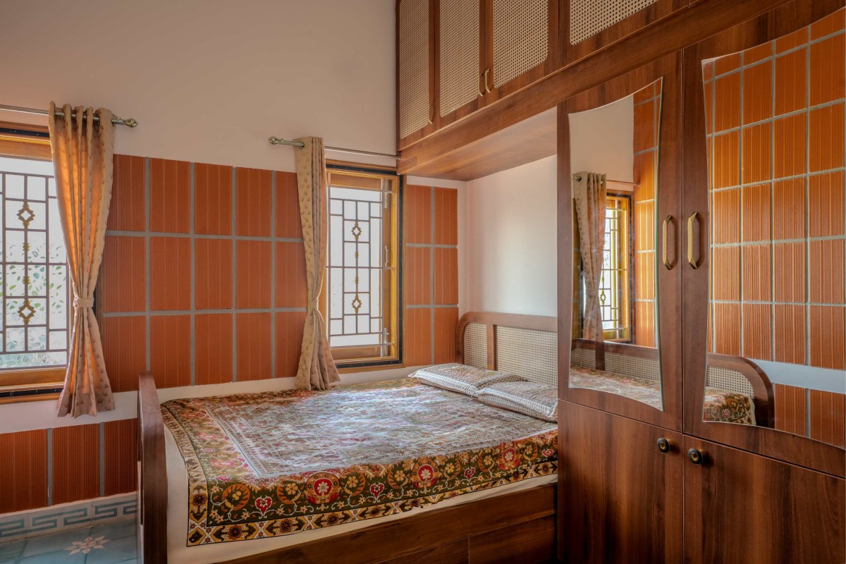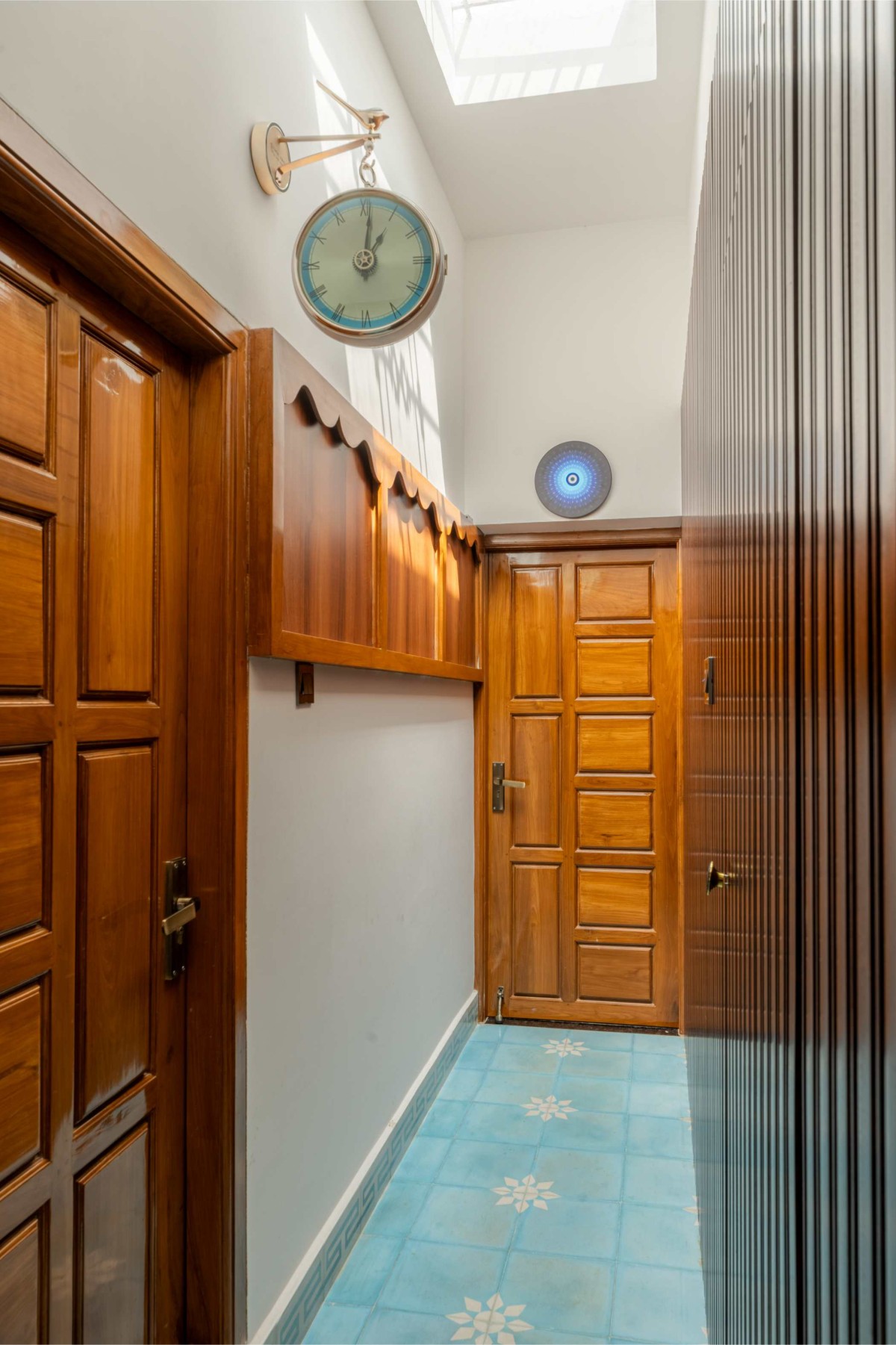The interiors draw inspiration from traditional Chettinad architecture, blending craftsmanship with contemporary living. Athangudi tile flooring sets the foundation, complemented by traditional columns and intricately carved beam-to-column joints. Brass and wooden décor elements further reinforce the heritage-inspired theme.